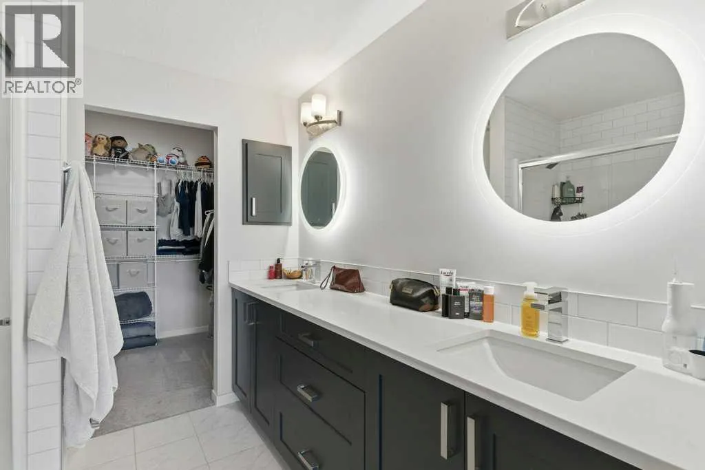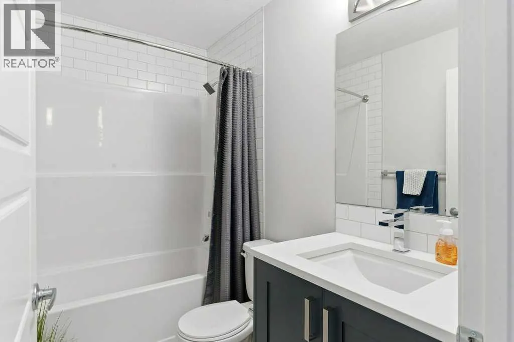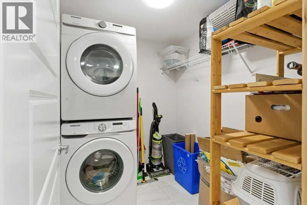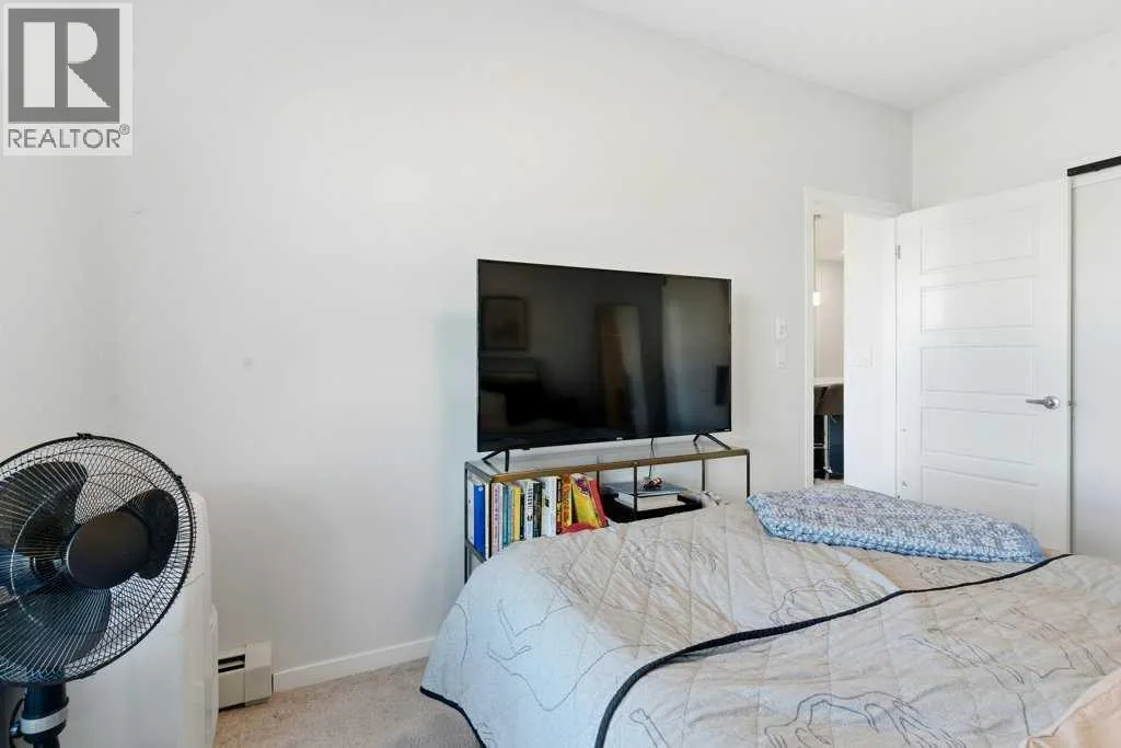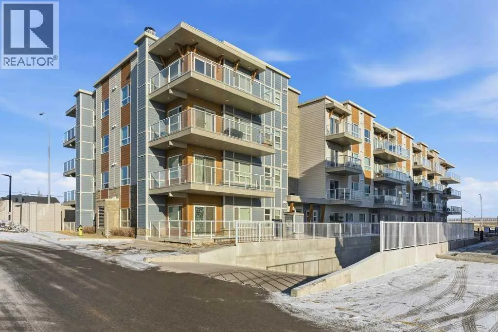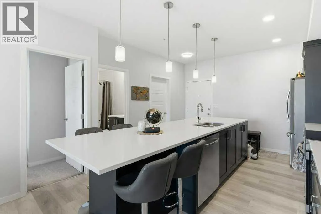 Experience elevated condo living at The Rise of Harvest Hills in this impeccably upgraded third-floor unit offering two bedrooms and two full bathrooms with a true show-suite feel. Flooded with natural light from expansive windows and enhanced by 9â ceilings, the open-concept layout is both airy and inviting. The designer kitchen features quartz countertops, a custom tile backsplash, two-tone white and deep blue cabinetry, premium stainless steel appliances including a fridge with ice and water, a large island, perfect for everyday living or entertaining. The primary bedroom is a private retreat with a walk-in closet and a spa-inspired ensuite showcasing illuminated vanity mirrors, while the second bedroom is ideally positioned next to a stylish four-piece bath with tub, making it perfect for guests or roommates. Enjoy the convenience of in-suite laundry with added storage, a large sunny balcony with gas line for BBQs, titled underground parking, and a secure, well-managed building. Located just steps from shopping, dining, parks, and pathways, with quick access to Deerfoot and Stoney Trail. Great for frequent travellers with quick access to the airport. This move-in-ready condo offers luxury, comfort, and unbeatable convenience in one of Calgaryâs most connected communities. (id:27476)