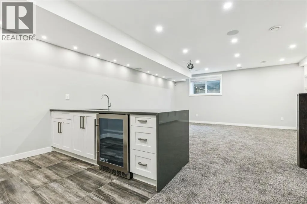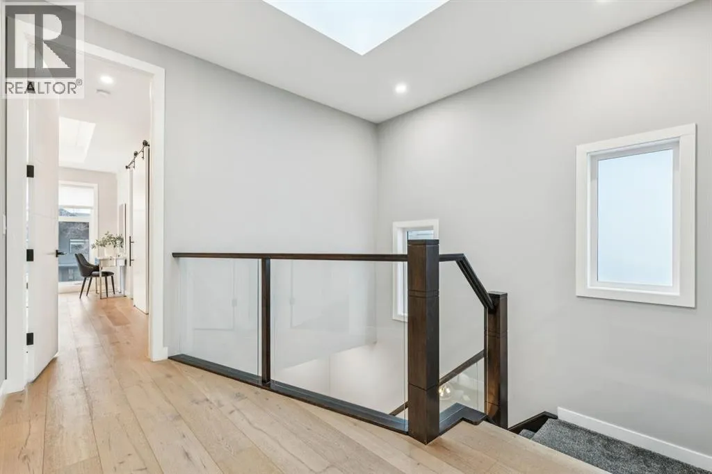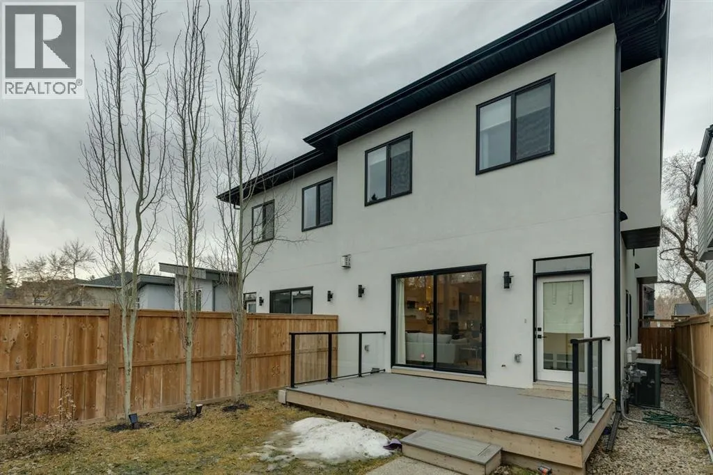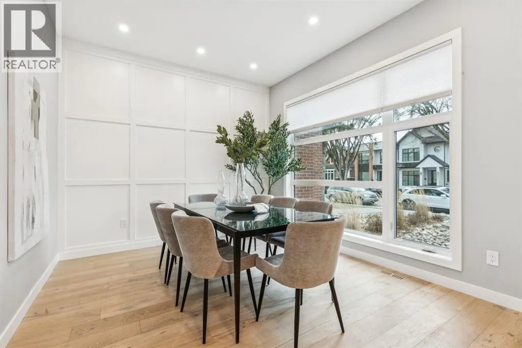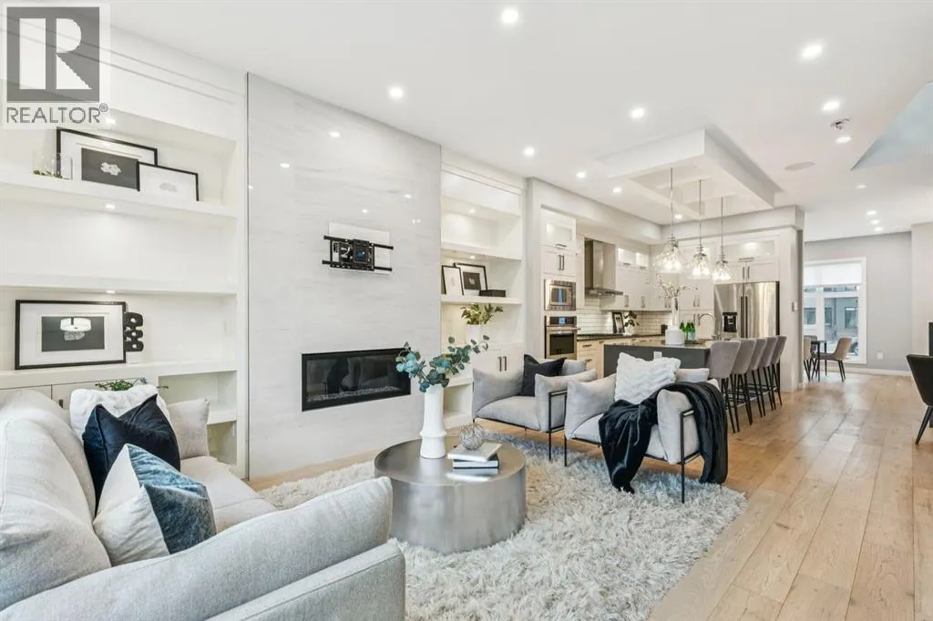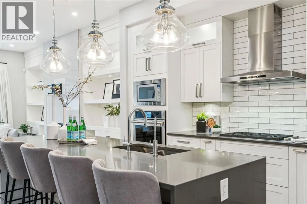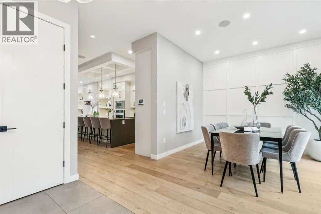 Proudly presenting this incredible family home ideally located in a welcoming, family friendly community just steps from Westmount Charter school, parks, and the Bow River pathway system. Offering over 2,700 sq ft of thoughtfully designed living space, this home blends modern luxury with everyday functionality. Stunning wide plank hardwood floors flow throughout the main and upper levels, while custom built-ins are seamlessly integrated throughout the home, adding both beauty and practical storage. The main floor is designed for connection with a beautifully panelled dining room, and centrally located chefâs kitchen ideal for gathering and entertaining. Highlights include white shaker cabinetry with glass accents, expansive waterfall quartz countertops, elegant pendant lighting, a high end Jenn-Air 6 burner gas cooktop and wall oven, and a premium kinetic water system. The inviting living area is showcases a sleek linear gas fireplace anchored by built-ins and a sliding glass door opens to a spacious composite deck, extending your area of entertainment. A tiled mudroom with built-in bench and abundant storage keeps daily life organized and stress free. Upstairs, natural light pours in through a large skylight, illuminating open riser stairs with glass railings and a bright second level that includes three generous bedrooms, a full bathroom with heated floors, and a convenient laundry room with sink. The primary retreat offers a peaceful escape with soaring ceilings, a large floor to ceiling picture window, custom walk-in closet, and a lavish ensuite featuring heated tile floors, a soaker tub, skylight, and tiled shower with bench and dual shower heads. The fully developed lower level is perfect for family movie nights and entertaining, featuring a large recreation room with built-in media wall, full bar with island seating and beverage fridge, a fourth bedroom, and a full bathroom. Additional lower level upgrades include rough-ins for Vacuflo, in-floor heating, and speakers. The backyard is thoughtfully designed for relaxation, with a large deck that flows into green space and leads to a double detached garage. Located close to Helicopter Park, Foothills Hospital, an off-leash dog park, and the Bow River Pathway system, this home offers an unbeatable lifestyle for families who value community, nature, and convenience. A prime opportunity to own a truly exceptional home in a welcoming neighbourhood, donât miss it. (id:27476)