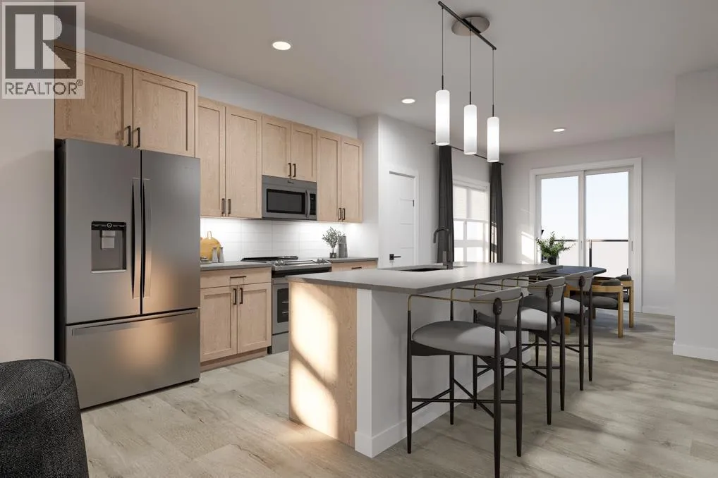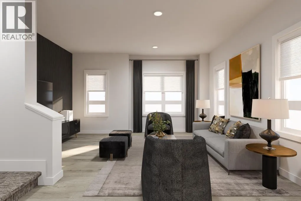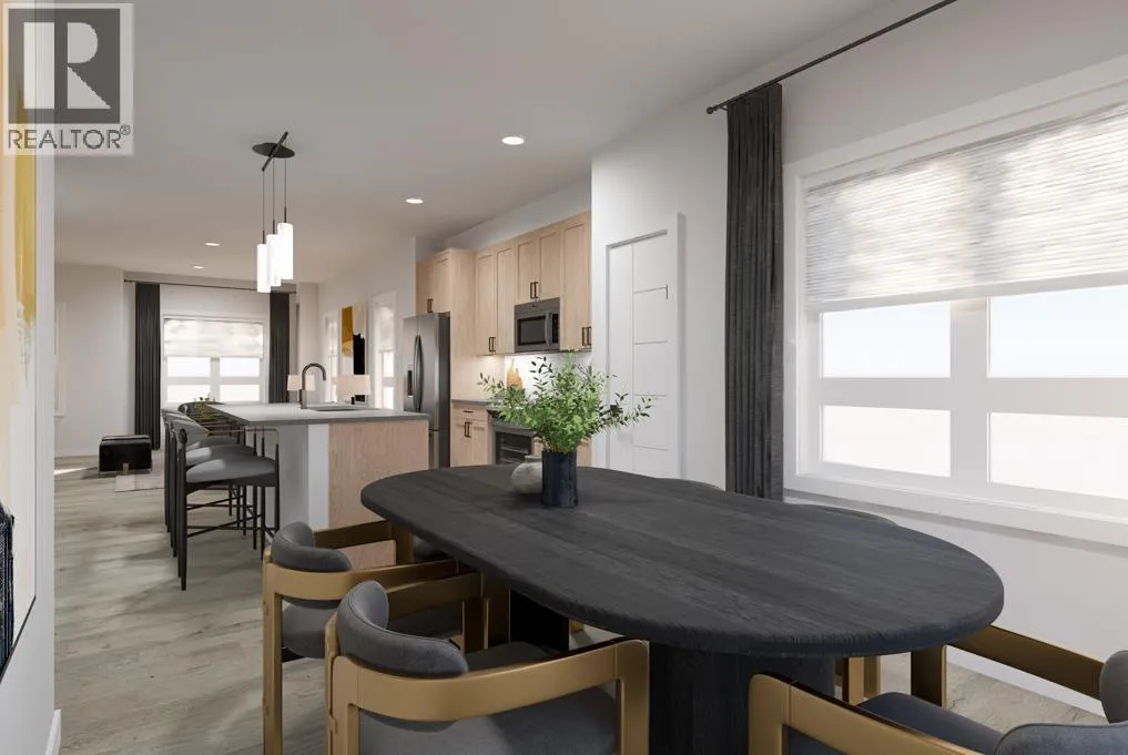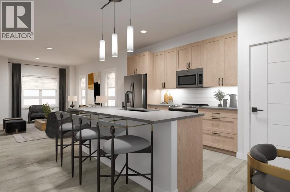 BEING AN END UNIT CHANGES EVERYTHING â and once youâve lived with it, thereâs no going back. MORE WINDOWS where you actually notice them. SUBTLE BUMP-OUTS that soften the edges of the space. Only one shared wall. The difference isnât theoretical â itâs felt. The main living level is organized with intention, not guesswork. The living room sits at the front of the home, anchored by END-UNIT WINDOWS that pull in EXTRA LIGHT and give the space real presence. The kitchen holds the centre, grounded by a BREAKFAST BAR ISLAND with space to prep, perch, eat, and linger, without turning the room into an obstacle course.At the back, the dining area opens directly to the PATIO, creating a natural extension of the space. From here, the view opens to COMMUNITY GREEN SPACE AND PATHWAYS, adding visual breathing room and an outdoor connection that makes the patio feel like a true part of daily life â not an afterthought.Upstairs, THREE BEDROOMS are arranged with clear hierarchy and smart separation. The primary sits at the back with its ensuite and walk-in closet, while the middle bedroom benefits directly from the end-unit position â a subtle bump-out and SIDE WINDOW that brings in natural light most interior units simply donât get. At the front, the third bedroom includes its own walk-in closet, quietly checking a few EXTRA boxes on the upper level.Down below, the same attention to practicality continues. The DOUBLE ATTACHED TANDEM GARAGE quietly does more than expected. Yes, it fits two vehicles â but it also absorbs the less glamorous parts of life. Bikes, bins, seasonal gear, and a dedicated UTILITY/STORAGE AREA that keeps the rest of the home feeling intentional instead of overrun. Itâs the kind of feature that doesnât shout, but dramatically improves day-to-day living.And then thereâs Rockland Park â not just as a backdrop, but as an active part of your routine. This is a community designed to pull you outside: pathway-connected streets, parks woven throughout, a R ESIDENTS-ONLY CLUBHOUSE WITH POOL AND AMENITIES, and easy access to nature without giving up city convenience. Walks feel purposeful. Errands feel closer. Add quick access to Crowchild and Stoney, and life stays connected without feeling busy.Itâs finished. ITâS AVAILABLE NOW. And it offers something thatâs hard to replicate later: an end-unit position in a community people are actively choosing for how it lives. If light, privacy, and a neighbourhood that genuinely adds to your day matter â THIS ONE DESERVES YOUR ATTENTION. ⢠PLEASE NOTE: Photos are VIRTUAL RENDERINGS of the same model â fit & finish may differ on final spec home. Interior selections & floorplans shown in photos. (id:27476)