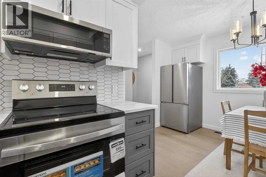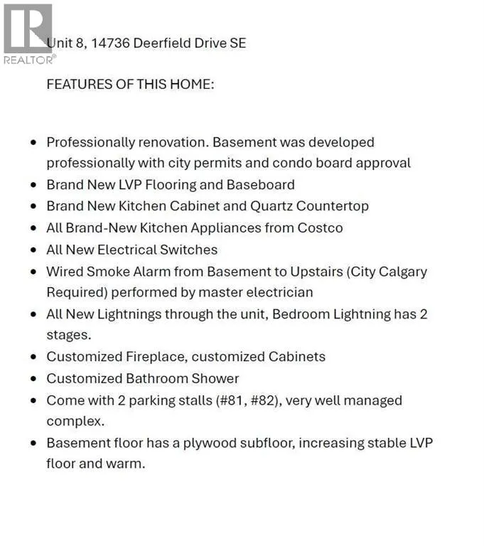 Welcome to Unit 8, 14736 Deerfield Drive SE, a fully renovated 3 bedroom 2 bathroom townhome in Deer Run community. This home has been professionally renovated, the basement was developed professionally with city permits and condo board approval. Floors are brand-new LVP and baseboard throughout the house. The kitchen has been fully renovated with brand new cabinets, stainless steel appliances from Costco, quartz countertop, modern white backsplashes, new electrical switches and lighting. The main floor also features a cozy living room with a custom wall-mounted electric fireplace, TV stand and lots of cabinets for your own décor and hiding everyday clutter. It has a sliding door opening to the deck and backyard providing abundant natural light to the home. Upstairs, youâll find three generously sized bedrooms and a full bathroom, perfect for families or guests. The fully developed basement expands your living options even further, offering additional space for a media room, fitness area, or playroomâwhatever suits your lifestyle best. There's a backwater valve in the basement. The basement floor has a plywood subfloor, increasing stable LVP floor and warm. Outside, the private fenced yard offers a quiet retreat for enjoying warm weather, gardening, or letting pets play safely. This unit also includes two assigned parking stalls, a valuable convenience rarely found in similar properties. The complex is well-managed and situated in a peaceful, family-friendly setting surrounded by mature trees and green space. Located just steps from Fish Creek Provincial Park, this home provides easy access to walking and biking trails, playgrounds, and natural beauty. Schools, shopping, restaurants, and major roadways are all close by, making this an ideal location for both relaxation and everyday convenience. Donât miss your chance to own this beautifully home in one of Calgaryâs most desirable communities. Book your private showing today and experience the quality and comfort fo r yourself. (id:27476)