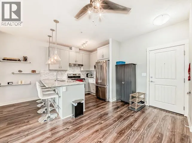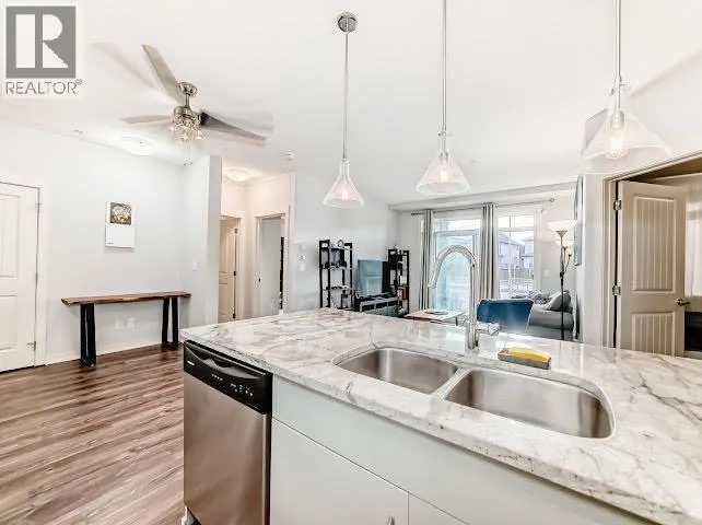 Welcome home to this beautiful apartment in the highly desirable area of Cranston. So many great features characterize this superior apartment: 2 bedrooms & 2 bathrooms, with each bedroom placed at the opposite side of the home for privacy! Primary bedroom has a walk-though closet and very nice full-ensuite bathroom with double sink vanity! Second bedoom is a great size for either a roomate or to turn into a home office. In-suite laundry with stacked washer & dryer so you don't have to leave home to do your laundry as well extra storage can be found there. Beautiful kitchen that boosts extra cupboard space with granite counters and a large breakfast bar, classy mini-tile backsplash, and gorgeous stainless steel appliances-all included with the home as well as full window coverings included. A sliding door leads to the large, over-sized patio facing to a green strip perfect to sit outside and enjoy the sunshine and bbq as well works great if you have a dog as personal access direct to the street and walking paths. Main floor unit with large windows with tons of natural light. Walk across the street to convenient local stores with more extensive shopping close by at Cranston Market and in nearby Seton. The secure, titled underground, heated, parking stall is very conveniently located close to stairway to the apartment and includes a generous storage unit as well. The whole complex is professionally managed and maintained in excellent condition. This super home is perfect for anyone that wants the condo lifestyle - no more snow shovelling, and all the exterior maintenance is done for you in this secure and safe apartment complex. This apartment is located on the ground floor of building 3000 offering quick access to the Bow River, Deerfoot Trail & the Stoney Trail ring road, Downtown is an easy commute and heading south out of town you are quickly in Okotoks, High River and the U.S. border beyond! Hurry - This classy apartment shows like new do not wait book your showi ng today! (id:27476)