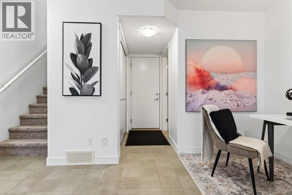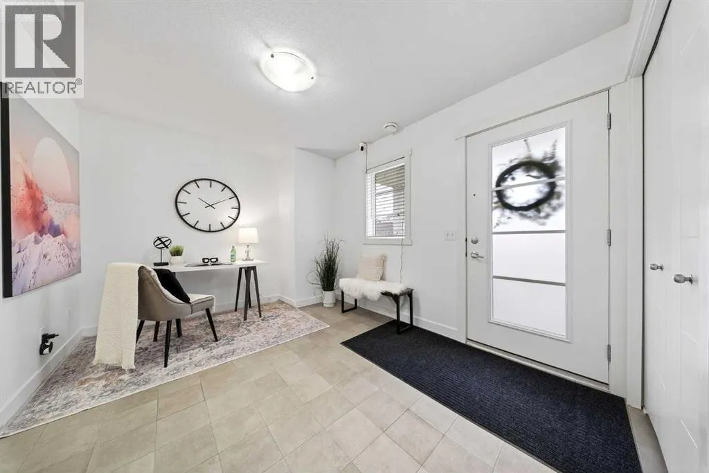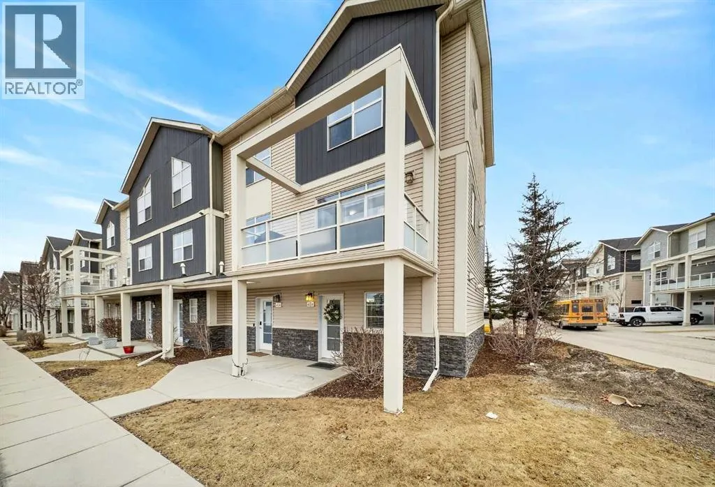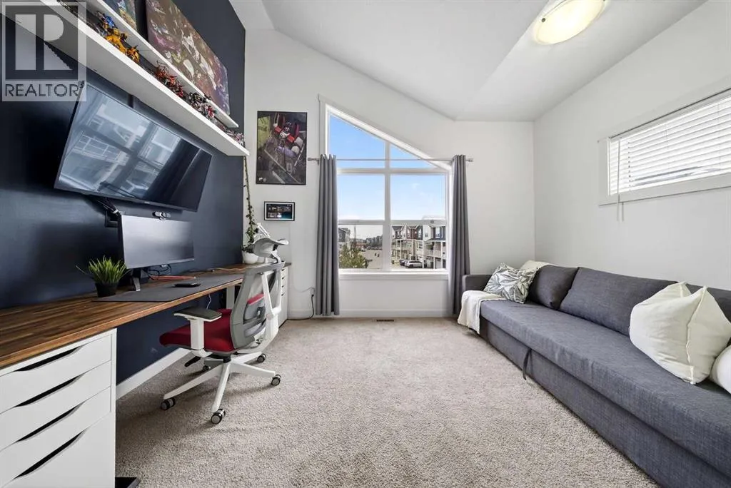 Offering 1,380 sq. ft., this bright END-UNIT townhouse in Redstone features 2 bedrooms, 2.5 bathrooms, a main-level office/den, and an extra-large single attached garage. Enjoy bright sunshine throughout, plus unobstructed mountain views from the second-floor balcony off the dining room and through the large windows in the primary bedroom. Added privacy bonus: no neighbours directly facing your front door.The ground level welcomes you with a spacious front entry and a versatile office/den or recreation space, along with a convenient 2-piece bathroom, an oversized attached heated garage with ample storage, built in desk & shelves, and enough room for a workbench.Upstairs, laminate flooring flows through the open-concept main level. The kitchen offers dark cabinetry, stainless steel appliances, and an extra-large island (ideal for casual seating and hosting), opening to a family-sized dining area with patio doors to the generous balcony with gas line for BBQâperfect for morning coffee with the views. The living room is anchored by a custom built feature wall/wall unit, creating a stylish and functional gathering space. Show home vibes.The upper level includes a primary bedroom with mountain views, a 4-piece ensuite, and double closets, plus a second spacious bedroom, walk in closet and another 4-piece bathroom. A dedicated laundry and storage room completes the layout. Close to parks, pathways, schools, transit, and major routes for commuting, this Redstone home delivers space, light, privacy, and views. (id:27476)