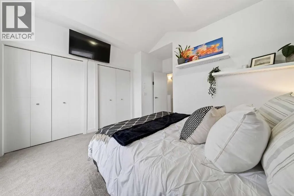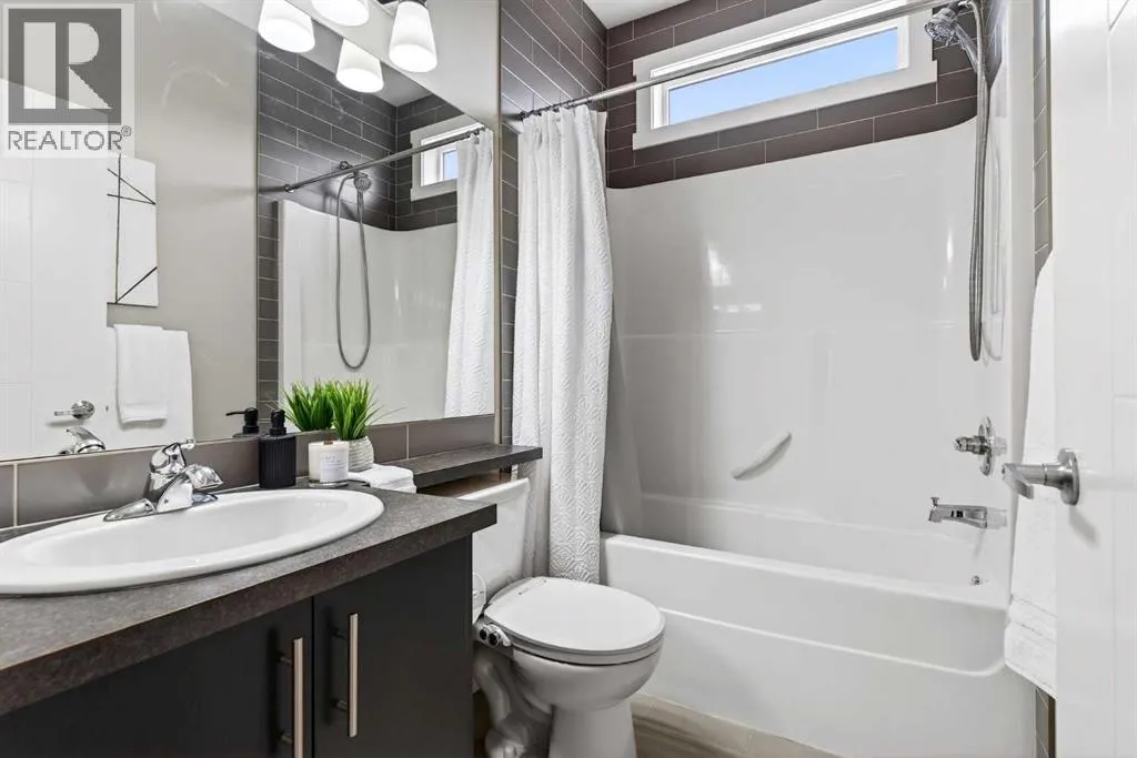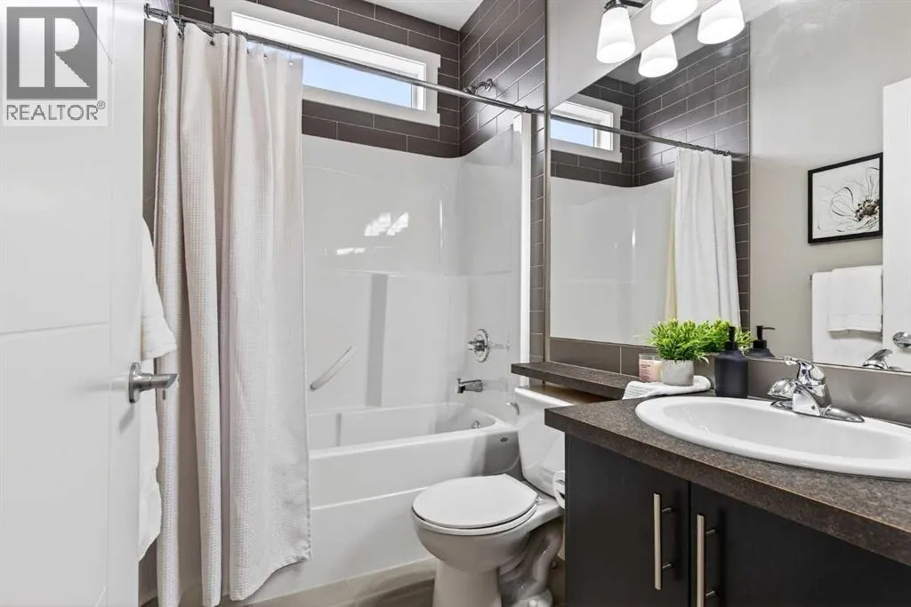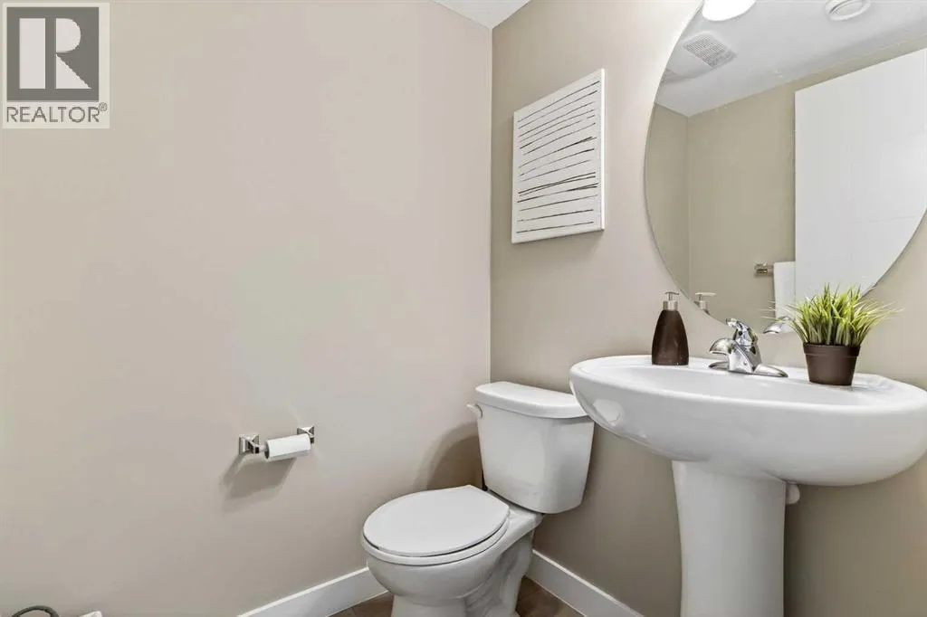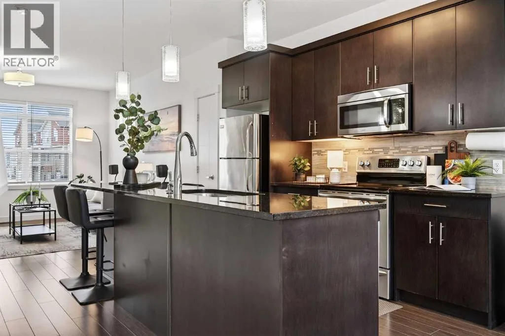 Offering 1,380 sq. ft., this bright END-UNIT townhouse in Redstone features 2 bedrooms, 2.5 bathrooms, a main-level office/den, and an extra-large single attached garage. Enjoy bright sunshine throughout, plus unobstructed mountain views from the second-floor balcony off the dining room and through the large windows in the primary bedroom. Added privacy bonus: no neighbours directly facing your front door.The ground level welcomes you with a spacious front entry and a versatile office/den or recreation space, along with a convenient 2-piece bathroom, an oversized attached heated garage with ample storage, built in desk & shelves, and enough room for a workbench.Upstairs, laminate flooring flows through the open-concept main level. The kitchen offers dark cabinetry, stainless steel appliances, and an extra-large island (ideal for casual seating and hosting), opening to a family-sized dining area with patio doors to the generous balcony with gas line for BBQâperfect for morning coffee with the views. The living room is anchored by a custom built feature wall/wall unit, creating a stylish and functional gathering space. Show home vibes.The upper level includes a primary bedroom with mountain views, a 4-piece ensuite, and double closets, plus a second spacious bedroom, walk in closet and another 4-piece bathroom. A dedicated laundry and storage room completes the layout. Close to parks, pathways, schools, transit, and major routes for commuting, this Redstone home delivers space, light, privacy, and views. (id:27476)