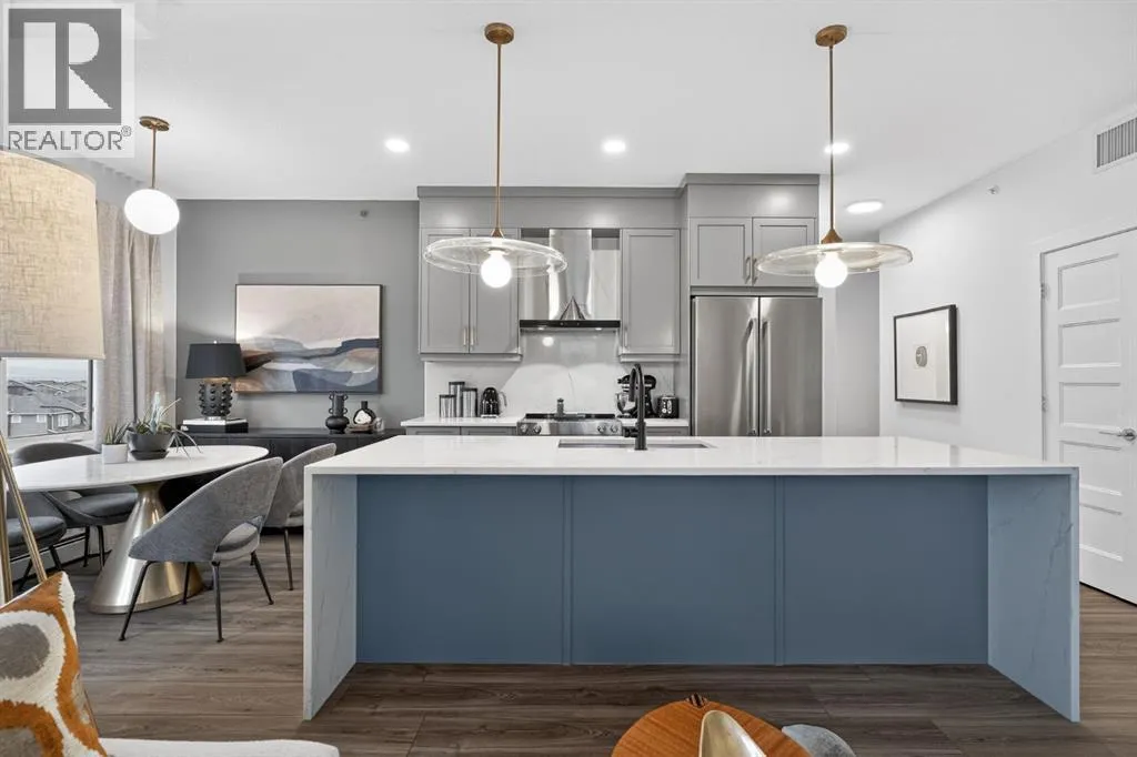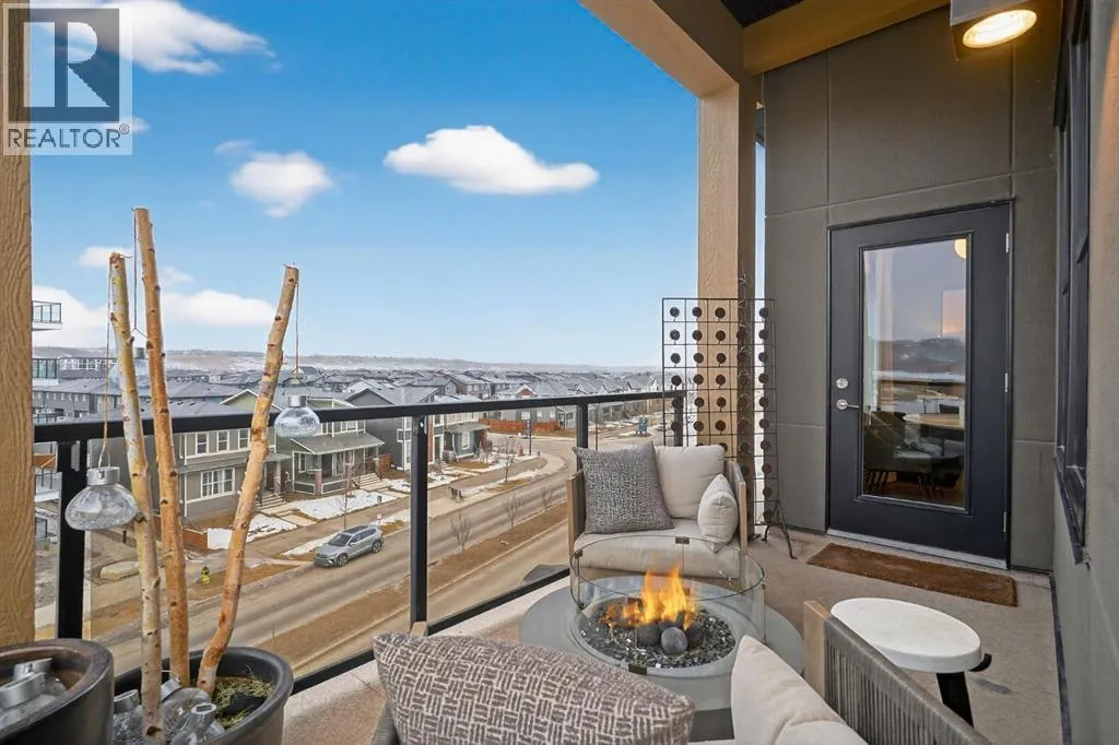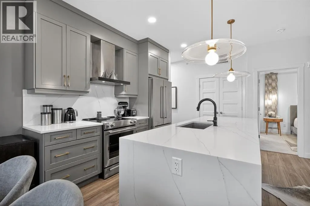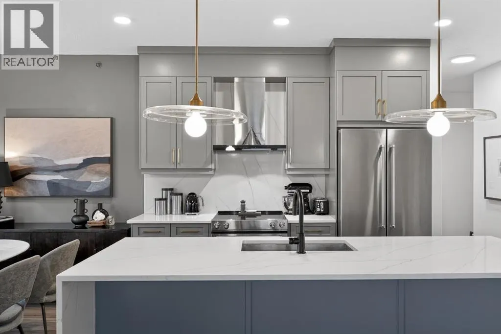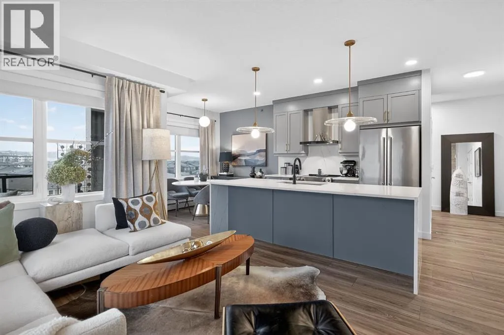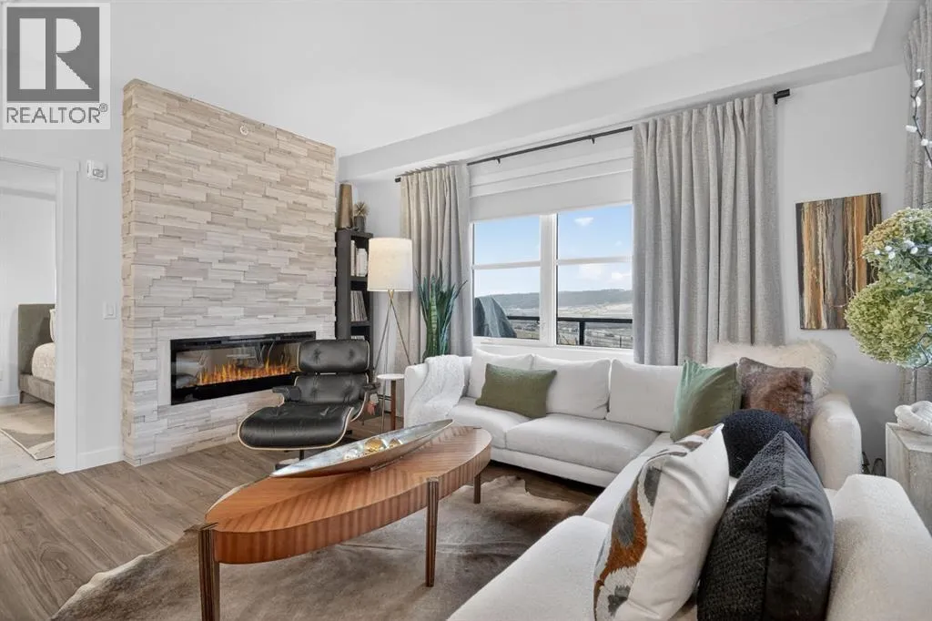 RARE TOP-FLOOR SW CORNER RESIDENCE WITH WRAP-AROUND BALCONY IN BOW360Perched on the top floor of BOW360, this southwest corner home offers elevated living with over $47,000 in builder upgrades, expansive natural light, and one of the most desirable layouts in the building. With no neighbours above and windows on two sides, this residence delivers privacy, sunshine, and a true sense of space that is rarely available in condo living.From the moment you step inside, the difference is clear. The entry has been thoughtfully redesigned to create an impressive, oversized foyer, a feature that immediately sets this home apart. The open-concept living space is bright and refined, anchored by a stunning travertine-wrapped fireplace that adds warmth and architectural sophistication.The kitchen was designed to impress, featuring a dramatic waterfall quartz island, stainless steel appliances, upgraded cabinetry, and elevated designer finishes throughout. Whether entertaining or enjoying a quiet evening at home, the space feels modern, intentional, and effortlessly stylish.The wrap-around southwest-facing balcony extends your living space outdoors, offering open sky views and sunlight throughout the afternoon and evening, perfect for summer evenings and year-round enjoyment.The primary suite provides a private retreat with a walk-through closet and beautifully finished four-piece ensuite. A spacious second bedroom and full bath offer flexibility for guests, a home office, or shared living.Titled underground parking and secure storage add convenience, while condo fees that include heat, water, and gas provide exceptional value.Steps to the Bow River pathways, parks, golf, and off-leash areas, this is an opportunity to own one of the best-positioned and most upgraded homes in BOW360. (id:27476)
