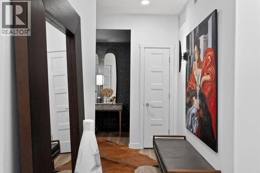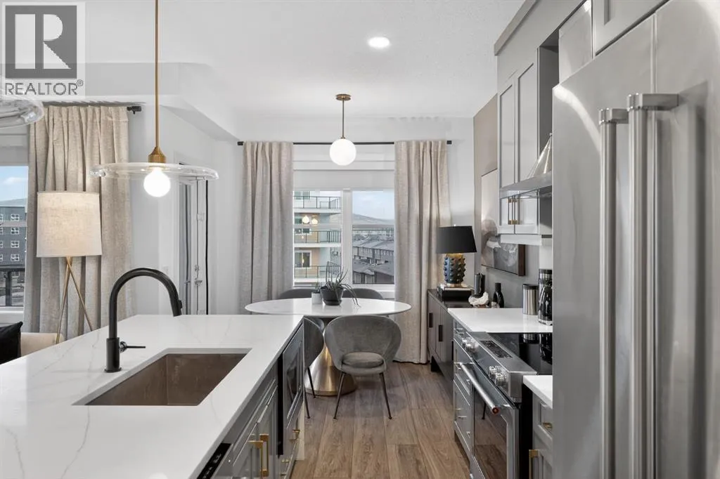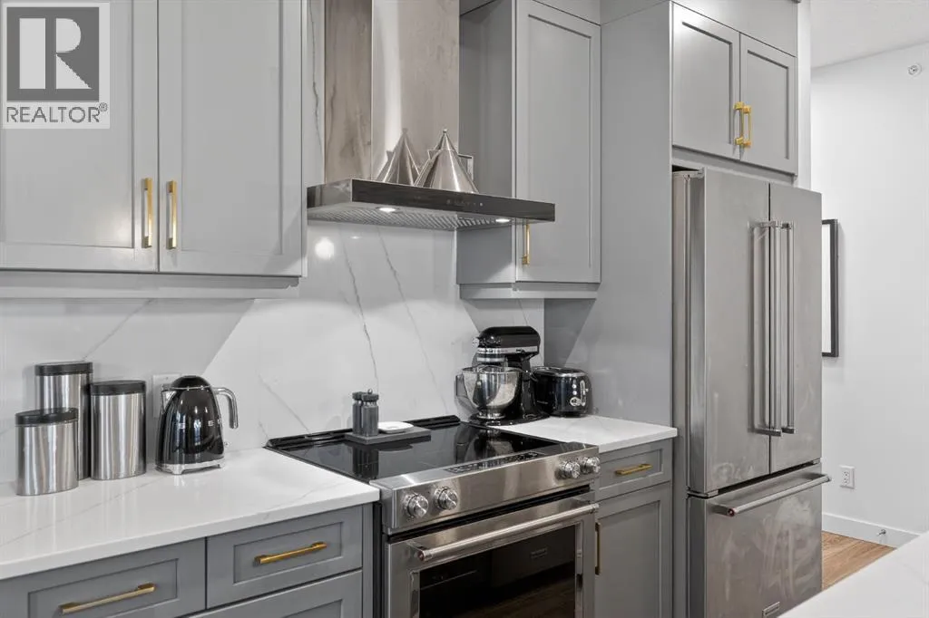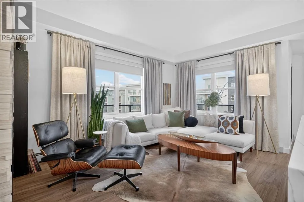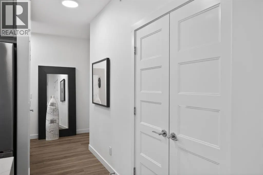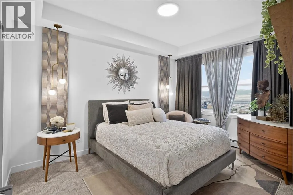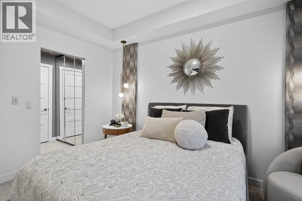 RARE TOP-FLOOR SW CORNER RESIDENCE WITH WRAP-AROUND BALCONY IN BOW360Perched on the top floor of BOW360, this southwest corner home offers elevated living with over $47,000 in builder upgrades, expansive natural light, and one of the most desirable layouts in the building. With no neighbours above and windows on two sides, this residence delivers privacy, sunshine, and a true sense of space that is rarely available in condo living.From the moment you step inside, the difference is clear. The entry has been thoughtfully redesigned to create an impressive, oversized foyer, a feature that immediately sets this home apart. The open-concept living space is bright and refined, anchored by a stunning travertine-wrapped fireplace that adds warmth and architectural sophistication.The kitchen was designed to impress, featuring a dramatic waterfall quartz island, stainless steel appliances, upgraded cabinetry, and elevated designer finishes throughout. Whether entertaining or enjoying a quiet evening at home, the space feels modern, intentional, and effortlessly stylish.The wrap-around southwest-facing balcony extends your living space outdoors, offering open sky views and sunlight throughout the afternoon and evening, perfect for summer evenings and year-round enjoyment.The primary suite provides a private retreat with a walk-through closet and beautifully finished four-piece ensuite. A spacious second bedroom and full bath offer flexibility for guests, a home office, or shared living.Titled underground parking and secure storage add convenience, while condo fees that include heat, water, and gas provide exceptional value.Steps to the Bow River pathways, parks, golf, and off-leash areas, this is an opportunity to own one of the best-positioned and most upgraded homes in BOW360. (id:27476)