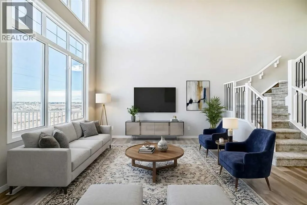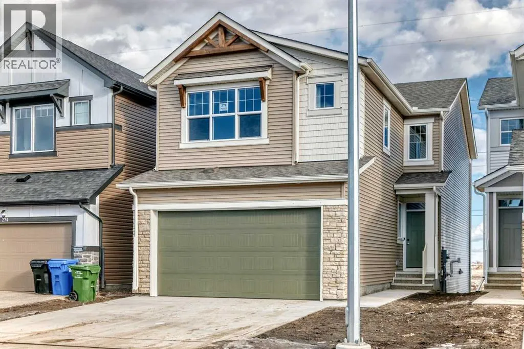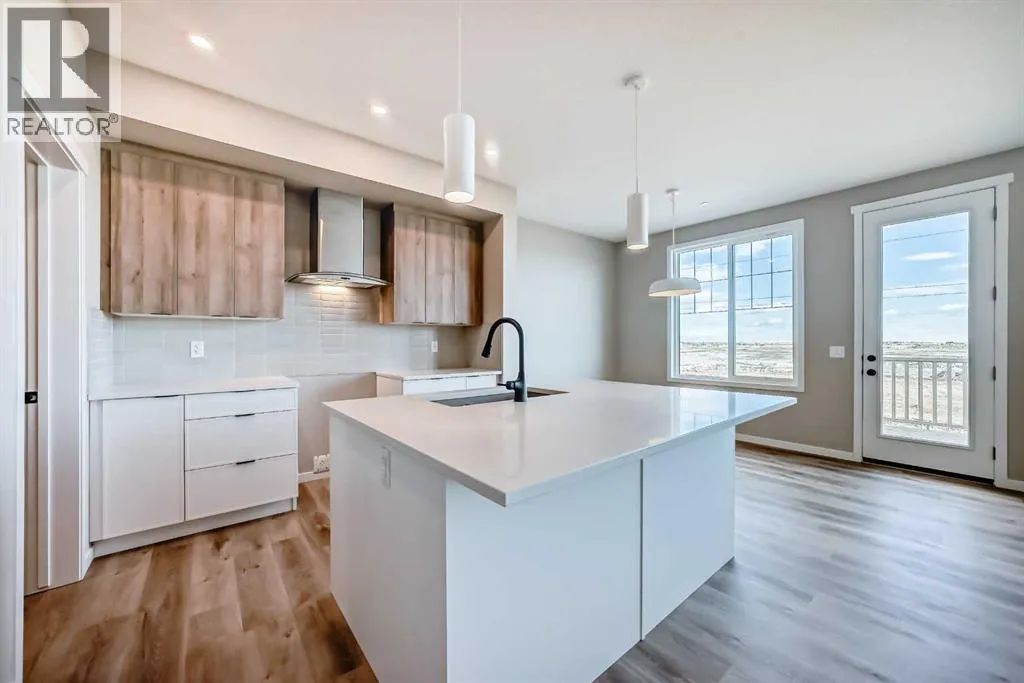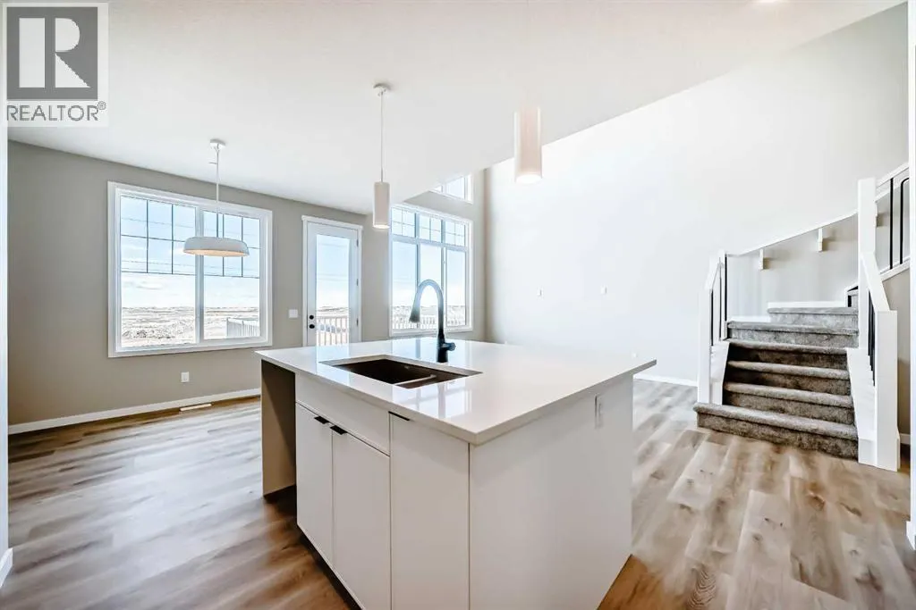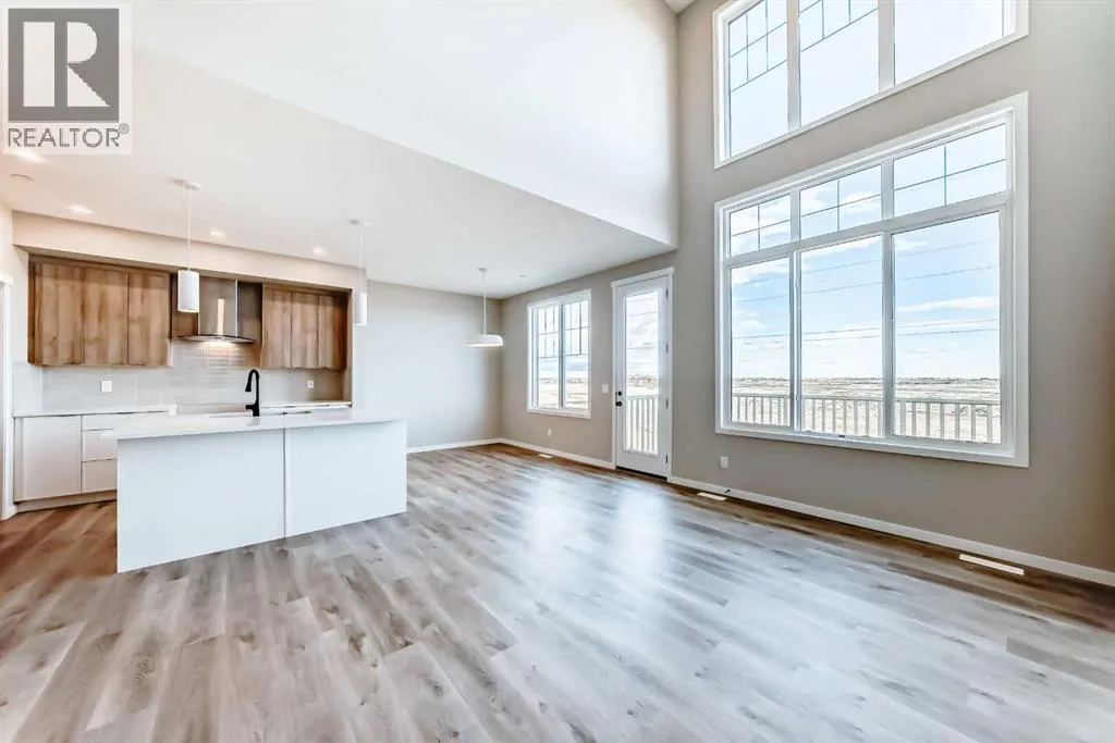 Welcome to the âGradaâ by Hopewell Residentialâwhere contemporary design meets family-friendly functionality in the vibrant community of Hotchkiss. This beautifully crafted home spans 2,112 sq. ft. and offers 3 spacious bedrooms with a layout designed to make everyday life feel easier, brighter, and more connected. Step inside and youâll immediately feel how the main floor is built for real life. Just off the entry, a versatile flex space with a glass insert door is perfect for a home office, playroom, homework zone, or quiet retreat. The heart of the home opens up into an inviting dining area and lifestyle room that flow effortlessly for both daily routines and entertaining. The soaring open-to-above living room adds a wow factor with an airy, light-filled feel, and large windows keep the space feeling fresh from morning to evening. At the center of it all, the kitchen is designed to impress and perform. Youâll love the upgraded layout with a stylish chimney-style hood fan, built-in microwave, extra storage drawers, elegant quartz countertops, and a large island that anchors the space for casual meals, coffee catch-ups, or hosting friends. The two-tone cabinetry is a standout feature, with wood grain upper cabinets extended to the bulkhead and crisp white lower cabinets, paired with a classic subway tile backsplash for a clean, timeless look. Thoughtful upgrades continue with black interior hardware and knockdown ceiling textures, adding a modern edge throughout. The entertainment potential extends outdoors with a walkout lot and a generous 15â x 10â deckâperfect for summer dinners, morning coffee, or relaxing at the end of the day. An exterior gas line is already in place for a future BBQ, making it easy to enjoy Calgaryâs long warm evenings. Upstairs, youâll find three spacious bedrooms, including a luxurious primary suite featuring a step-in showerâyour own private retreat. The additional bedrooms are the perfect size for the growing family and served by a beaut iful full bathroom, while the upper-floor laundry room is perfectly placed to keep day-to-day life running smoothly. Downstairs, the walkout basement is ready for your future plans with a 9-foot foundation, offering the opportunity for added living space or a potential mortgage-helper suite (a secondary suite would be subject to approval and permitting by the city/municipality). Located in southeast Calgary, Hotchkiss offers stunning mountain views, 51 acres of park space, walking pathways, and a beautiful central wetland. Designed with families in mind, this community delivers the green space, connectivity, and lifestyle that make it easy to settle in and feel at home. Discover the next chapter of your life with The Grada. (id:27476)