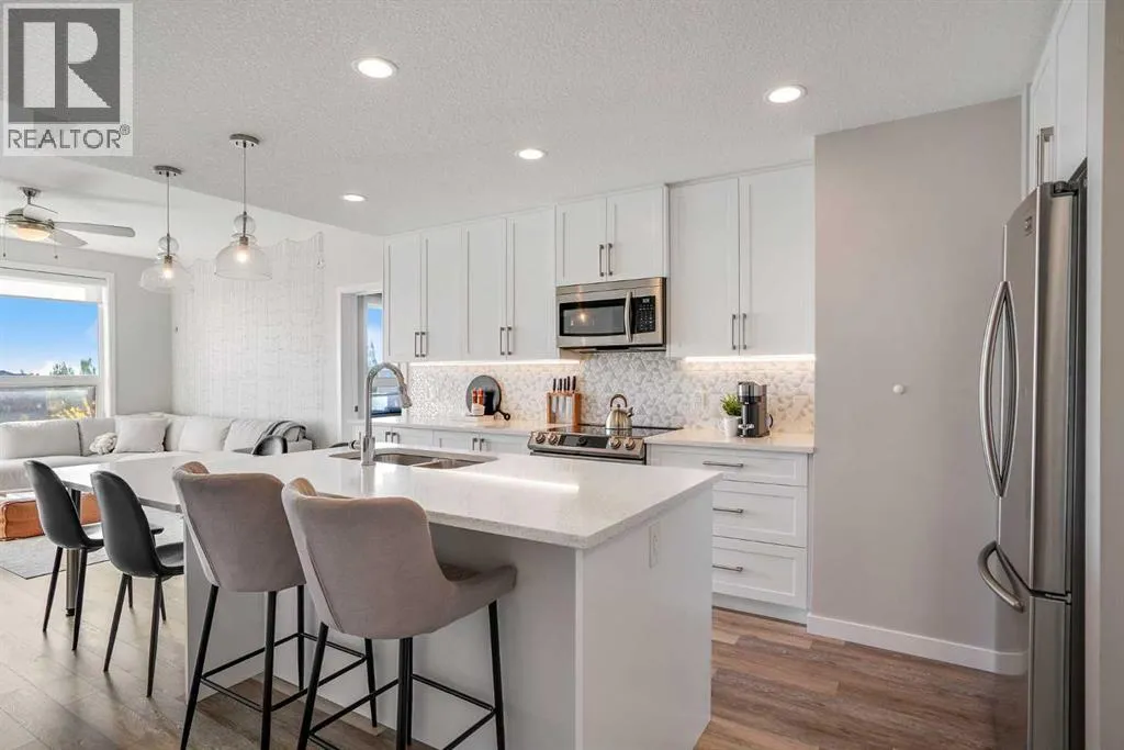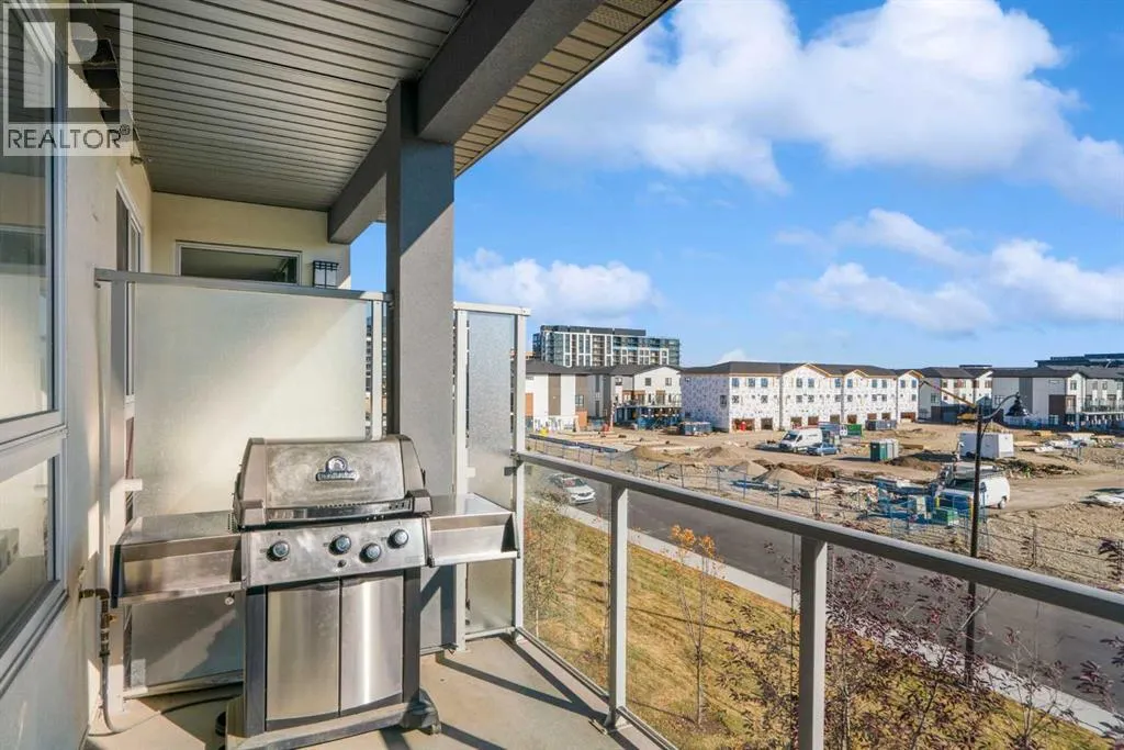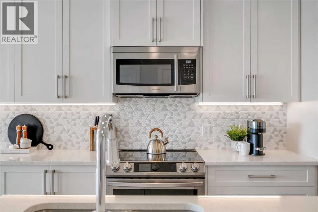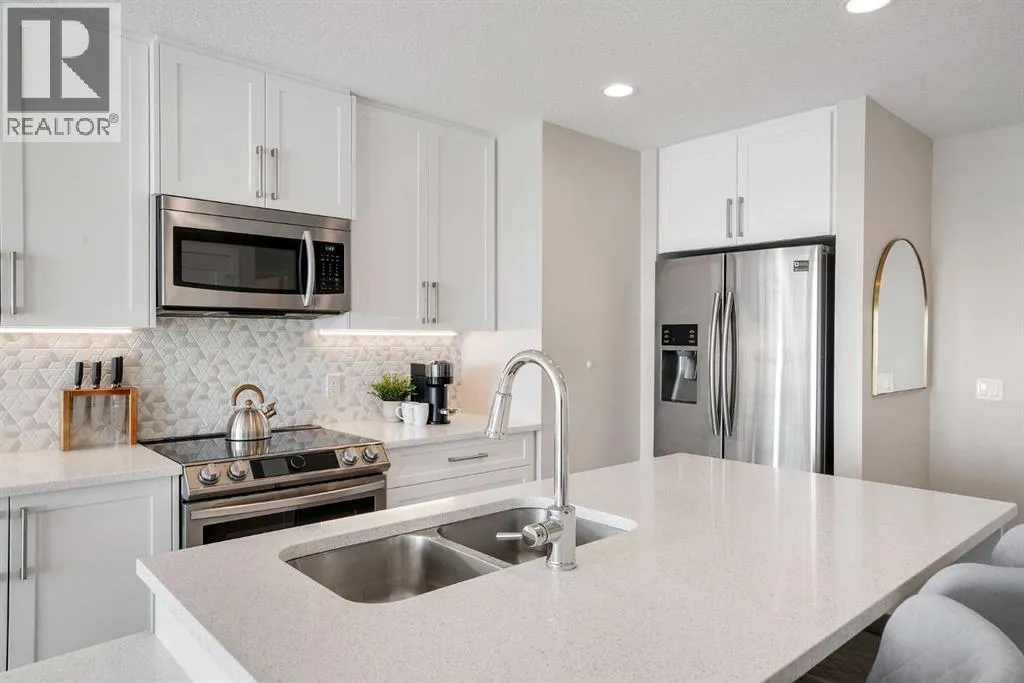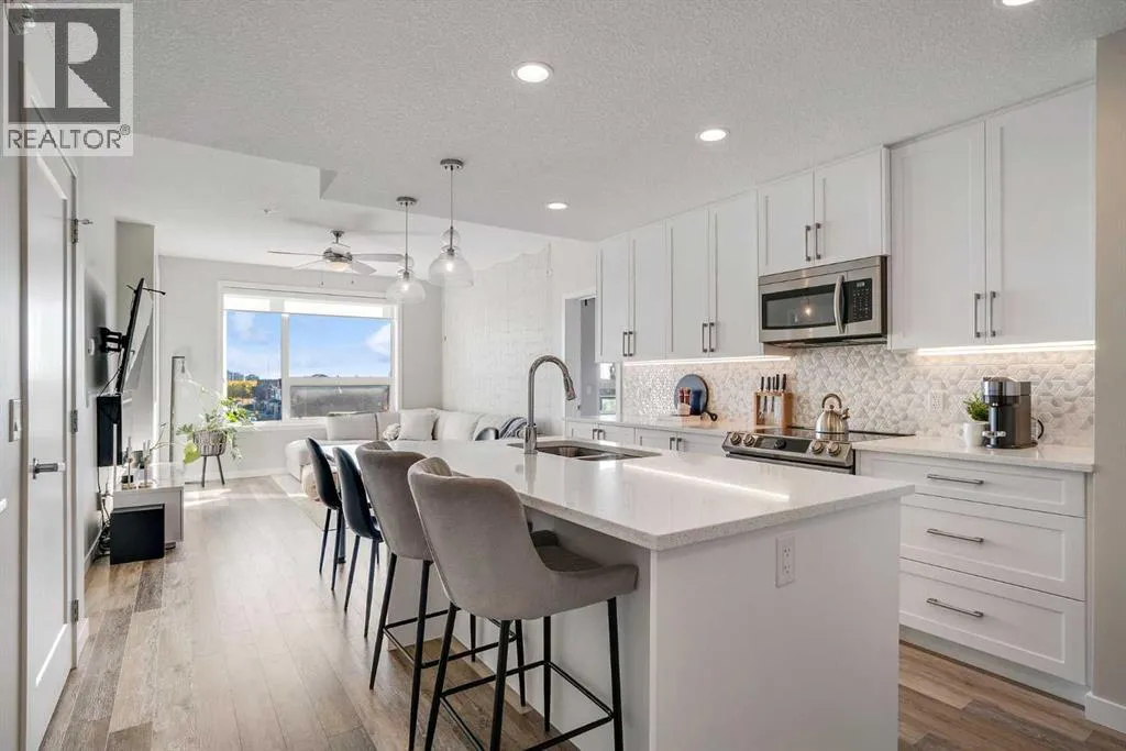 Welcome to Vivace North, where modern design meets effortless everyday living in the heart of West Springs. This beautifully upgraded 2-bedroom, 2-bathroom condo blends style and functionality, creating a home that feels as sophisticated as it is comfortable. The chef-inspired kitchen features sleek stainless steel appliances, full-height white cabinetry, and modern white quartz countertops. The step-down island is both practical and unique, offering bar seating on one side and a built-in dining table on the other, perfect for entertaining or relaxed daily meals. The open-concept living space is warm and inviting, with luxury vinyl plank flooring and large east-facing windows that fill the home with natural light. Step outside onto two private balconies, ideal for morning coffee or evening unwinding. Both bedrooms offer walk-through closets with direct access to bathrooms, while the second room makes a perfect guest bedroom or home office. This unit has NO CARPET and pride of home ownership is evident! Enjoy added convenience with in-suite laundry, a storage locker, bike storage, and tandem double parking stalls. Outside your door, youâre steps away from Mercato West, Vin Room, Blanco, Fergus & Bix, Una Pizza, and more, plus grocery stores, boutique shops, and top-rated schools. Downtown is only 15 minutes away, and the mountains are within easy reach for your next weekend escape. Perfect for investors, first-time buyers, or downsizers, this home at Vivace North combines modern comfort, unbeatable convenience, and the vibrant energy of Calgaryâs west end. (id:27476)