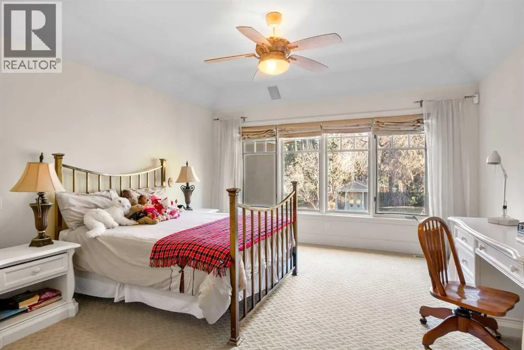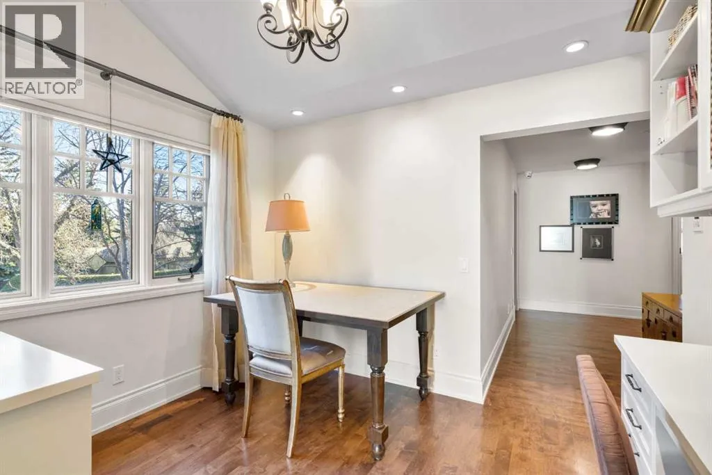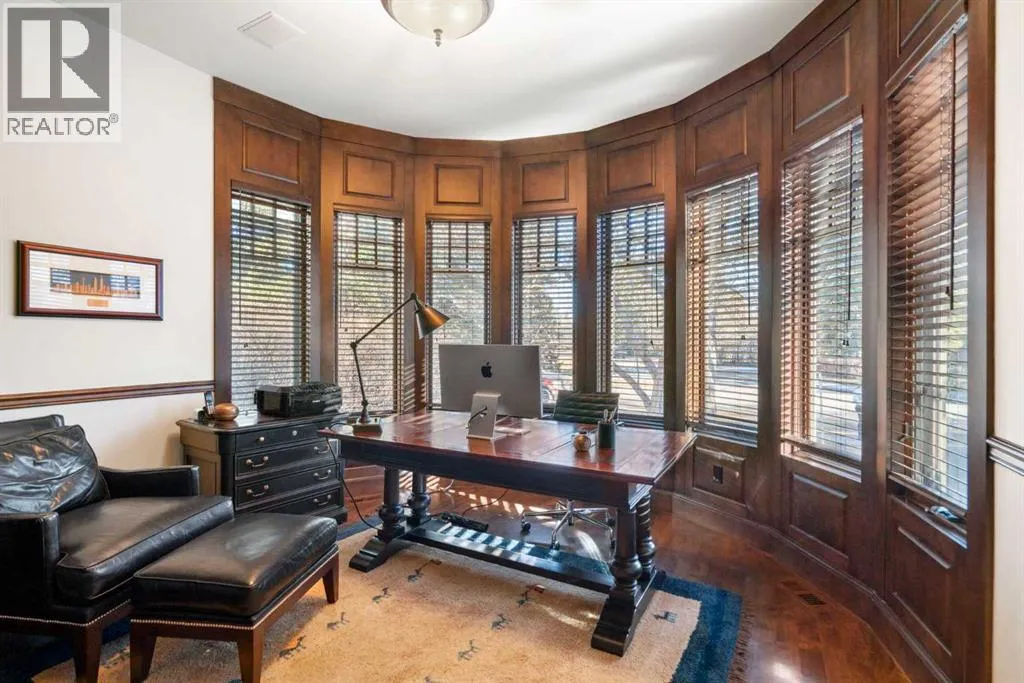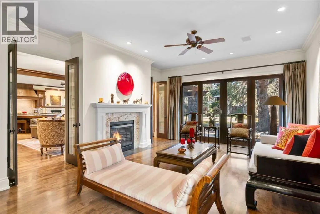 This stunning Laratta built executive family residence, is an architectural masterpiece nestled on a most coveted Upper Mount Royal tree lined street overlooking Talon Park. Set on a private, estate sized 70' x 194' west facing lot surrounded by mature trees, meticulous landscaping, English country gardens, offering a rare blend of historic grandeur, modern luxury & resort-style living. Boasting 7158 sq. ft. of impeccably designed living space, this residence showcases gleaming hickory & hardwood floors throughout the upper levels, with beamed ceilings, crown mouldings, solid core doors, extensive millwork, designer fixtures & an abundance of natural light through expansive windows. The enclosed foyer opens to the entertaining sized great room with built-ins & gas fireplace offers seamless indoor outdoor flow. The gourmet kitchen with granite countertops, a striking oversized island with circular eating bar, loads of custom cabinetry, spacious pantry, beamed ceilings, professional appliances, effortless flow into the family sized dining area & sitting area with fireplace overlooking the yard. A private office with custom bookcases overlooks Talon park, while the main floor primary suite, currently a second family room, features tranquil views, a luxurious spa-inspired 5-piece ensuite with soaker tub, steam shower, dual sinks, marble countertops, heated marble floors & abundant storage. A guest powder room, private laundry with cabinetry & a functional mudroom leads to the heated extra wide double attached garage. The upper level offers five spacious bedrooms, including a primary bedroom with double closets, luxurious ensuite and overlooks the tranquility of the west yard. The secondary bedrooms all with ensuites & a retreat area deliver exceptional comfort, flexibility & privacy. The lower level designed for elevated leisure & entertainment, features an expansive family room with built-in cabinets, billiards room, a large wrap-around wet bar with dishwasher, microwa ve & beverage fridge, temperature controlled wine cellar with tasting lounge, a bedroom with ensuite, a large playroom currently a ballet studio & glass enclosed exercise area plus exceptional storage. Outdoors, the tranquil west facing yard is home to manicured grounds framed by mature trees, offering sun drenched lounging areas, distinct living spaces, patio zone perfect for gatherings, a full irrigation system & ample room for a future pool. This estate harmonizes style, functionality, serenity & ideally located within walking distance to top rated schools, parks, River Park, the Elbow River Pathways, community tennis courts, outdoor pools, Glencoe Club, Calgary Golf & Country Club, public library, downtown, the vibrant shops, restaurants & culture of 17th Avenue, 4th & 14th Streets. This rare offering represents an unparalleled opportunity for the discerning buyer seeking architectural excellence, intentional design, premium materials - this is more than a home, it's a statement of refined living. (id:27476)
