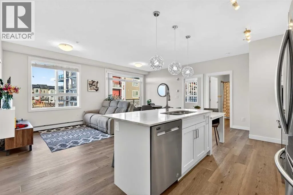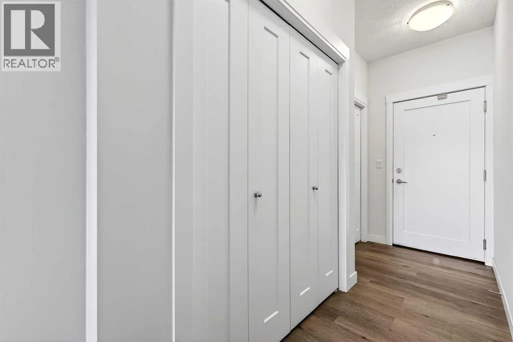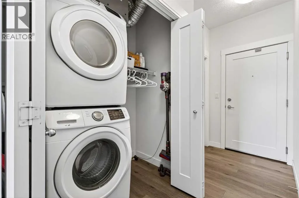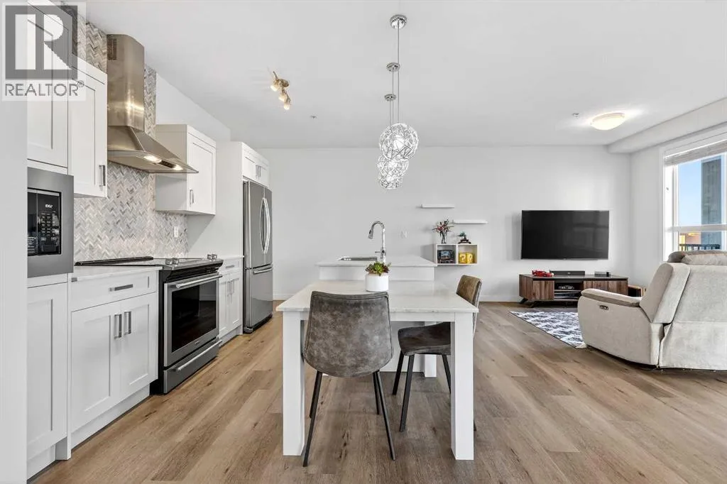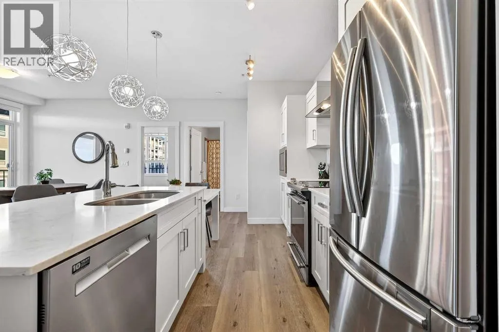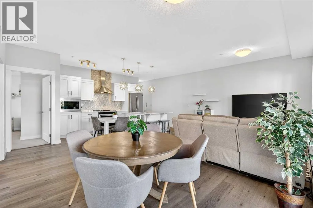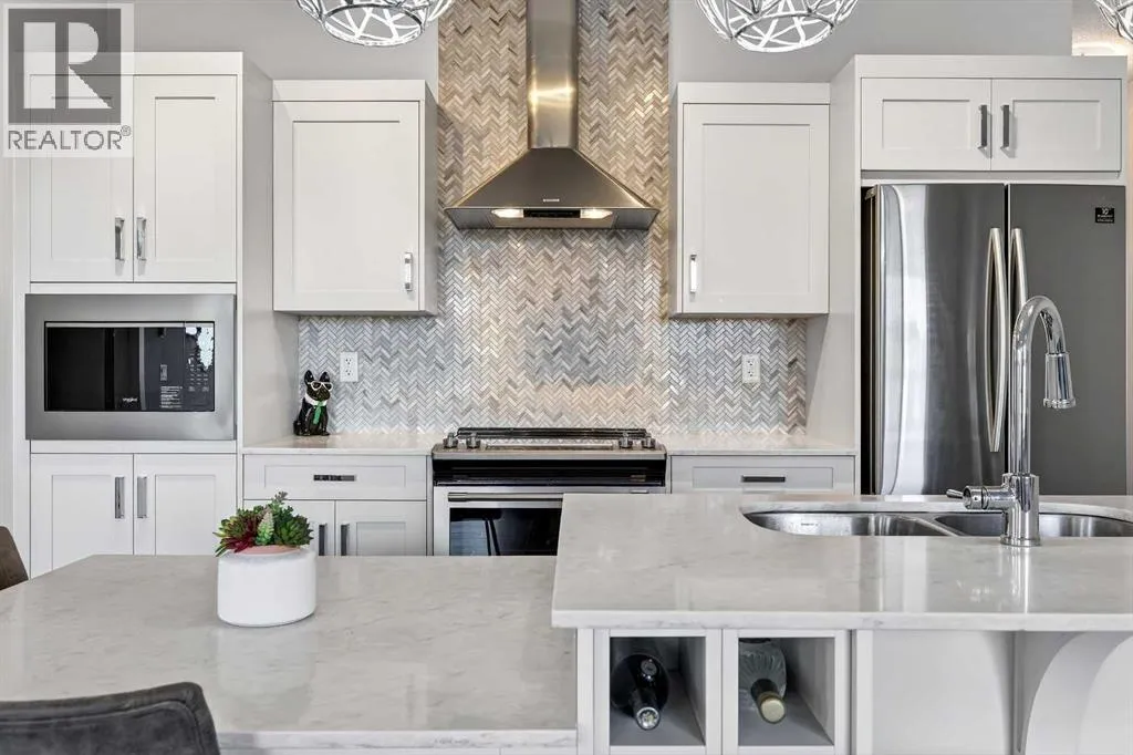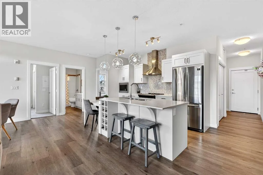 Welcome to this immaculate corner unit featuring TWO TITLED PARKING STALLS (one above ground and the other in the parkade). As you enter, youâre greeted by 9-foot ceilings, an abundance of natural light and a bright open-concept layout with durable luxury vinyl plank flooring throughout the main living space. The modern kitchen showcases modern shaker-style cabinetry with soft close drawers, quartz countertops, upgraded stainless steel appliances with a Samsung French-door refrigerator with ice maker, a sleek chimney hood fan, and a stunning marble herringbone tile backsplash. The extended island provides ample seating and is complemented by stylish pendant lighting, while a convenient pantry with built-in microwave adds extra functionality. The spacious primary bedroom features a walkthrough closet leading to a private ensuite with dual vanities. A second bedroom and full four-piece bathroom offer flexibility for guests, family, or a home office. Step outside to enjoy the generous wrap-around corner balcony complete with a BBQ gas lineâperfect for entertaining or relaxing. Ideally located minutes from shopping, dining, and everyday amenities, with easy access to Macleod Trail for a quick commute. Donât miss this exceptional opportunityâcall your favourite realtor to book your private showing today. (id:27476)