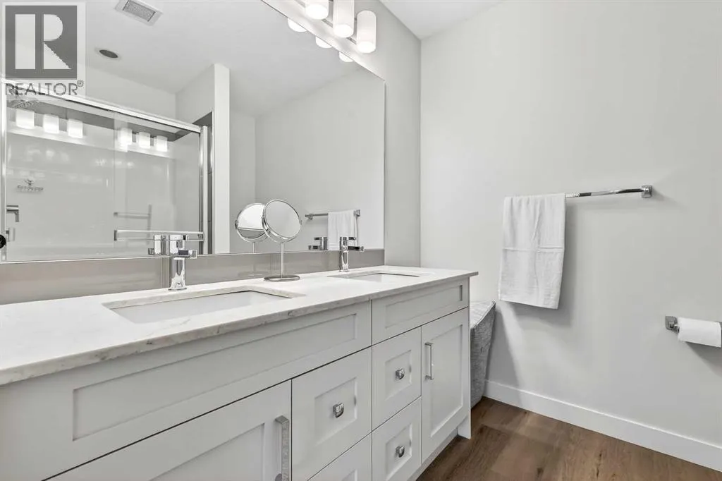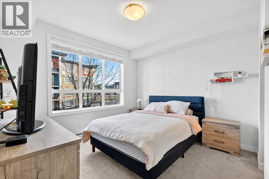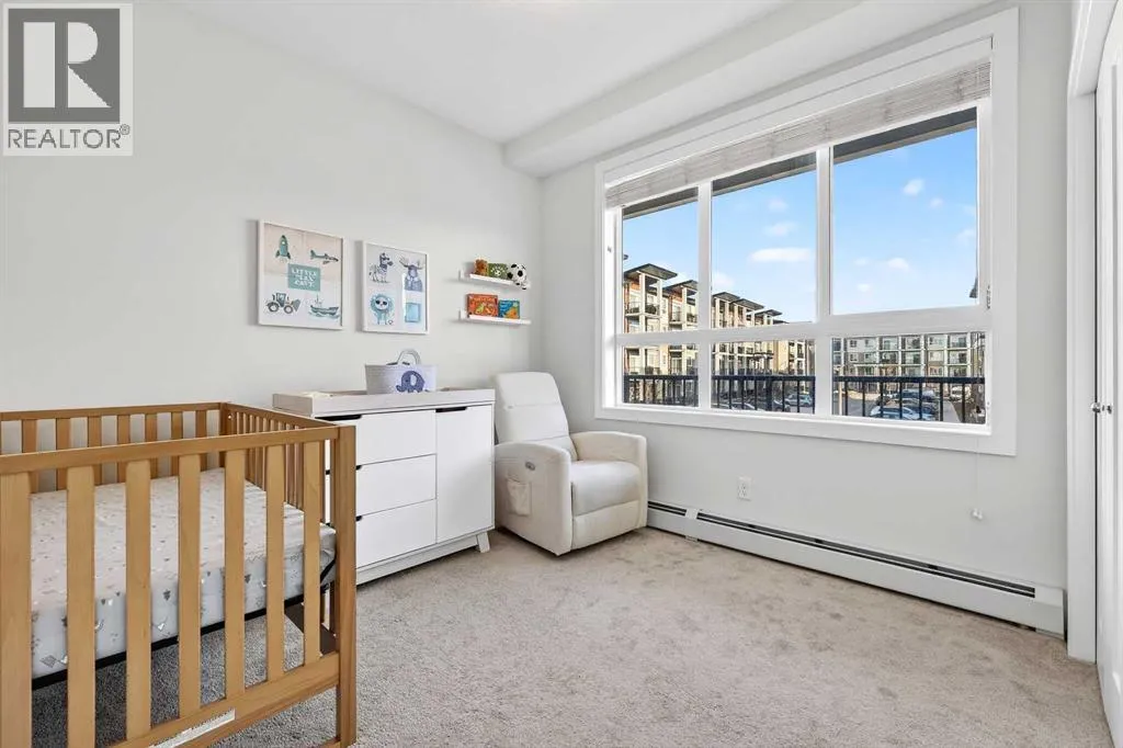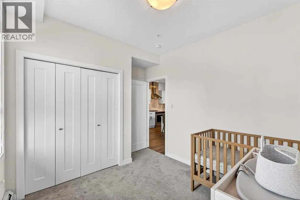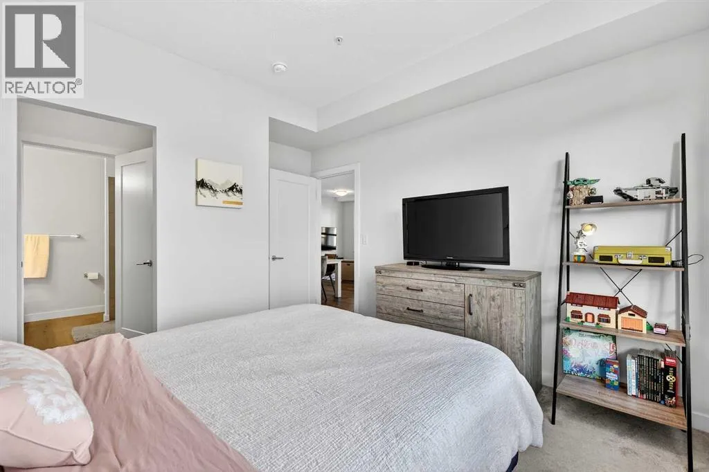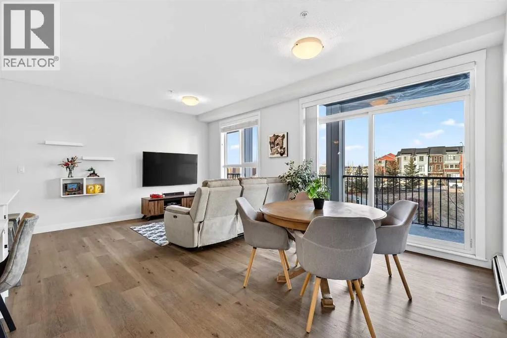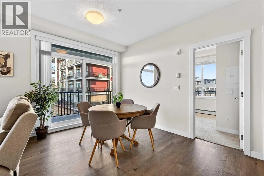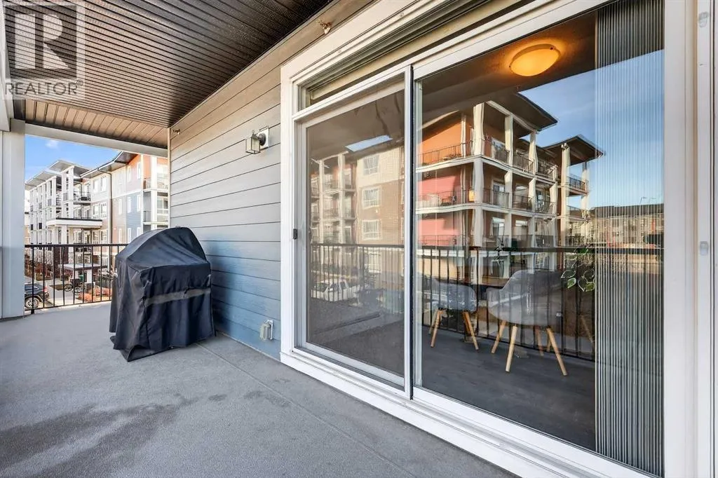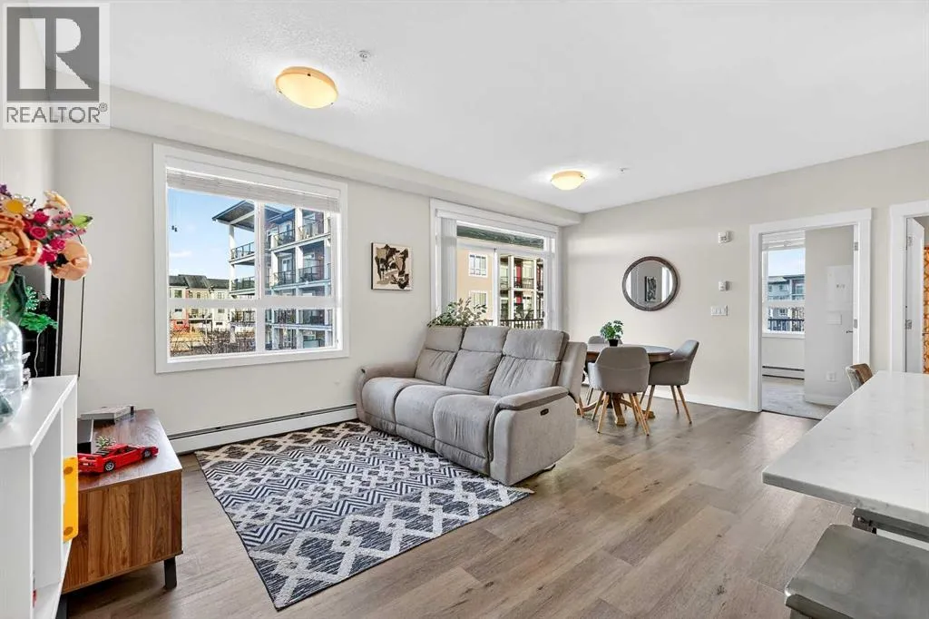 Welcome to this immaculate corner unit featuring TWO TITLED PARKING STALLS (one above ground and the other in the parkade). As you enter, youâre greeted by 9-foot ceilings, an abundance of natural light and a bright open-concept layout with durable luxury vinyl plank flooring throughout the main living space. The modern kitchen showcases modern shaker-style cabinetry with soft close drawers, quartz countertops, upgraded stainless steel appliances with a Samsung French-door refrigerator with ice maker, a sleek chimney hood fan, and a stunning marble herringbone tile backsplash. The extended island provides ample seating and is complemented by stylish pendant lighting, while a convenient pantry with built-in microwave adds extra functionality. The spacious primary bedroom features a walkthrough closet leading to a private ensuite with dual vanities. A second bedroom and full four-piece bathroom offer flexibility for guests, family, or a home office. Step outside to enjoy the generous wrap-around corner balcony complete with a BBQ gas lineâperfect for entertaining or relaxing. Ideally located minutes from shopping, dining, and everyday amenities, with easy access to Macleod Trail for a quick commute. Donât miss this exceptional opportunityâcall your favourite realtor to book your private showing today. (id:27476)