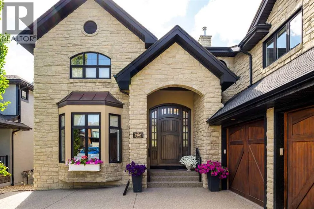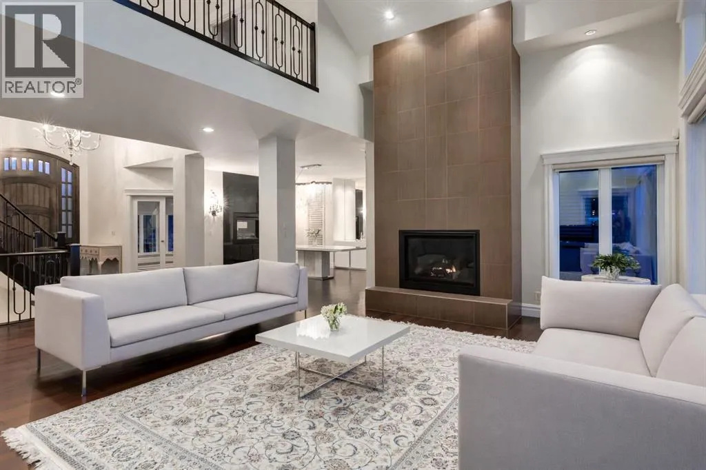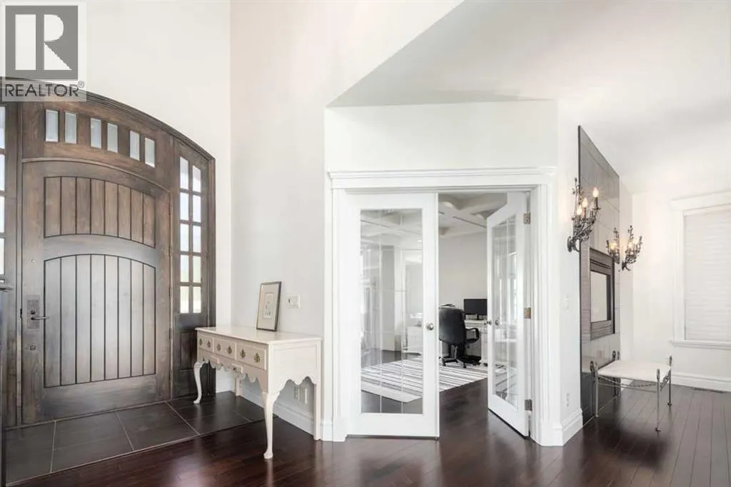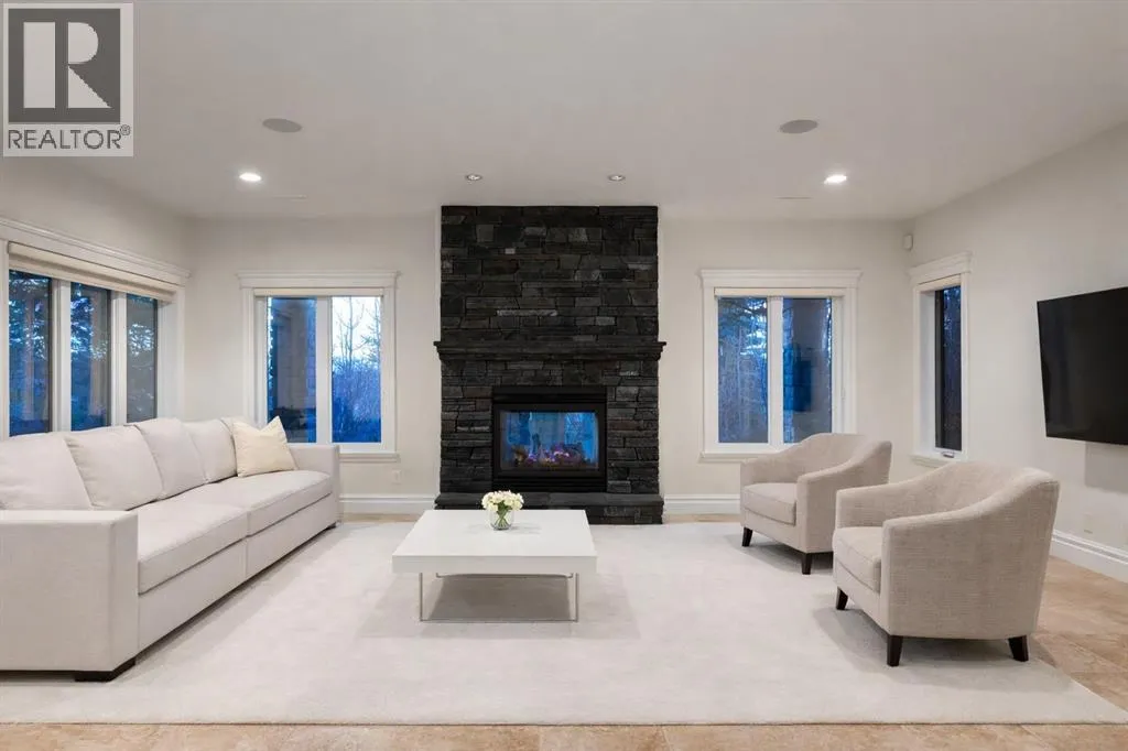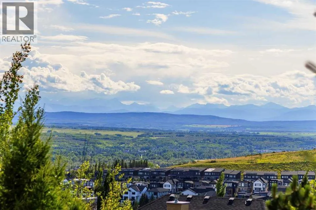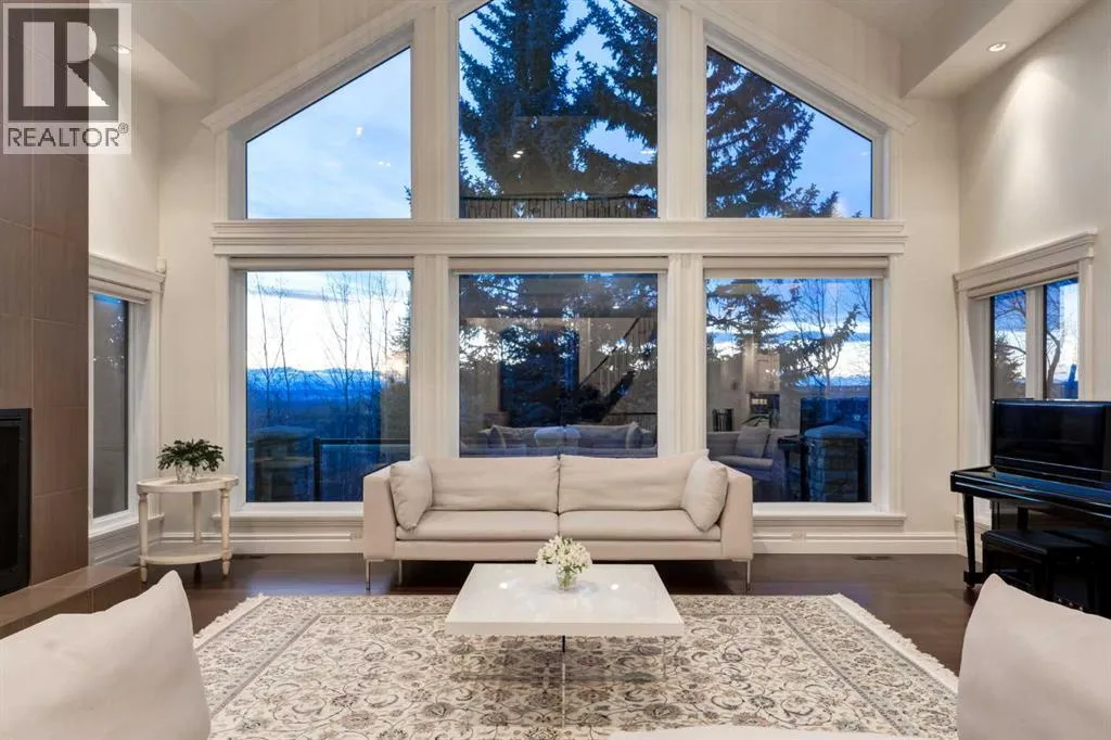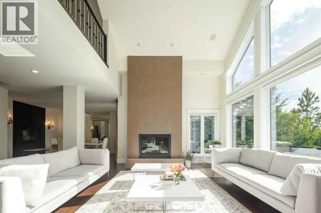 Balanced with natural light, this beautifully crafted family home captures breathtaking West-facing views of the Rocky Mountains, set against a serene, tree-lined backdrop. A timeless custom maple front door creates a warm first impression, complemented by natural stone detailing. Thoughtfully designed with custom-built cabinetry throughout, the home blends elegance with everyday functionality. Inside, a vaulted sitting room immediately draws the eye. Expansive windows frame the views while a sleek floor-to-ceiling fireplace adds contemporary architectural presence. Just off the foyer, a private executive office with French doors and coffered ceilings connects seamlessly to the formal dining room through a double-sided fireplace. The kitchen features Sub-Zero, Wolf, and Miele appliances and flows into a bright breakfast nook that opens onto the west-facing deckâideal for alfresco dining. Overlooking the private, treed backyard, the pergola-covered deck includes stairs leading to the spacious yard below. A generous walk-through pantry connects to a fully equipped mudroom with extensive storage, a sink, and access to the triple garage. The grand curved wood staircase leads upstairs to three spacious bedrooms and a large flex room. The primary suite offers a private terrace with sweeping Rocky views, his & her custom closets, and an expansive ensuite with heated floors, his & her vanities, and a dedicated vanity area. Above the garage, the inviting flex room features its own fireplace and ample space for media & games. Two additional bedrooms share a 5-piece Jack-and-Jill bathroom with a double vanity, ideal for siblings. A well-appointed laundry room with built-in cabinetry, a sink, and hanging space completes the upper level. The fully developed walkout basement features travertine flooring and radiant in-floor heating throughout. A double-sided fireplace connects the interior family room to the covered exterior deck. This level is designed for versatility, offering a theatre room, bright home gym, additional bedroom, and a 4-piece bath with a steam shower. With a wet bar and private backyard access from two points, the lower-level functions beautifully as a retreat for growing or multigenerational families. Ideally located near Calgaryâs top private and public schoolsâincluding Rundle College, Webber Academy, and Ernest Manning High Schoolâthis home also offers quick access to Westside Rec Centre, Aspen Landing Shopping Centre, and Highway 1 for easy escapes to Banff. (id:27476)