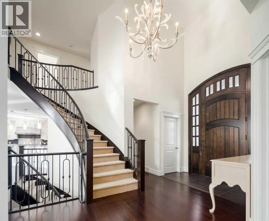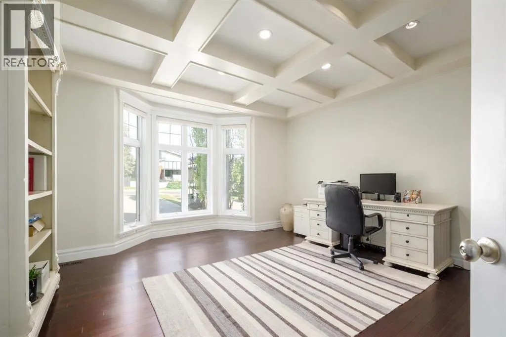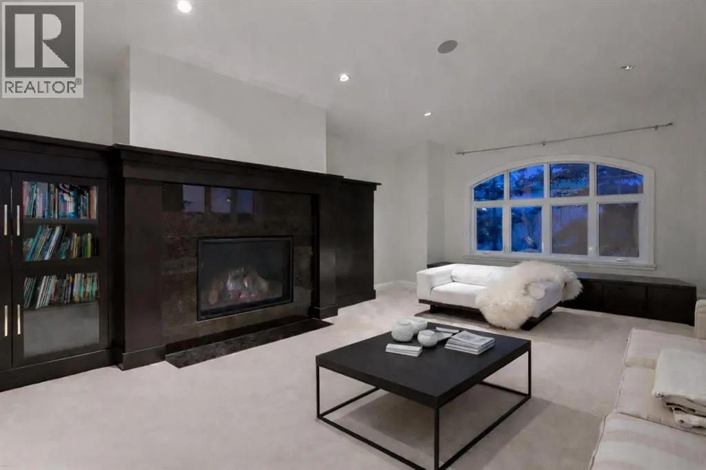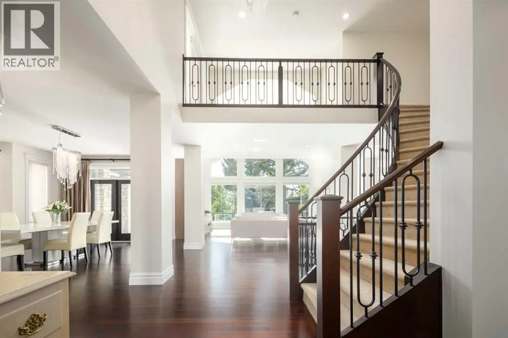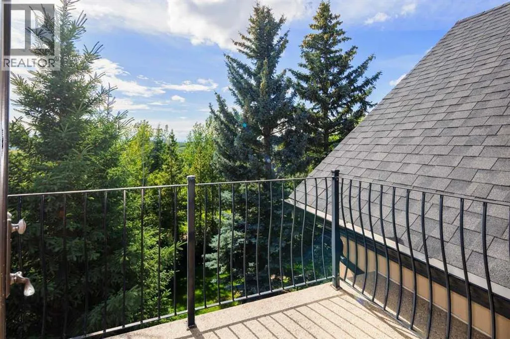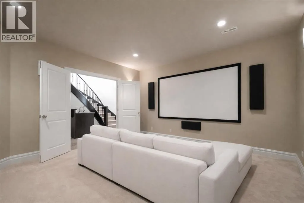 Balanced with natural light, this beautifully crafted family home captures breathtaking West-facing views of the Rocky Mountains, set against a serene, tree-lined backdrop. A timeless custom maple front door creates a warm first impression, complemented by natural stone detailing. Thoughtfully designed with custom-built cabinetry throughout, the home blends elegance with everyday functionality. Inside, a vaulted sitting room immediately draws the eye. Expansive windows frame the views while a sleek floor-to-ceiling fireplace adds contemporary architectural presence. Just off the foyer, a private executive office with French doors and coffered ceilings connects seamlessly to the formal dining room through a double-sided fireplace. The kitchen features Sub-Zero, Wolf, and Miele appliances and flows into a bright breakfast nook that opens onto the west-facing deckâideal for alfresco dining. Overlooking the private, treed backyard, the pergola-covered deck includes stairs leading to the spacious yard below. A generous walk-through pantry connects to a fully equipped mudroom with extensive storage, a sink, and access to the triple garage. The grand curved wood staircase leads upstairs to three spacious bedrooms and a large flex room. The primary suite offers a private terrace with sweeping Rocky views, his & her custom closets, and an expansive ensuite with heated floors, his & her vanities, and a dedicated vanity area. Above the garage, the inviting flex room features its own fireplace and ample space for media & games. Two additional bedrooms share a 5-piece Jack-and-Jill bathroom with a double vanity, ideal for siblings. A well-appointed laundry room with built-in cabinetry, a sink, and hanging space completes the upper level. The fully developed walkout basement features travertine flooring and radiant in-floor heating throughout. A double-sided fireplace connects the interior family room to the covered exterior deck. This level is designed for versatility, offering a theatre room, bright home gym, additional bedroom, and a 4-piece bath with a steam shower. With a wet bar and private backyard access from two points, the lower-level functions beautifully as a retreat for growing or multigenerational families. Ideally located near Calgaryâs top private and public schoolsâincluding Rundle College, Webber Academy, and Ernest Manning High Schoolâthis home also offers quick access to Westside Rec Centre, Aspen Landing Shopping Centre, and Highway 1 for easy escapes to Banff. (id:27476)