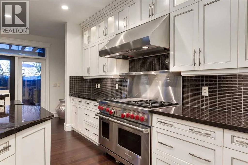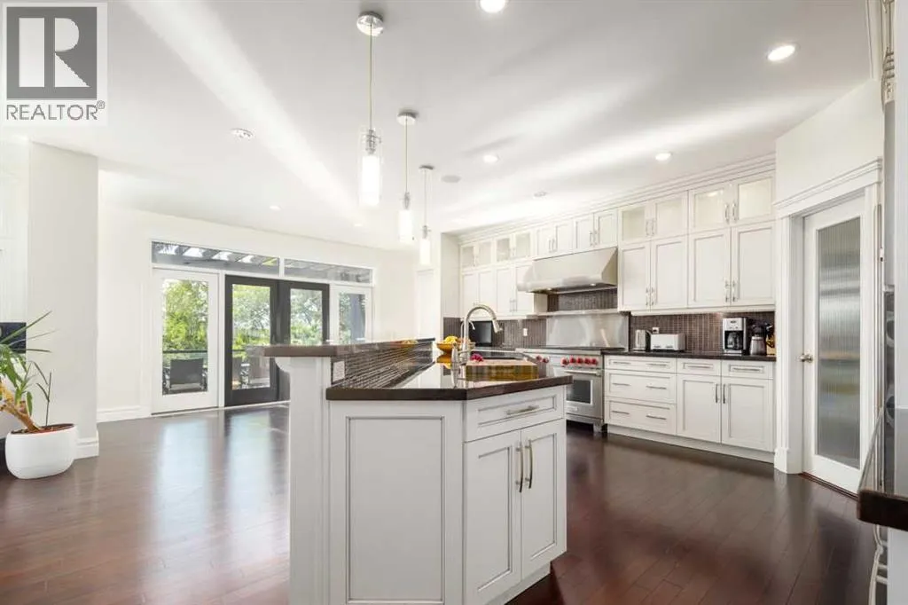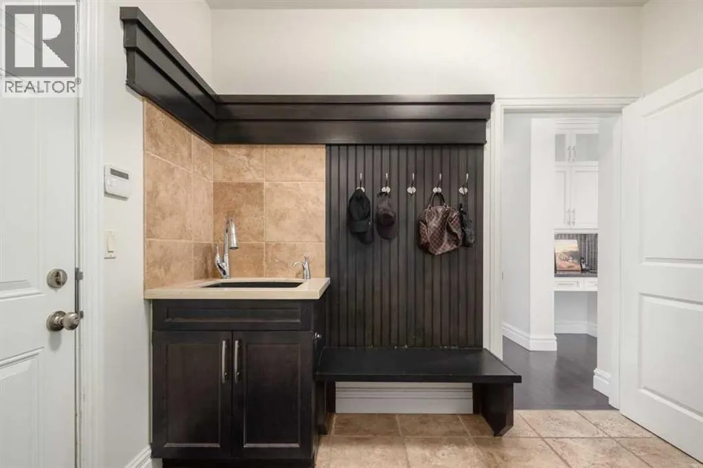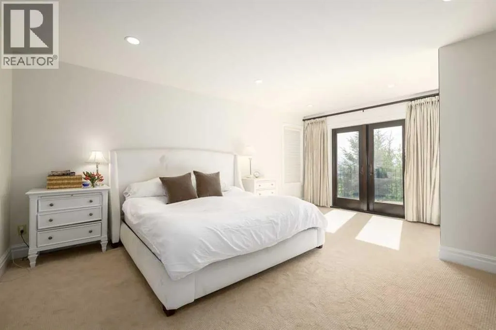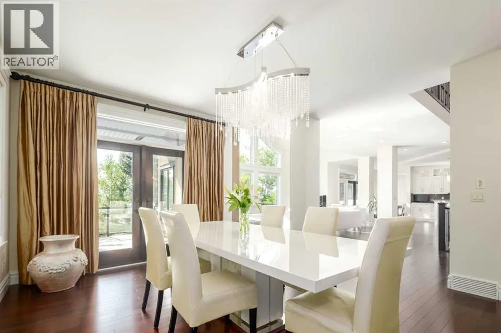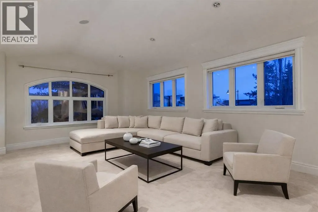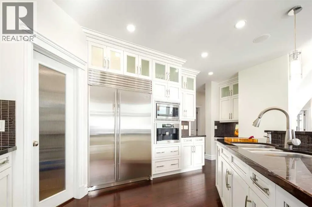 Balanced with natural light, this beautifully crafted family home captures breathtaking West-facing views of the Rocky Mountains, set against a serene, tree-lined backdrop. A timeless custom maple front door creates a warm first impression, complemented by natural stone detailing. Thoughtfully designed with custom-built cabinetry throughout, the home blends elegance with everyday functionality. Inside, a vaulted sitting room immediately draws the eye. Expansive windows frame the views while a sleek floor-to-ceiling fireplace adds contemporary architectural presence. Just off the foyer, a private executive office with French doors and coffered ceilings connects seamlessly to the formal dining room through a double-sided fireplace. The kitchen features Sub-Zero, Wolf, and Miele appliances and flows into a bright breakfast nook that opens onto the west-facing deckâideal for alfresco dining. Overlooking the private, treed backyard, the pergola-covered deck includes stairs leading to the spacious yard below. A generous walk-through pantry connects to a fully equipped mudroom with extensive storage, a sink, and access to the triple garage. The grand curved wood staircase leads upstairs to three spacious bedrooms and a large flex room. The primary suite offers a private terrace with sweeping Rocky views, his & her custom closets, and an expansive ensuite with heated floors, his & her vanities, and a dedicated vanity area. Above the garage, the inviting flex room features its own fireplace and ample space for media & games. Two additional bedrooms share a 5-piece Jack-and-Jill bathroom with a double vanity, ideal for siblings. A well-appointed laundry room with built-in cabinetry, a sink, and hanging space completes the upper level. The fully developed walkout basement features travertine flooring and radiant in-floor heating throughout. A double-sided fireplace connects the interior family room to the covered exterior deck. This level is designed for versatility, offering a theatre room, bright home gym, additional bedroom, and a 4-piece bath with a steam shower. With a wet bar and private backyard access from two points, the lower-level functions beautifully as a retreat for growing or multigenerational families. Ideally located near Calgaryâs top private and public schoolsâincluding Rundle College, Webber Academy, and Ernest Manning High Schoolâthis home also offers quick access to Westside Rec Centre, Aspen Landing Shopping Centre, and Highway 1 for easy escapes to Banff. (id:27476)