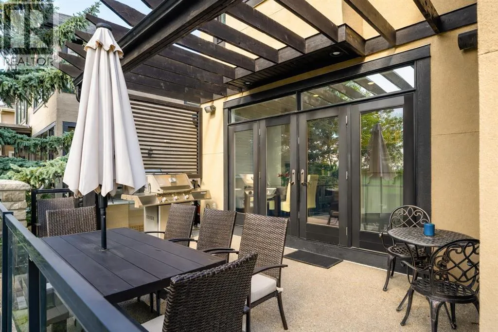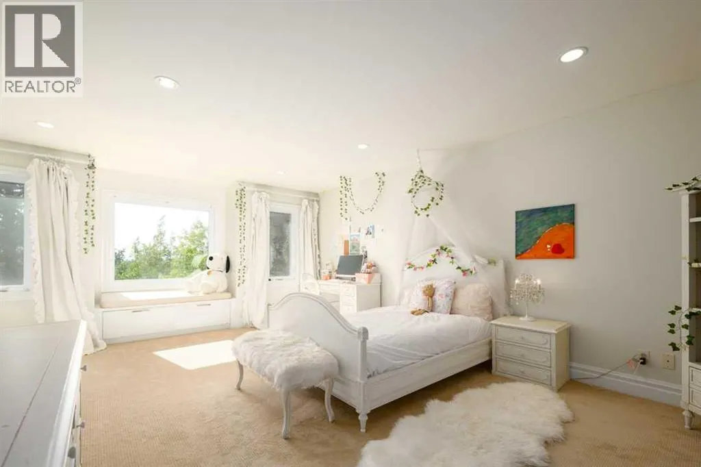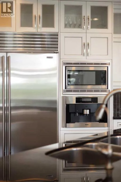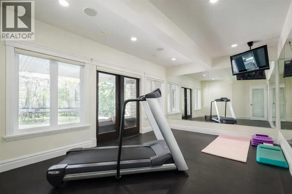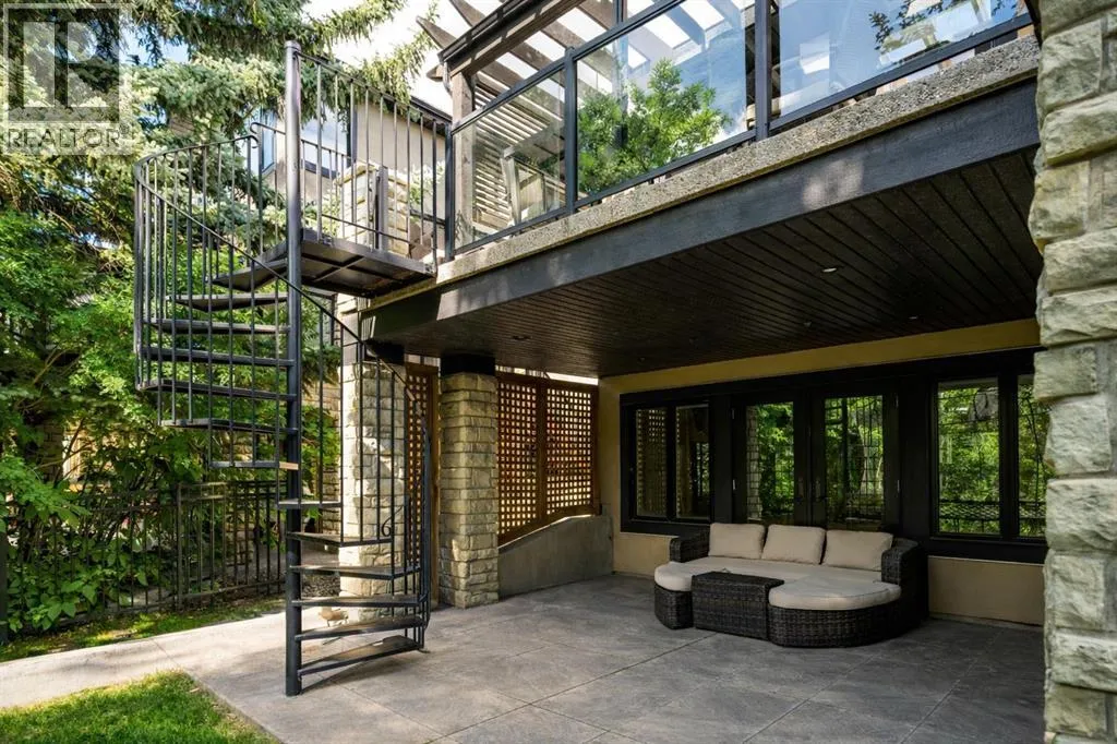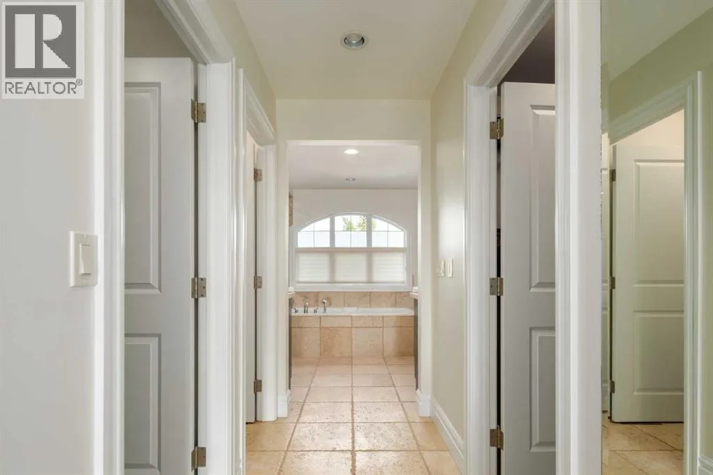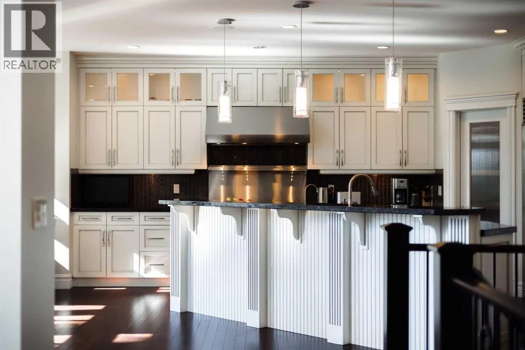 Balanced with natural light, this beautifully crafted family home captures breathtaking West-facing views of the Rocky Mountains, set against a serene, tree-lined backdrop. A timeless custom maple front door creates a warm first impression, complemented by natural stone detailing. Thoughtfully designed with custom-built cabinetry throughout, the home blends elegance with everyday functionality. Inside, a vaulted sitting room immediately draws the eye. Expansive windows frame the views while a sleek floor-to-ceiling fireplace adds contemporary architectural presence. Just off the foyer, a private executive office with French doors and coffered ceilings connects seamlessly to the formal dining room through a double-sided fireplace. The kitchen features Sub-Zero, Wolf, and Miele appliances and flows into a bright breakfast nook that opens onto the west-facing deckâideal for alfresco dining. Overlooking the private, treed backyard, the pergola-covered deck includes stairs leading to the spacious yard below. A generous walk-through pantry connects to a fully equipped mudroom with extensive storage, a sink, and access to the triple garage. The grand curved wood staircase leads upstairs to three spacious bedrooms and a large flex room. The primary suite offers a private terrace with sweeping Rocky views, his & her custom closets, and an expansive ensuite with heated floors, his & her vanities, and a dedicated vanity area. Above the garage, the inviting flex room features its own fireplace and ample space for media & games. Two additional bedrooms share a 5-piece Jack-and-Jill bathroom with a double vanity, ideal for siblings. A well-appointed laundry room with built-in cabinetry, a sink, and hanging space completes the upper level. The fully developed walkout basement features travertine flooring and radiant in-floor heating throughout. A double-sided fireplace connects the interior family room to the covered exterior deck. This level is designed for versatility, offering a theatre room, bright home gym, additional bedroom, and a 4-piece bath with a steam shower. With a wet bar and private backyard access from two points, the lower-level functions beautifully as a retreat for growing or multigenerational families. Ideally located near Calgaryâs top private and public schoolsâincluding Rundle College, Webber Academy, and Ernest Manning High Schoolâthis home also offers quick access to Westside Rec Centre, Aspen Landing Shopping Centre, and Highway 1 for easy escapes to Banff. (id:27476)