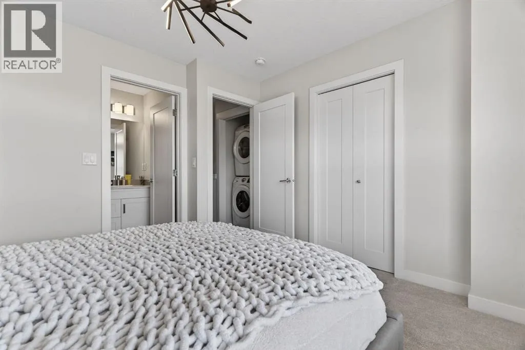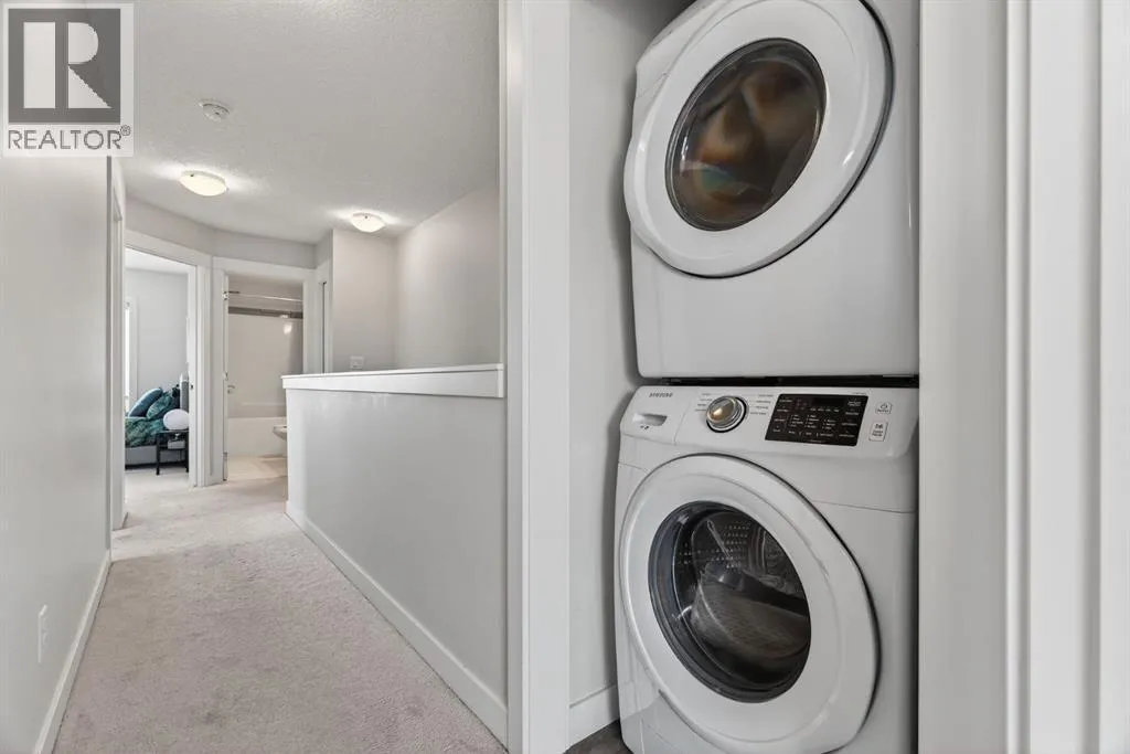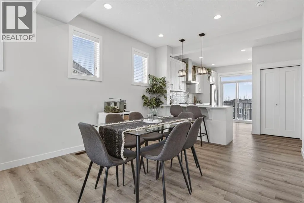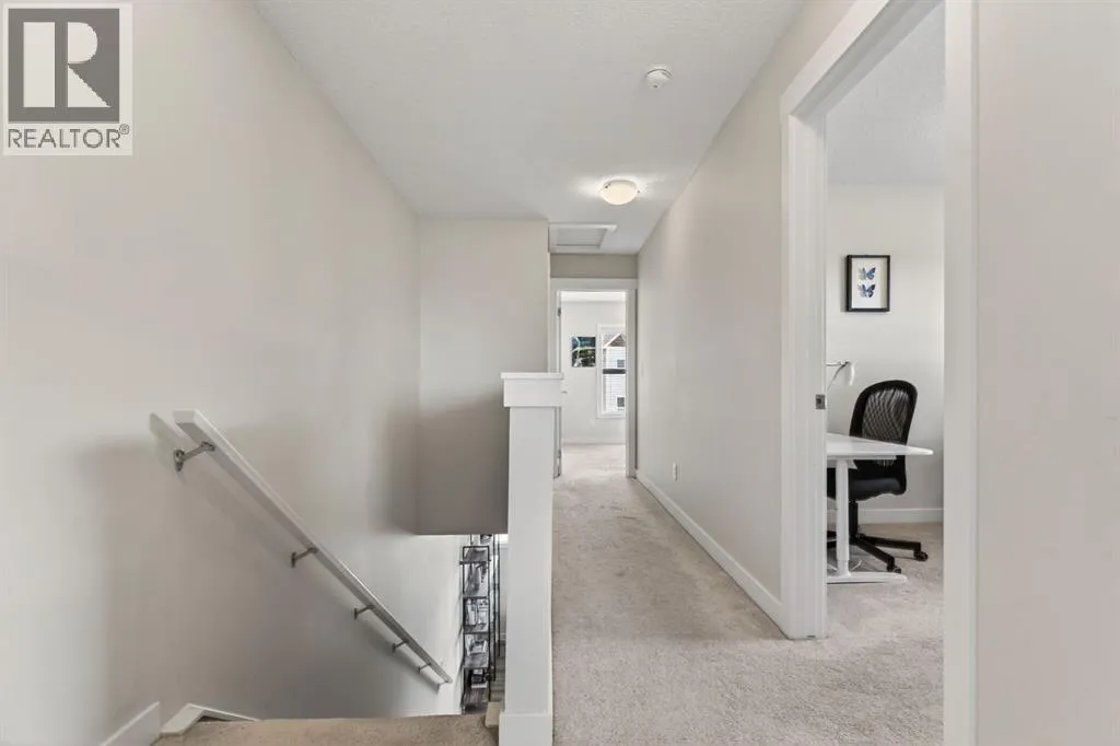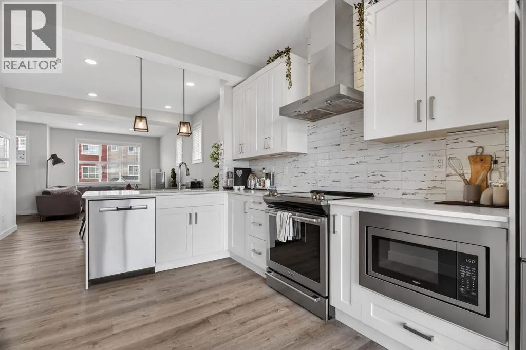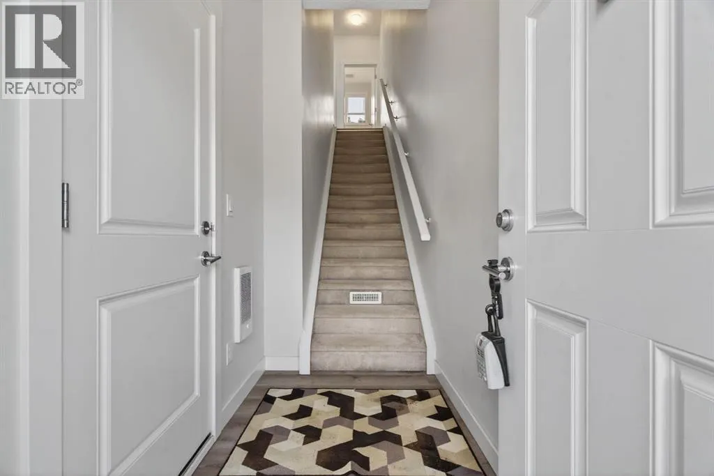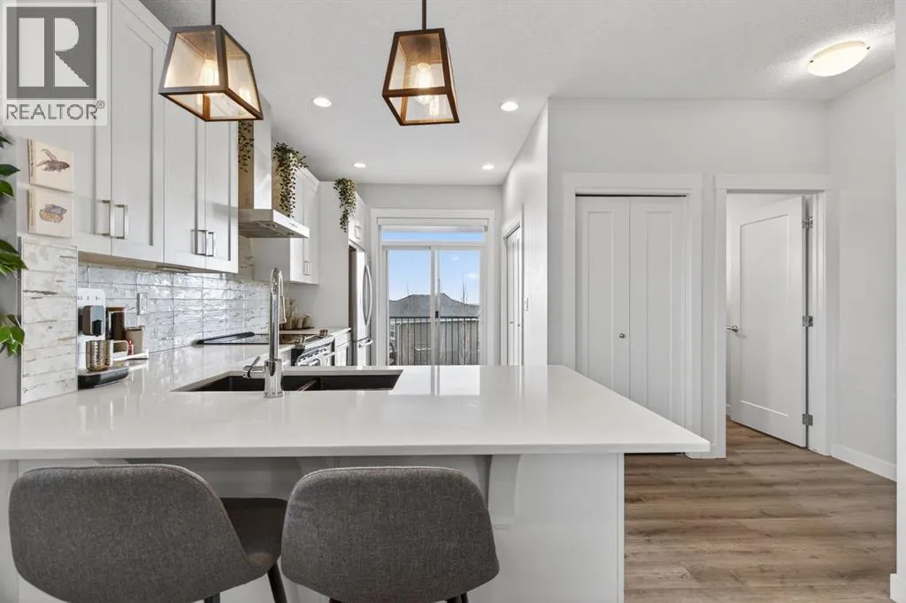 Welcome to this beautifully appointed corner end-unit townhouse in the sought-after community of Nolan Hill, offering 1,427.61 sq ft of thoughtfully designed living space, stunning city views, and exceptional natural light throughout. Perfectly positioned in the heart of the complex, this home enjoys a quieter interior location while still being just minutes from everyday amenities including Costco, T&T Supermarket, shopping, restaurants, and quick access routes in and out of the city. The main level features a bright and open-concept layout with expansive windows that flood the space with natural light. The stylish kitchen showcases white cabinetry, modern hardware, stainless steel appliances, quartz countertops, a sleek tile backsplash, and direct access to the private balcony â the perfect place to enjoy morning coffee while taking in the elevated city views. The kitchen flows seamlessly into the dining area and spacious living room, creating an ideal setup for both everyday living and entertaining. Upstairs, youâll find three generous bedrooms including a stunning primary retreat with large windows and beautiful views. The additional bedrooms are well-sized and ideal for guests or family. The home also features a tandem double attached garage, offering secure parking for two vehicles plus additional storage â a rare and valuable feature in townhouse living. With its corner positioning, extra windows, quiet interior location, functional layout, and incredible convenience to major amenities, this Nolan Hill townhouse delivers the perfect balance of comfort, style, and accessibility. (id:27476)