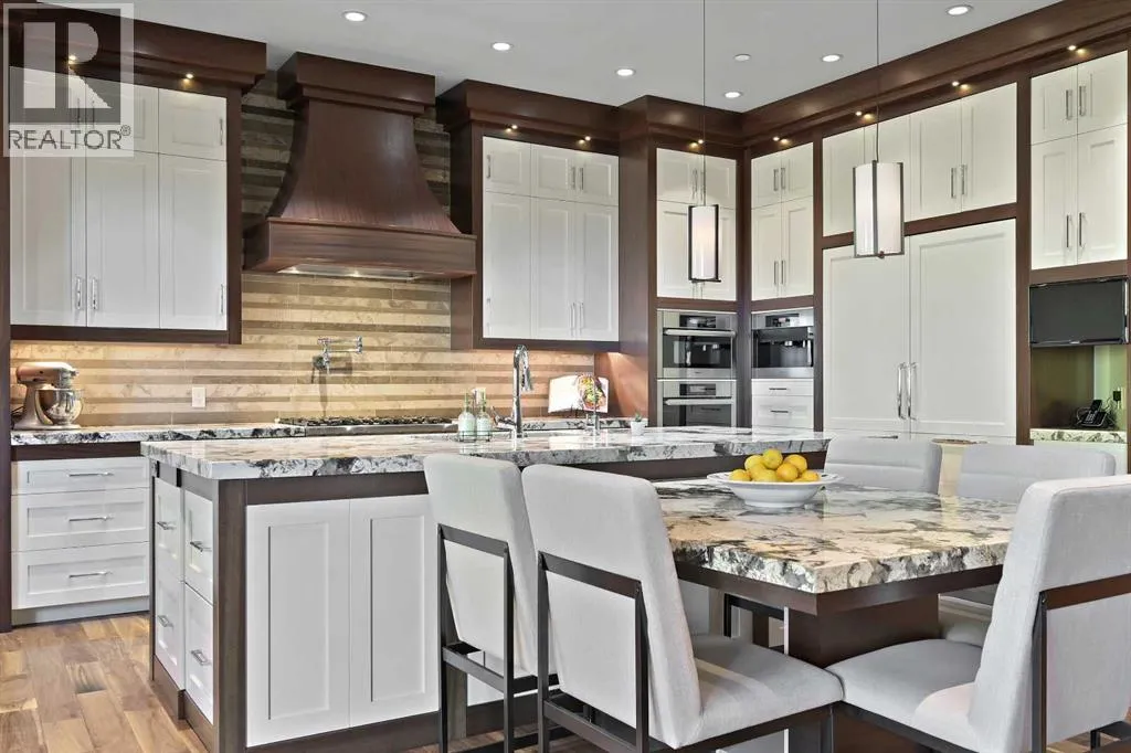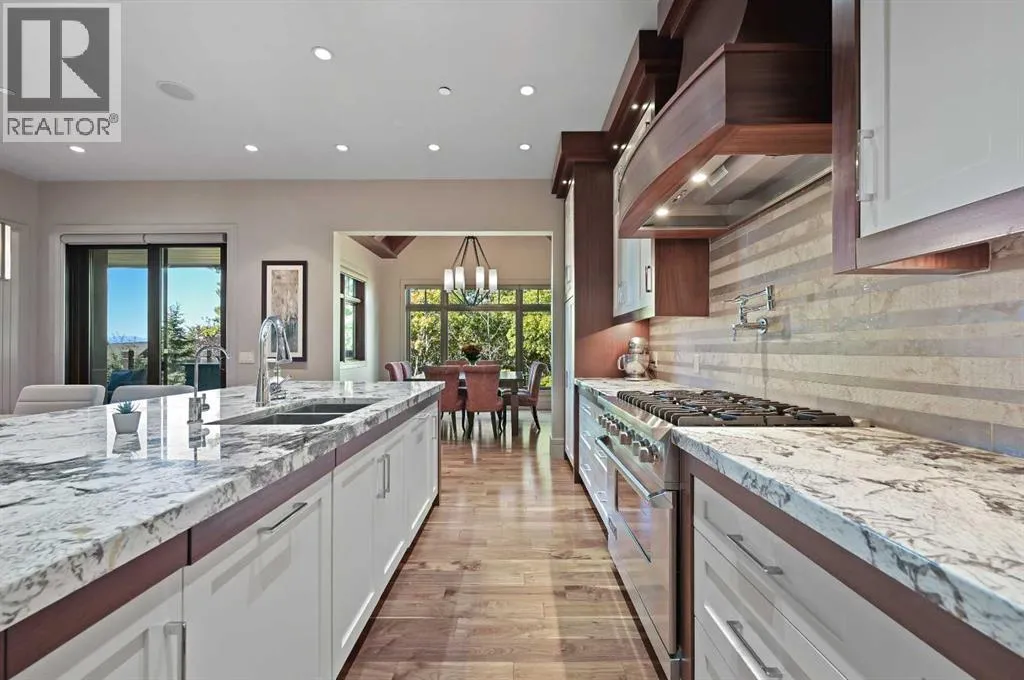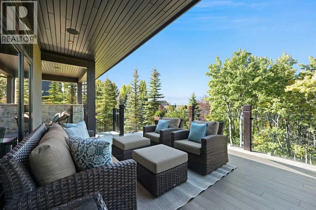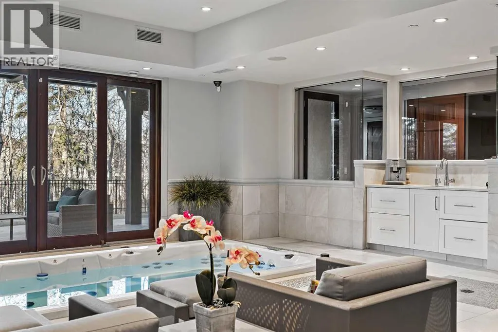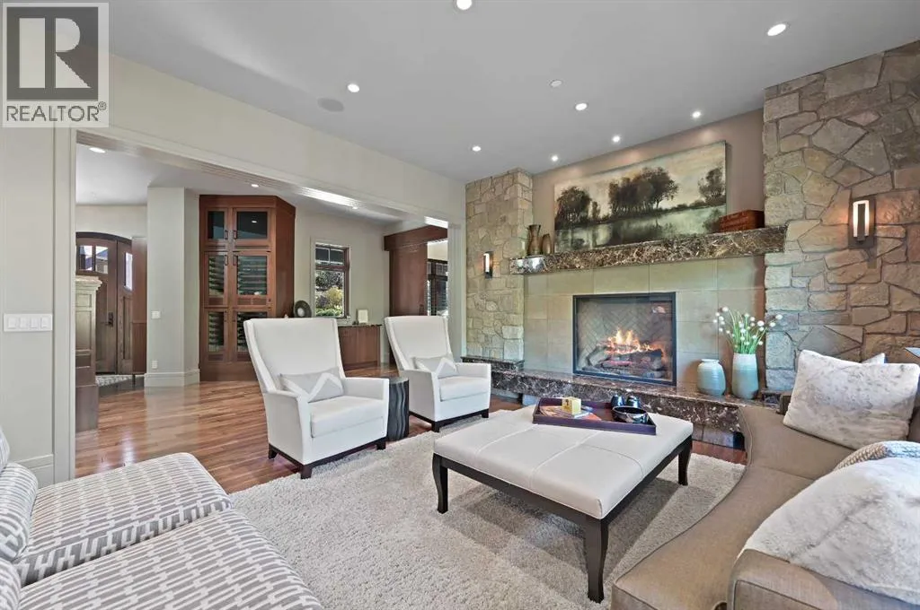 Nestled within the prestigious enclave of Springbank Valley Heights, this exceptional custom-built estate embodies understated luxury and timeless sophistication.Spanning over 7,500 square feet of exquisitely designed living space on a 12,604 sq. ft. lot, every detail of this residence reflects a deep commitment to craftsmanship and elegance.The stately stone exterior and charming front veranda create a distinguished first impression, while the grand foyerâwith its sweeping curved staircase and polished hardwood floorsâsets the stage for the refined interiors beyond. Designed for both culinary excellence and intimate entertaining, the gourmet kitchen features professional grade Viking and Miele appliances, including a gas range, an additional speed oven that doubles as a microwave, espresso machine, triple dishwashers, and a large double Sub-Zero fridge that complements the kitchenâs exceptional functionality.Granite countertops and custom cabinetry elevate the space, while the great room exudes warmth and sophistication, showcasing a custom granite stone fireplace that creates a âChic Chaletâ ambiance reminiscent of an upscale mountain retreatâperfect for gathering and relaxation. This space flows into the adjacent dining room, distinguished by its vaulted ceiling with custom wood inlay and uninterrupted ravine viewsâan inspiring setting for hosting or intimate evenings, framed by expansive windows that open to a serene west-facing backyard. Outside, an inviting new tile patio with a built-in BBQ and wood-burning fireplace creates a seamless extension of the homeâideal for alfresco dining and evening conversation as the sun sets over the ravine. A private home office with custom millwork provides a peaceful retreat for productivity, while the heated triple-car garage with its own furnace offers direct access to a spacious media lounge complete with wet bar, two-piece bath, and home theatre setup. Upstairs, the primary suite is a sanctuary of calm with a spa-inspire d 6-piece ensuite featuring a steam shower, dual vanities, and a meticulously designed walk-in closet.Two additional bedrooms, each with private ensuites, are complemented by a full upper-level laundry room for convenience. A second laundry area on the main level adds thoughtful functionality.The walkout lower level caters to wellness and leisure, showcasing a training pool enclosed in glass-a space that feels like a private spa, complete with bar fridge and freezer drawers, alongside a fully equipped fitness room and two additional bedrooms, each with a full bath.Thoughtfully appointed with in-floor heating, triple furnace systems, and a comprehensive fire suppression system, this residence offers a rare combination of advanced safety, comfort, and timeless style.Privately positioned against the ravine and just minutes from Aspen Landing and Stoney Trail, this is more than a homeâit is a statement of enduring quality, designed for those who appreciate refinement, privacy, and elegance in every detail. (id:27476)