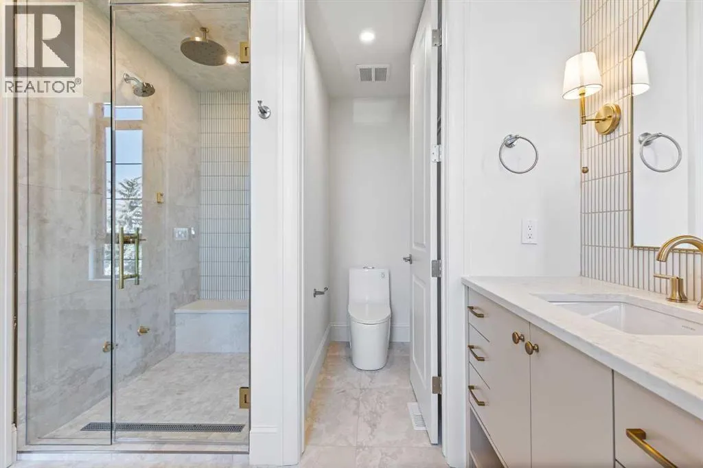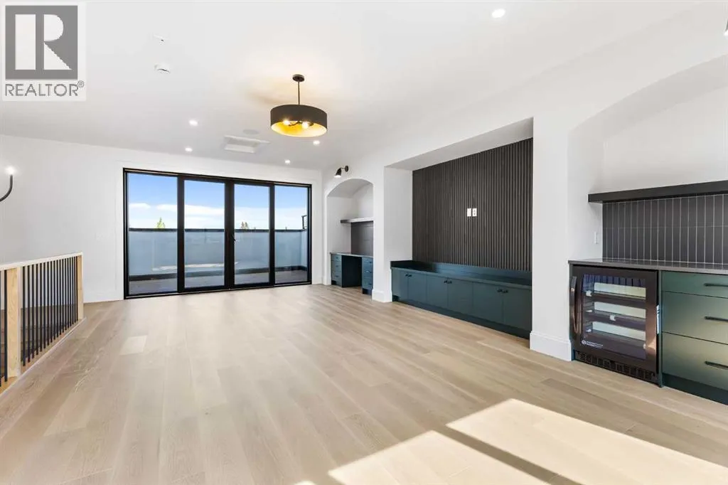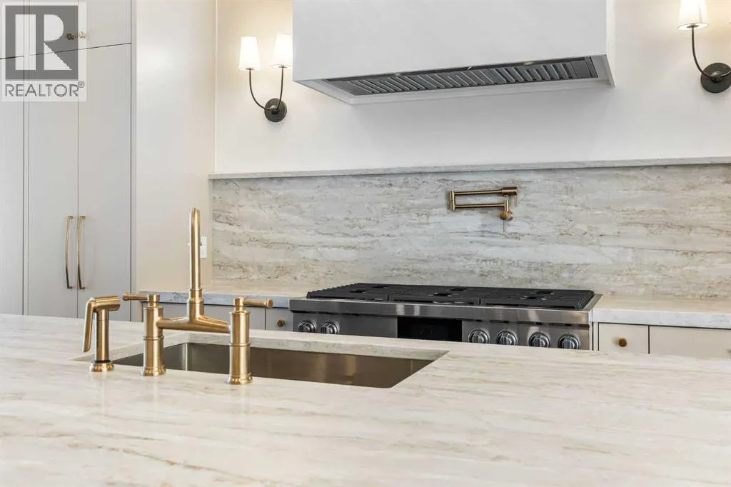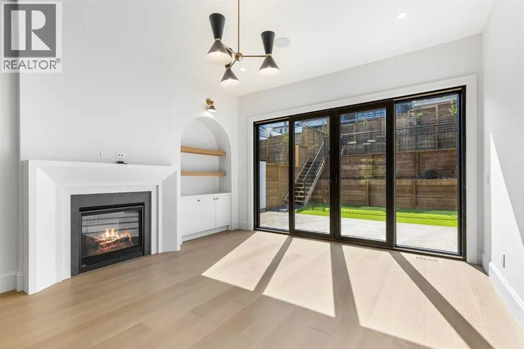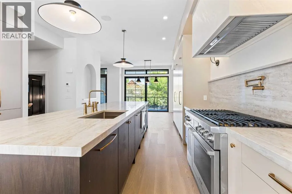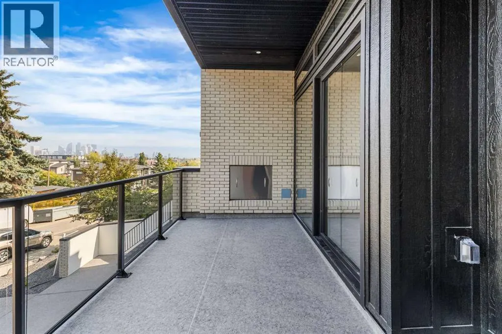 Experience quiet luxury at its finest in this stunning three-storey home, set on one of the highest points in Calgary with uninterrupted skyline views from all levels, and steps from Marda Loop. The exterior makes a striking first impression with its blend of classic white brick detailing, black accents, and timeless stucco. The curb appeal is enhanced by clean glass railings, low-maintenance landscaping, and a welcoming front balcony with a fireplace. Step into a beautiful and functional foyer, complete with custom built-in millwork, a bench, and smart storage including hanging compartments, open shelving, and pull-out drawers. The open-concept design includes a dedicated dining area surrounded by massive sliding doors that lead to the balcony. This is styled for intimate dinners, elevated entertaining, or just enjoying a coffee with stunning skyline views.At the heart of the home, the chefâs kitchen is a true masterpiece. It features a 14-foot island with quartz, a quartz backsplash, plaster textured hood fan, pot filler, and oversized premium appliances including a 48â dual oven gas range and a 66â built-in fridge/freezer. There is a butlerâs pantry with sink and cabinetry, mud room, coffee bar, and tons of storage including under the island. The kitchen is set up to be not only beautiful but also functional and includes a garbage drawer, bar cooler, and spice racks/cabinetry. Across from it, the living room centers around a beautiful fireplace and custom built-ins which make it cozy, refined, and made for real living. Large doors lead to the deck and the sunny south facing backyard, that is tiered, turfed and truly low maintenance. Throughout the home, youâll enjoy tons of natural sunlight from the large windows, 10-foot high ceilings, arched transitions, and wide-plank engineered hardwood create a warm and elevated flow.Upstairs, the primary suite is a serene retreat with a spa-like ensuite featuring a steam shower, dual vanity, custom tilework, and skyli ne views. Secondary bedrooms are generously sized, each with walk-in closets, and connected by a stylish bathroom ideal for kids or guests.The third level includes a beautiful rooftop patio where you can soak in the skyline views, a stylish bathroom with nice finishes, a rec/living area with built-in storage, a built-in desk, and a gas fireplace. There is a wet bar, bar fridge, and entertainment in the center. This is the ultimate entertaining area to host friends and family.The fully finished basement extends the living space with heated floors roughed-in, a large flex room or guest suite, and full bathroom. Additional features include a heated double attached garage with epoxy flooring, integrated speakers and security system, roughed-in central A/C and roughed-in heated driveway.Whether you're enjoying a quiet morning in the sun, hosting friends on the rooftop, or watching the city light up at night, this home was built for a lifestyle thatâs elevated and timeless. (id:27476)
