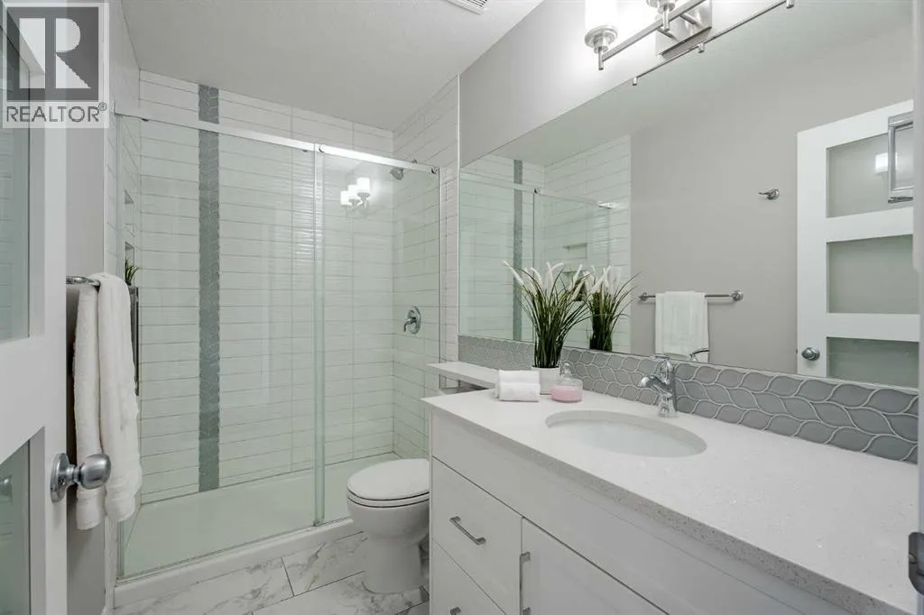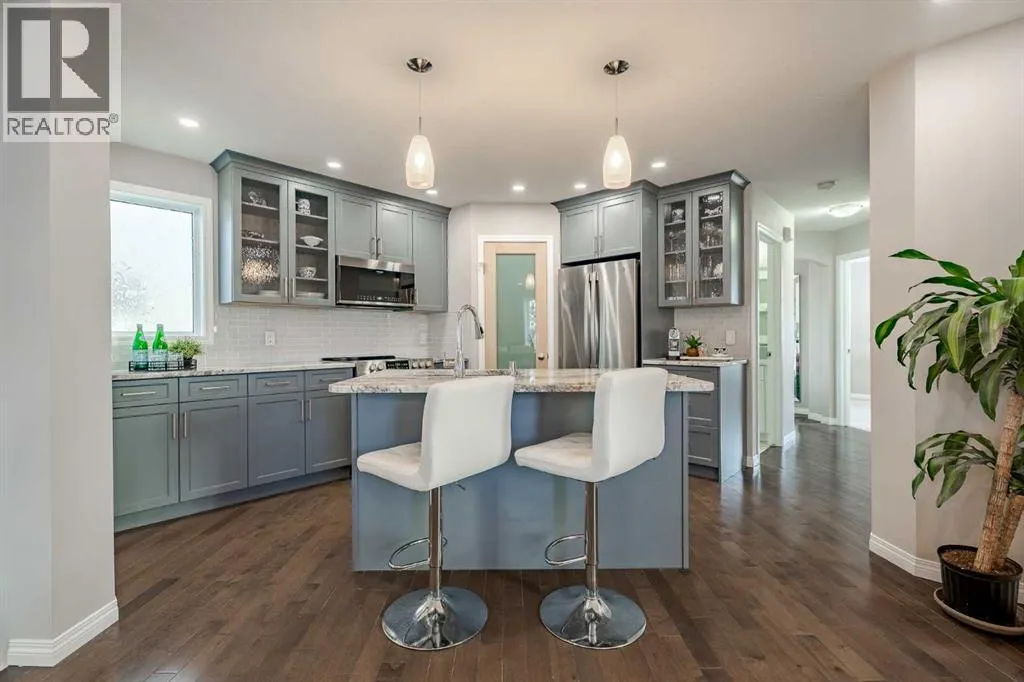 Good morning Beautiful! Nestled on a quiet street within walking distance to schools, parks, and playgrounds, this extensively renovated and meticulously maintained, modified, bi-level showcases a seamless, well-planned layout and offers approximately 2,120 sq.ft of thoughtful design. Featuring a professionally finished lower level, soaring ceilings, and a sunny south-facing backyard, this home perfectly blends comfort and style. As you enter, the front great room immediately impresses with 12' ceilings, floor-to-ceiling windows, an open and airy feel, and a stunning crystal fandelier that creates an elegant focal point while maintaining warmth and comfort for everyday living. The upper level features a bright and functional layout with a fully renovated kitchen(2022), custom full-height cabinetry, granite countertops, stainless steel appliances, LED pot lights with dimmers, pendant lighting over the island, and a frosted glass pantry door, all flowing seamlessly into the adjoining dining room. Two generously sized bedrooms and a beautifully renovated bathroom(2022) with porcelain tile flooring, a glass and porcelain tiled shower with niche and sliding glass door, quartz countertops, custom cabinetry, and updated lighting complete this level, along with a convenient main floor laundry area equipped with a newer (2022) front-load washer with steam, dryer, and folding counter. The bright lower level features large windows that fill the spacious family room with abundant natural light, complemented by a cozy corner gas fireplace. This level also includes a generous guest bedroom, a beautifully renovated (2022), four-piece bathroom with porcelain tile and quartz countertops, and an oversized under-stair storage area. And thereâs more⦠Additional renovations completed in 2022 include fresh interior paint, new trim, updated knockdown ceiling texture, and new carpet in the lower level and bedroomsâcreating a cohesive, modern feel throughout the home. Outside, enjoy th e underground sprinklers with 3 zones, fenced south-facing backyard with partially covered upper deck, a poured concrete patio and front walkway (2022), while additional upgrades include hail-resistant shingles (2025), new siding on the west facade of the house (2025), and an oversized, insulated & drywalled, double detached garage. Located just minutes from parks & playgrounds, schools, shopping, transit, Stoney Trail, and Deerfoot access, this beautifully renovated, move-in ready home combines quality finishes, functional design, and an exceptional location. (id:27476)