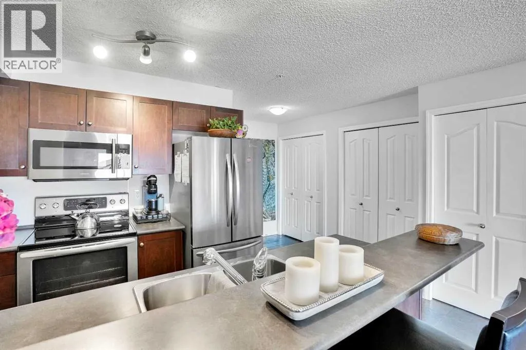 Welcome Home! This sweet condo is absolutely perfect for those who want a peaceful place to call their own. You can feel it as soon as you step into the suite. This corner suite overlooks walking paths, community spaces and greenery and the east exposure guarantees bright mornings. A generous size balcony is accessed through sliding patio doors from the living room: add some patio furniture, then sit back and enjoy the view. Tastefully decorated and well kept with dark stained wooden cabinetry, ceramic floor in the entry, kitchen and bathroom, laminate flooring in the living room and dining area, raised breakfast/casual/dining counter and upgraded appliances. The corner electric fireplace adds to the ambiance of this home. When it's cold outside, the heater fan can be turned on to gently warm the living area. Can you say "cozy"...?? There is abundant storage in the closets with built in shelving and space savers. An oversized, tiled, walk in shower in the main bath is both beautiful and functional. Care and thought was absolutely put into its design. Pride of ownership is both felt and seen in every part of this delightful condo. Walking distance to shopping complex with Shopper's Drug Mart, Save-On-Foods, banks, restaurants and... of course.... a Timmy's. A short drive will take you to the full Country Hills Shopping complex boasting a theatre, flower shops and the Calgary Public Library at Country Hills! CrossIron Mills is 15 minutes away. If you don't drive, Calgary Transit offers good service with connections at the North Pointe Terminal that's beside the Country Hills Complex. Check out the Panorama Pointe Community Centre, an active and expansive recreation facility for the area. A golf course is close by. Your designated parking stall #15 with power is right in front of the building. Condo fees include all utilities, even electricity. This home offers affordable, low maintenance living in a lovely area of Calgary. Contact your realtor to see it today!! (id:27476)