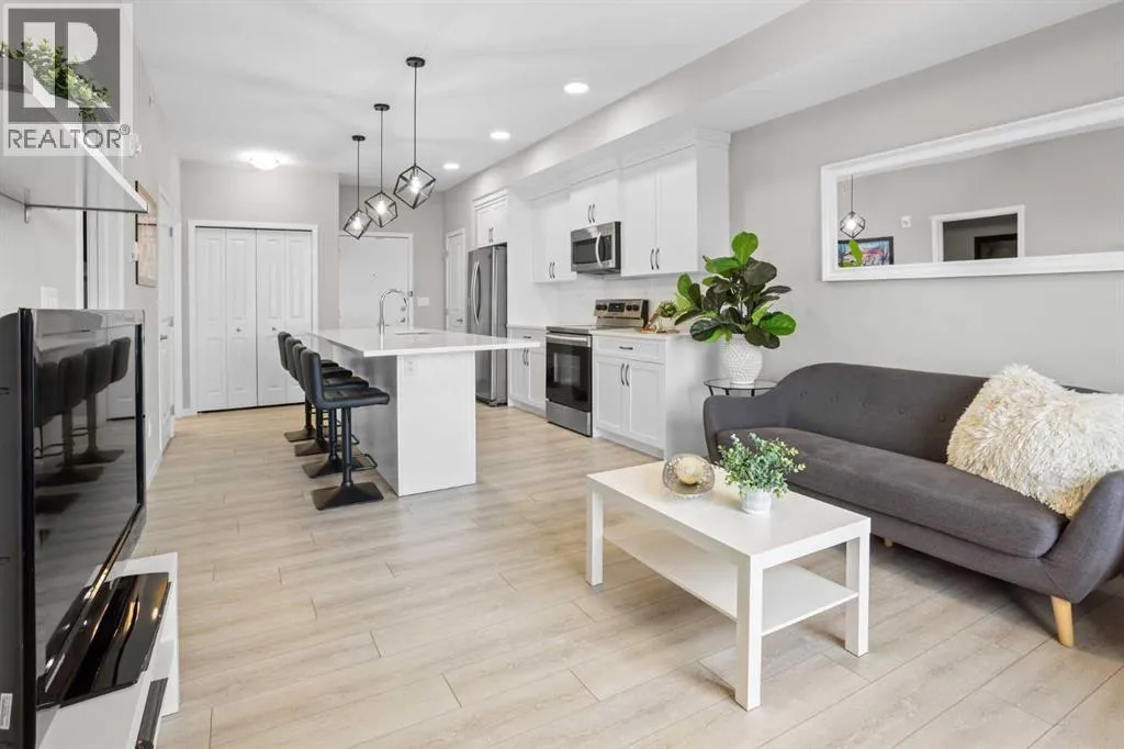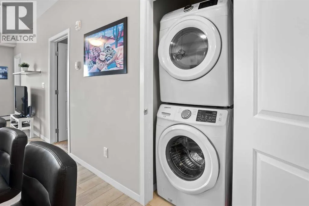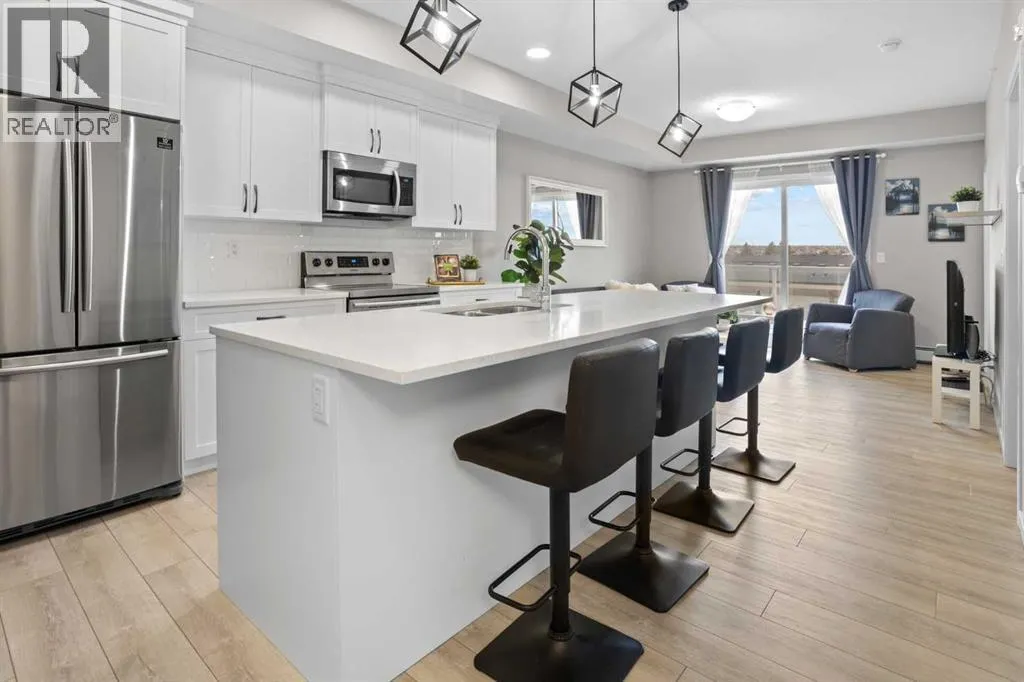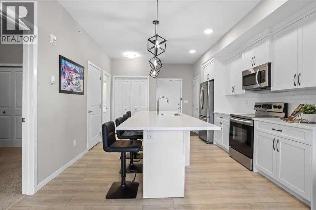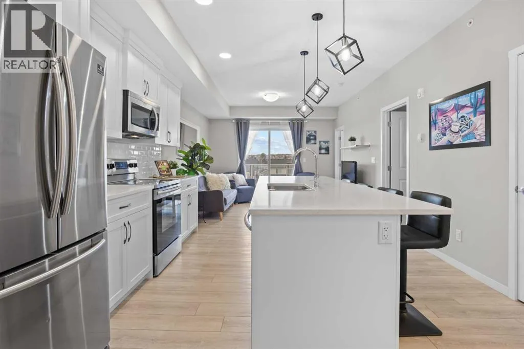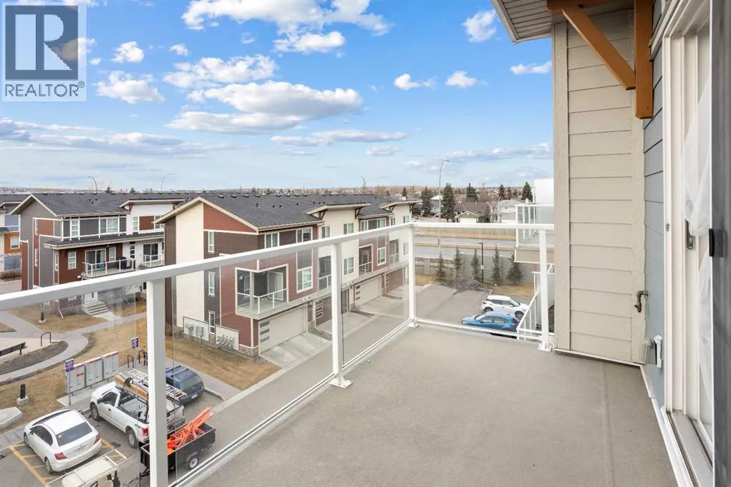 WATCH THE VIDEO! Rare and rarely available, this top-floor two-bedroom, one-bath condo at The Rise of Harvest Hills offers the strongest layout among the two-bedroom, one-bath floor plans in the building. Meticulously maintained by the original owner and showing like new, this home combines privacy, functionality, and natural light in a way that truly stands out.With nine-foot ceilings and west-facing windows, the space feels open, bright, and welcoming throughout the afternoon and evening. The open-concept kitchen anchors the layout with white shaker cabinetry, soft-close doors, extended-height uppers, quartz countertops, a mosaic tile backsplash, pendant lighting, and modern stainless steel appliances, including a full-size fridge and microwave hood fan. A unique two-sided island provides seating on one side and additional space on the other, perfect for a breakfast nook or casual dining.The kitchen flows seamlessly into a comfortable living room and out to the oversized west-facing patio. From here, enjoy distant downtown views and exceptional privacy. With no unit above and a courtyard-style outlook between nearby townhomes and visitor parking, the patio offers more openness and less direct exposure than many comparable units. A gas BBQ hookup makes outdoor entertaining easy.The primary bedroom features a west-facing window and a full wall of closets with generous storage. The second bedroom offers flexibility as a home office, nursery, gym, guest room, or dressing room. A spacious bathroom includes an oversized vanity with potential to convert to a double sink. Additional highlights include a full-size stacked washer and dryer, front hall closet, pantry storage, roughed-in AC, and luxury vinyl plank flooring.This home includes a titled heated underground parking stall and access to secured bike storage. Visitor parking and ample street parking are also available. The building does not allow short-term rentals, helping maintain a quiet and secure environ ment. Pets are permitted with board approval and restrictions. Condo fees were adjusted November 1, 2025. HOA fee is $131.25 annually.The Rise, an award-winning Cedarglen Living development, is surrounded by scenic walking paths, a pedestrian bridge, community ponds, tennis courts, parks, and a year-round driving range. Located just 10 minutes from Calgary International Airport, with quick access to Deerfoot Trail, Stoney Trail, and Country Hills Boulevard, the convenience is exceptional. Nearby amenities include three major shopping hubs featuring T&T Supermarket, Superstore, Sobeys, Canadian Tire, Home Depot, Shoppers Drug Mart, Landmark Cinemas, VIVO Recreation Centre, the public library, and the North Pointe transit hub. Seven schools serve the area, including North Trail High School (opened 2023).An ideal opportunity for first-time buyers, professionals, frequent travelers, downsizers, or investors seeking a move-in-ready property in a highly convenient north Calgary location. (id:27476)