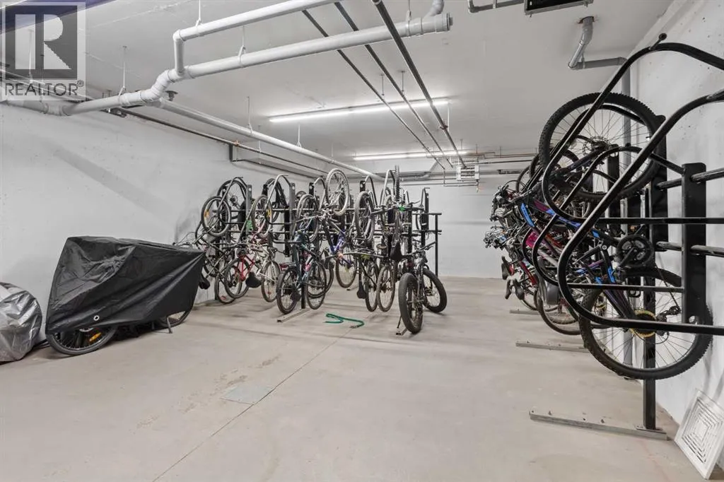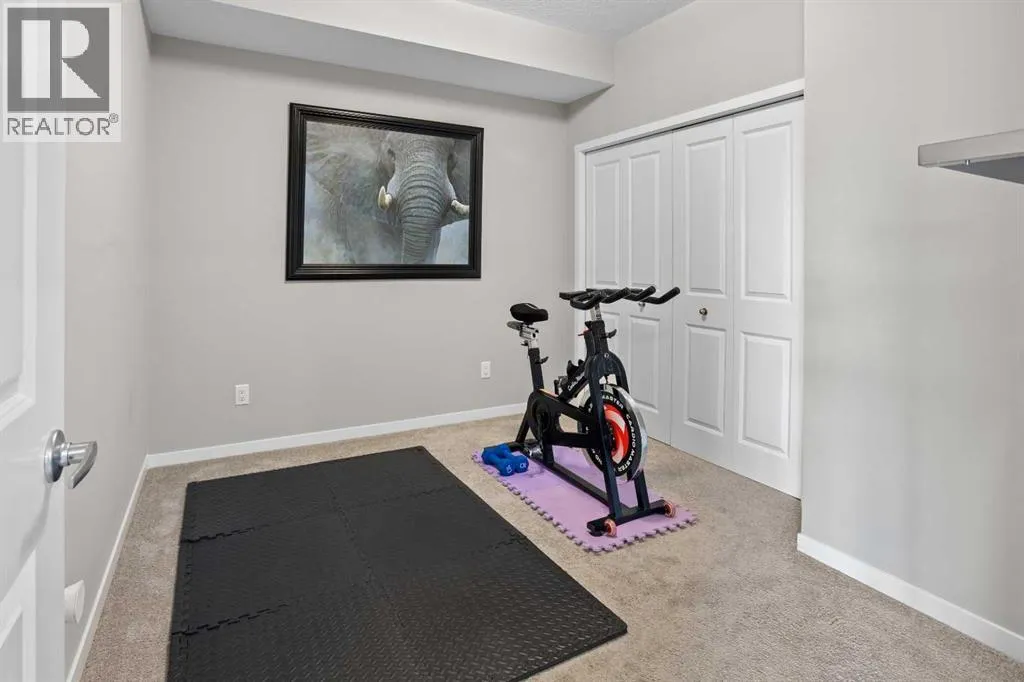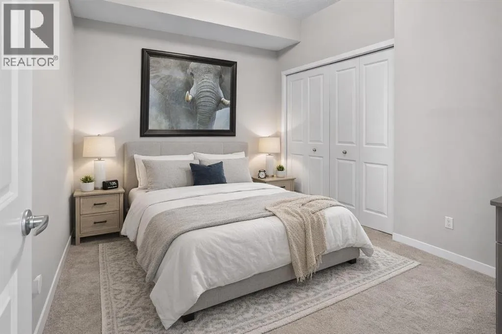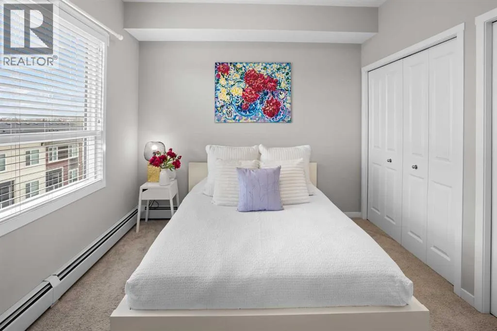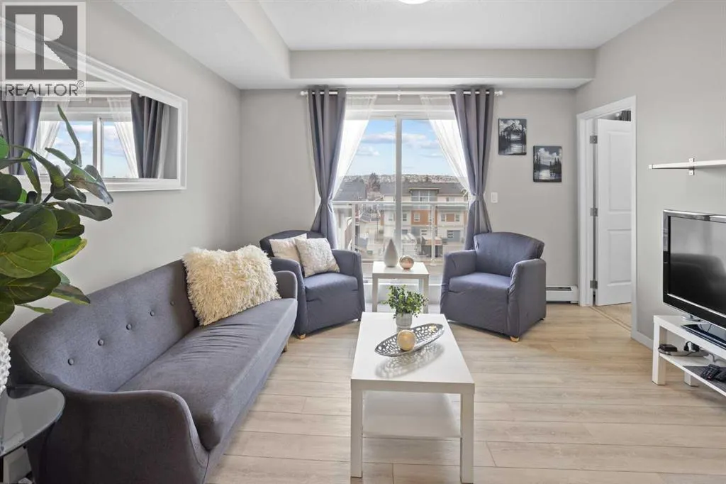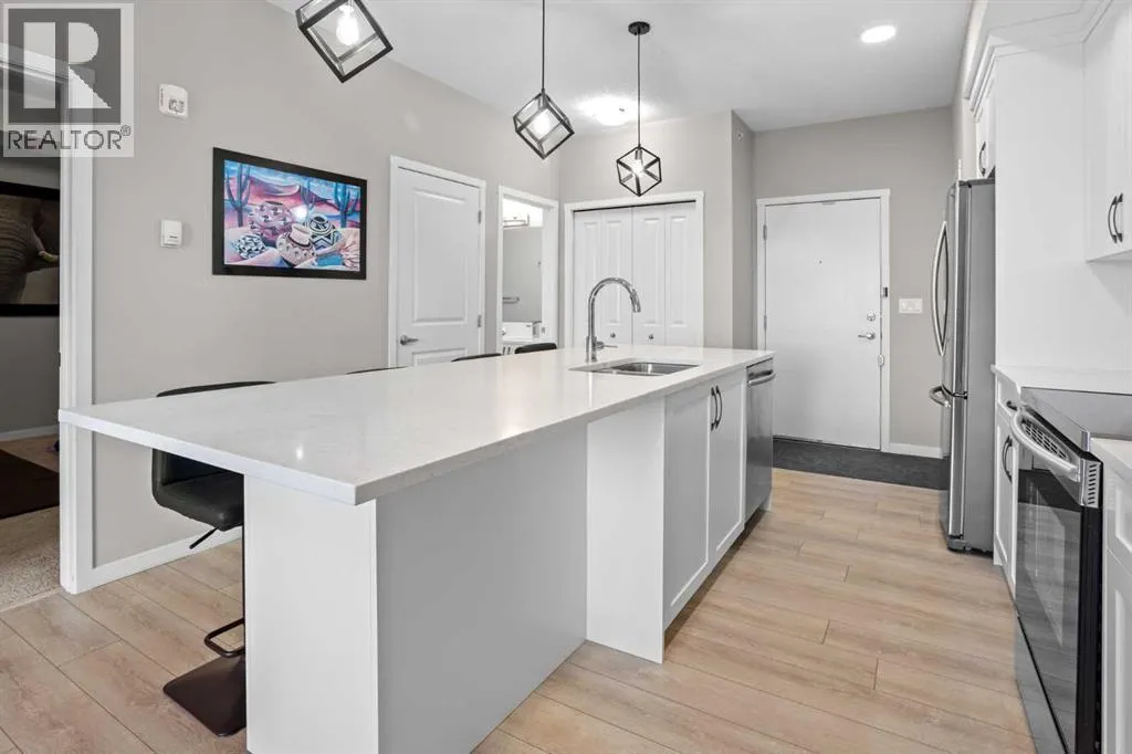 WATCH THE VIDEO! Rare and rarely available, this top-floor two-bedroom, one-bath condo at The Rise of Harvest Hills offers the strongest layout among the two-bedroom, one-bath floor plans in the building. Meticulously maintained by the original owner and showing like new, this home combines privacy, functionality, and natural light in a way that truly stands out.With nine-foot ceilings and west-facing windows, the space feels open, bright, and welcoming throughout the afternoon and evening. The open-concept kitchen anchors the layout with white shaker cabinetry, soft-close doors, extended-height uppers, quartz countertops, a mosaic tile backsplash, pendant lighting, and modern stainless steel appliances, including a full-size fridge and microwave hood fan. A unique two-sided island provides seating on one side and additional space on the other, perfect for a breakfast nook or casual dining.The kitchen flows seamlessly into a comfortable living room and out to the oversized west-facing patio. From here, enjoy distant downtown views and exceptional privacy. With no unit above and a courtyard-style outlook between nearby townhomes and visitor parking, the patio offers more openness and less direct exposure than many comparable units. A gas BBQ hookup makes outdoor entertaining easy.The primary bedroom features a west-facing window and a full wall of closets with generous storage. The second bedroom offers flexibility as a home office, nursery, gym, guest room, or dressing room. A spacious bathroom includes an oversized vanity with potential to convert to a double sink. Additional highlights include a full-size stacked washer and dryer, front hall closet, pantry storage, roughed-in AC, and luxury vinyl plank flooring.This home includes a titled heated underground parking stall and access to secured bike storage. Visitor parking and ample street parking are also available. The building does not allow short-term rentals, helping maintain a quiet and secure environ ment. Pets are permitted with board approval and restrictions. Condo fees were adjusted November 1, 2025. HOA fee is $131.25 annually.The Rise, an award-winning Cedarglen Living development, is surrounded by scenic walking paths, a pedestrian bridge, community ponds, tennis courts, parks, and a year-round driving range. Located just 10 minutes from Calgary International Airport, with quick access to Deerfoot Trail, Stoney Trail, and Country Hills Boulevard, the convenience is exceptional. Nearby amenities include three major shopping hubs featuring T&T Supermarket, Superstore, Sobeys, Canadian Tire, Home Depot, Shoppers Drug Mart, Landmark Cinemas, VIVO Recreation Centre, the public library, and the North Pointe transit hub. Seven schools serve the area, including North Trail High School (opened 2023).An ideal opportunity for first-time buyers, professionals, frequent travelers, downsizers, or investors seeking a move-in-ready property in a highly convenient north Calgary location. (id:27476)