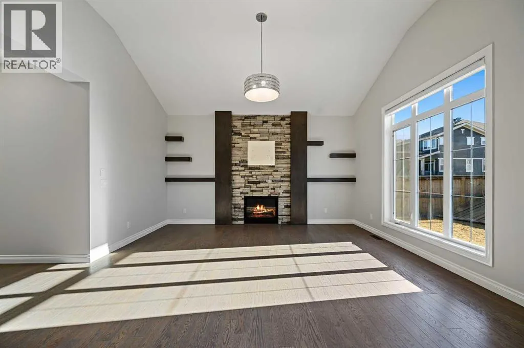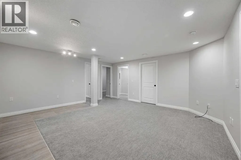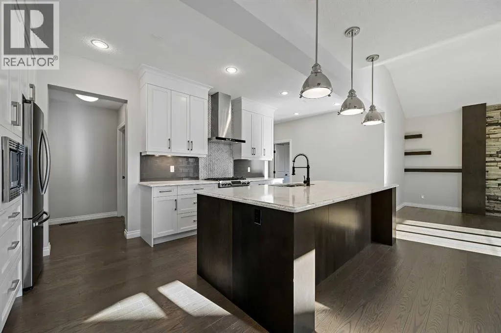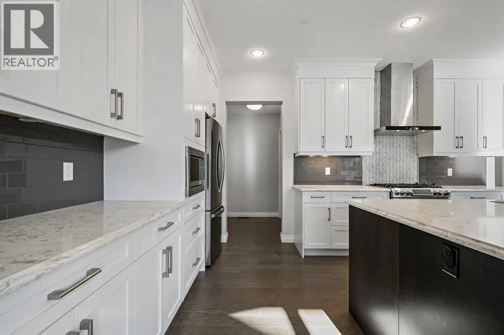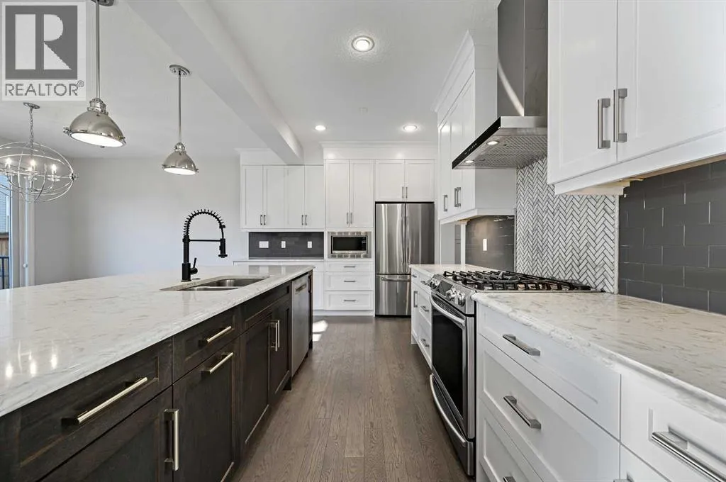 Rare 7-bedroom home is Situated on a premium corner-lot with ample parking and impressive curb appeal, This 2962 sq ft home combines size, flexibility, and thoughtful design in one of NW Calgaryâs most sought-after communities. Offering space, functionality, and versatility for large or multi-generational families. This beautifully designed home features a total of 7 bedrooms, including a RARE MAIN FLOOR BEDROOM paired with a full bathroomâideal for guests, extended family, or a home-based business setup. The main floor boasts a bright and spacious layout complete with a private office, expansive living room with vaulted Ceiling, and an open-concept kitchen and dining area perfect for entertaining. The living room is highlighted by a cozy gas fireplace with elegant maple built-in cabinetry, adding warmth and character to the space. The kitchen offers generous storage with two pantries, modern finishes, high cfm Sakura Hoodfan, Gas Cooktop, Stainless Steel Appliances and seamless flow into the dining area. A convenient mudroom provides practical everyday organization. Upstairs, youâll find 4 generously sized bedrooms, including a luxurious primary retreat featuring a large walk-in closet and a spa-inspired 5-piece ensuite with a Custom Shower and 10 Mil Shower Glass door. A full 4-piece bathroom serves the additional bedrooms. The massive bonus room offers endless possibilities for a media room, play area, or additional family lounge. A dedicated upper-floor laundry room adds everyday convenience. The fully developed basement expands your living space even further, offering 2 additional bedrooms, a spacious living area, a SECOND KITCHEN, an additional laundry area, and a versatile flex room that comes with a closet. Step outside to enjoy the large backyard and deck, ideal for summer gatherings and outdoor relaxation. . A must-see opportunity for growing families or savvy investors. Home also comes with A Brand NEW ROOF, 16x8 Garage door Fenced, Landscaped, Rado n Fan installed, storage Shed, bbq gas line, and built in garage shelving. Close to Schools, Shopping, Playground, Walking paths and easy access to major roads. (id:27476)