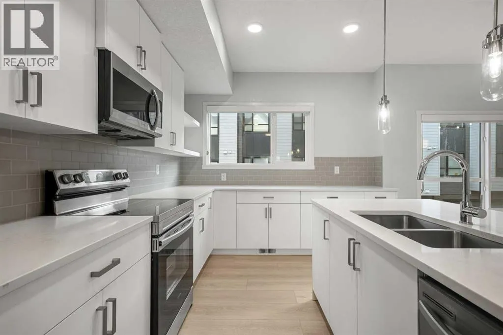 Welcome to Seton Serenity, an exceptional residence in one of Calgaryâs most coveted communities, masterfully crafted by the award-winning CedarGlen Living. Offering nearly 1,748.55 sqft of refined living space, this exquisite 3-bedroom, 2.5-bathroom home blends timeless sophistication with modern comfort. Soaring 9' ceilings, expansive windows, and luxury vinyl plank flooring set the stage for an airy, light-filled interior. The north-facing balcony frames captivating views of the tranquil wet pond, creating a seamless connection between indoor comfort and outdoor serenity. The chef-inspired kitchen is nothing short of spectacular, featuring chic white cabinetry, gleaming quartz countertops, a designer subway tile backsplash, premium stainless-steel appliances, and an expansive island with seatingâperfect for both intimate dinners and lavish entertaining. Flowing effortlessly into the dining area and spacious living room, the open layout invites gatherings with an air of refinement. The upper level is crowned by the sumptuous primary suite, a private retreat with a large walk-in closet and a spa-like 4-piece ensuite adorned with dual vanities, quartz counters, and an oversized glass-enclosed shower. Two additional bedrooms provide versatile space for children and guests, accompanied by a beautifully appointed 4-piece bath and the convenience of upper-level laundry. The lower level features a large space that can accommodate a home office or gym, while the attached double side-by-side garage offers security and ease. Just steps away, indulge in world-class amenities including the largest YMCA in North America, the renowned South Health Campus, boutique shopping, gourmet dining, and vibrant cafés. This is more than a homeâit is a statement of luxury, comfort, and lifestyle in the heart of Seton. (id:27476)