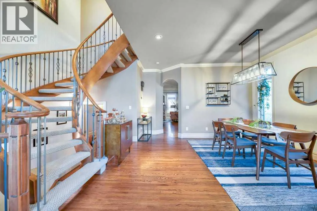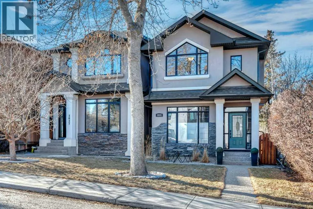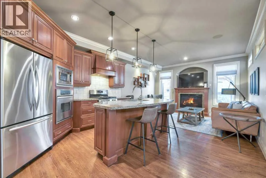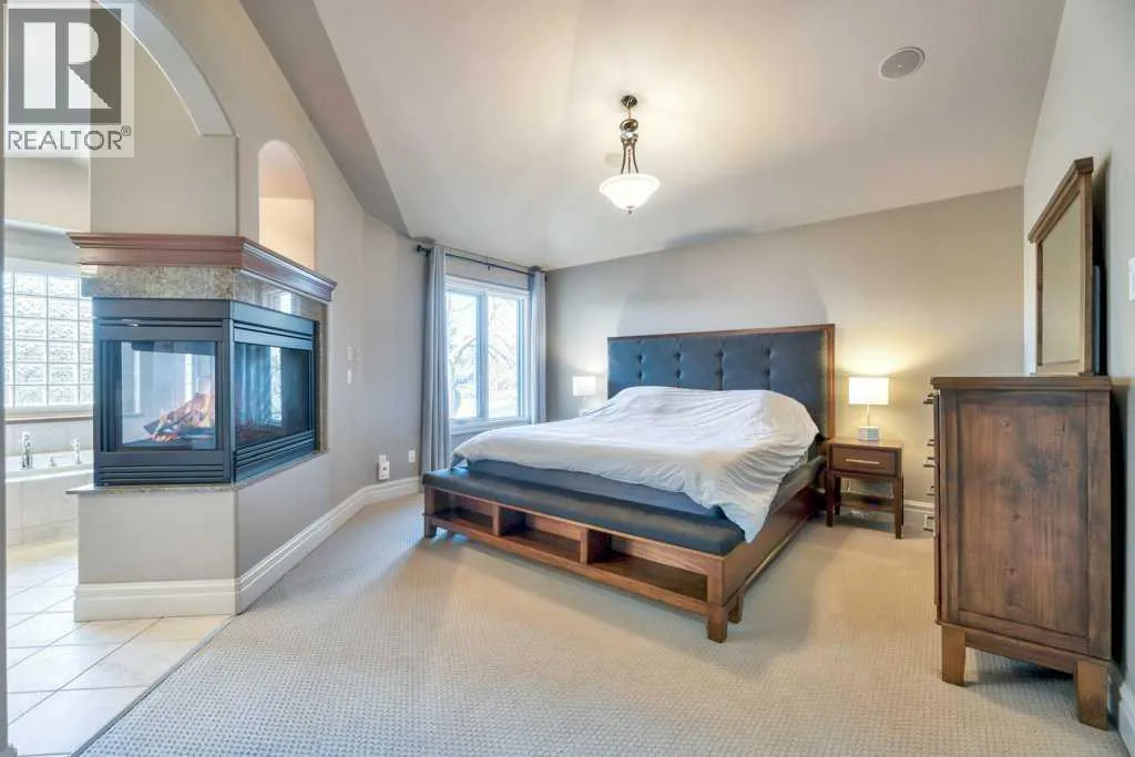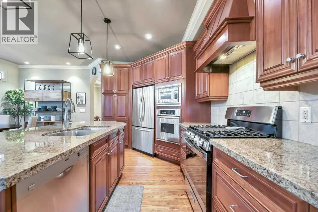 This beautifully crafted custom home showcases timeless architecture, refined finishes, and a highly functional layout, ideally situated on a quiet street with convenient access to schools, parks, and transit. Designed for both elegant entertaining and comfortable everyday living, this residence offers an exceptional balance of style and substance. The inviting foyer opens to formal living and dining areas highlighted by gleaming hardwood floors and soaring 9-foot ceilings, setting a sophisticated tone throughout the open-concept main level. The chef-inspired kitchen is a standout, featuring granite countertops, an oversized central island, stainless steel appliances including a new gas range (2023), wall oven, and tiled backsplash. The kitchen flows seamlessly into the dining nook and family room with fireplace, creating an ideal space for hosting or relaxed evenings at home. A striking curved staircase leads to the vaulted upper level, where the king-sized primary retreat offers a true executive escape. The spa-inspired ensuite features double sinks with granite counters, a soaker tub, a large separate tiled shower, and a three-sided fireplace shared with the bedroom. A generous walk-in closet completes this private sanctuary. Two additional well-appointed bedrooms and a full 4-piece bathroom complete the upper floor. The fully developed basement extends the living space with a bright family and recreation room, an additional spacious bedroom, and a full bathroomâideal for guests, a home office, or extended living. A newer mudroom addition (2022) leads to a professionally designed deck with pergola, also completed in 2022, offering an elegant outdoor setting for entertaining and relaxation. The landscaped yard, paved lane, and double detached garage provide both functionality and convenience. Meticulously maintained with extensive upgrades, this home reflects true pride of ownership, including new shingles, downspouts, and gutter guards (June 2025), a new electric al panel and wiring (Nov 2025), updated main-floor lighting (Apr 2021), and new upstairs and basement bathroom fixtures (July 2024). A complete list of improvements is available in the Supplements. An exceptional opportunity for the discerning buyer seeking quality, comfort, and quiet sophisticationâbook your private showing today. (id:27476)