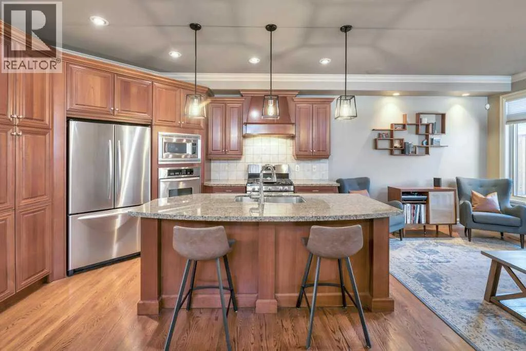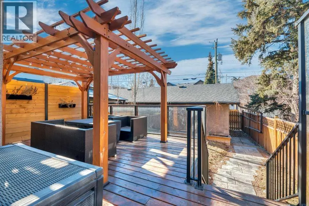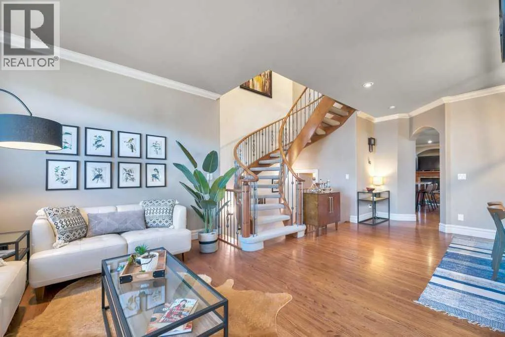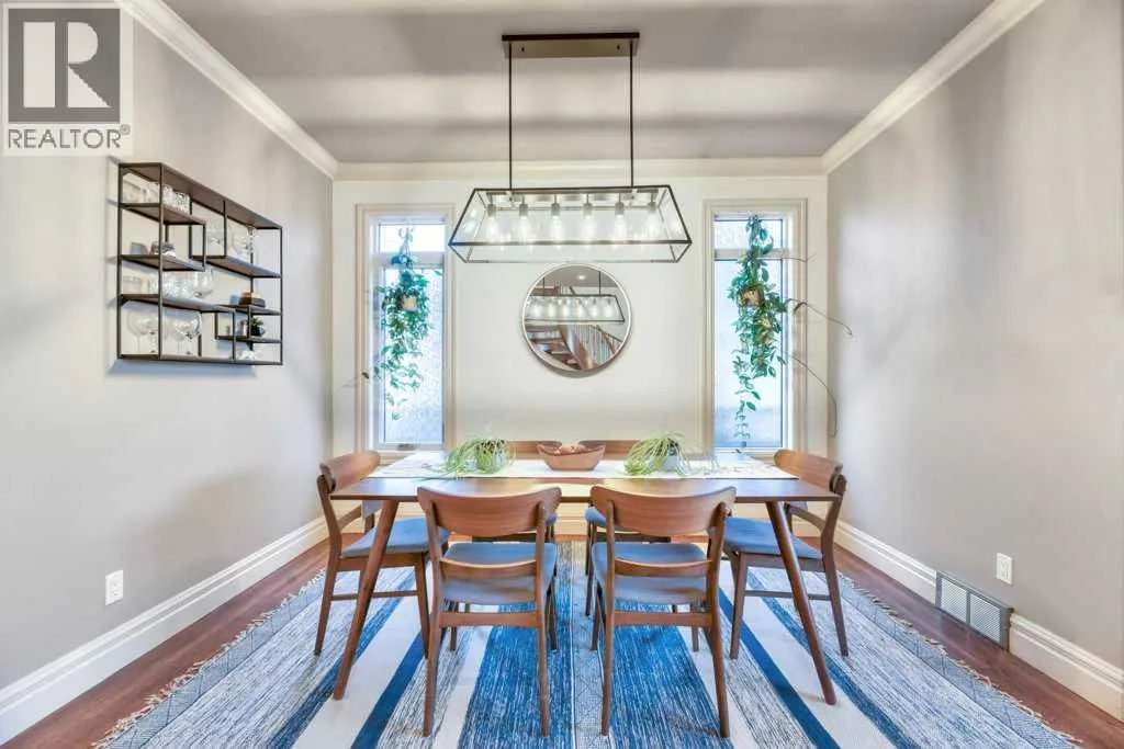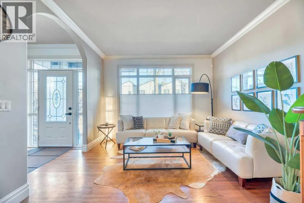 This beautifully crafted custom home showcases timeless architecture, refined finishes, and a highly functional layout, ideally situated on a quiet street with convenient access to schools, parks, and transit. Designed for both elegant entertaining and comfortable everyday living, this residence offers an exceptional balance of style and substance. The inviting foyer opens to formal living and dining areas highlighted by gleaming hardwood floors and soaring 9-foot ceilings, setting a sophisticated tone throughout the open-concept main level. The chef-inspired kitchen is a standout, featuring granite countertops, an oversized central island, stainless steel appliances including a new gas range (2023), wall oven, and tiled backsplash. The kitchen flows seamlessly into the dining nook and family room with fireplace, creating an ideal space for hosting or relaxed evenings at home. A striking curved staircase leads to the vaulted upper level, where the king-sized primary retreat offers a true executive escape. The spa-inspired ensuite features double sinks with granite counters, a soaker tub, a large separate tiled shower, and a three-sided fireplace shared with the bedroom. A generous walk-in closet completes this private sanctuary. Two additional well-appointed bedrooms and a full 4-piece bathroom complete the upper floor. The fully developed basement extends the living space with a bright family and recreation room, an additional spacious bedroom, and a full bathroomâideal for guests, a home office, or extended living. A newer mudroom addition (2022) leads to a professionally designed deck with pergola, also completed in 2022, offering an elegant outdoor setting for entertaining and relaxation. The landscaped yard, paved lane, and double detached garage provide both functionality and convenience. Meticulously maintained with extensive upgrades, this home reflects true pride of ownership, including new shingles, downspouts, and gutter guards (June 2025), a new electric al panel and wiring (Nov 2025), updated main-floor lighting (Apr 2021), and new upstairs and basement bathroom fixtures (July 2024). A complete list of improvements is available in the Supplements. An exceptional opportunity for the discerning buyer seeking quality, comfort, and quiet sophisticationâbook your private showing today. (id:27476)