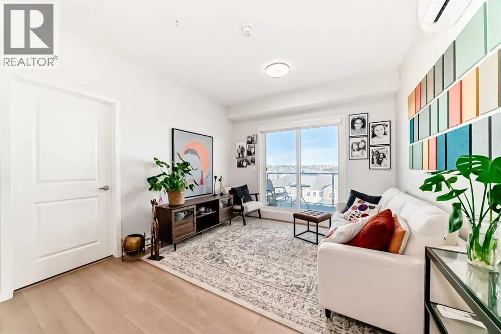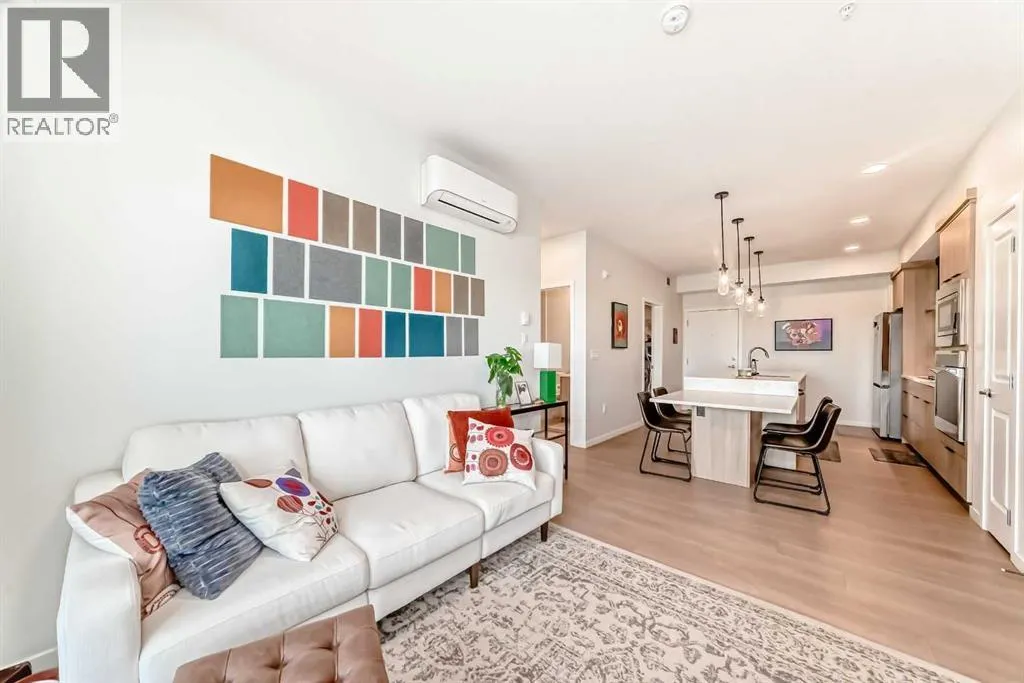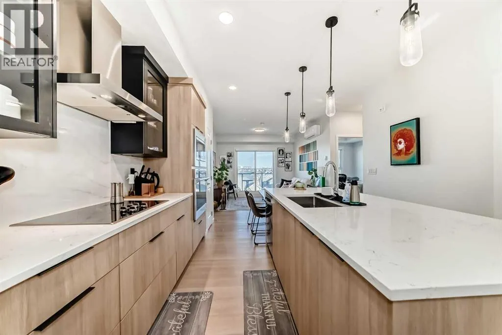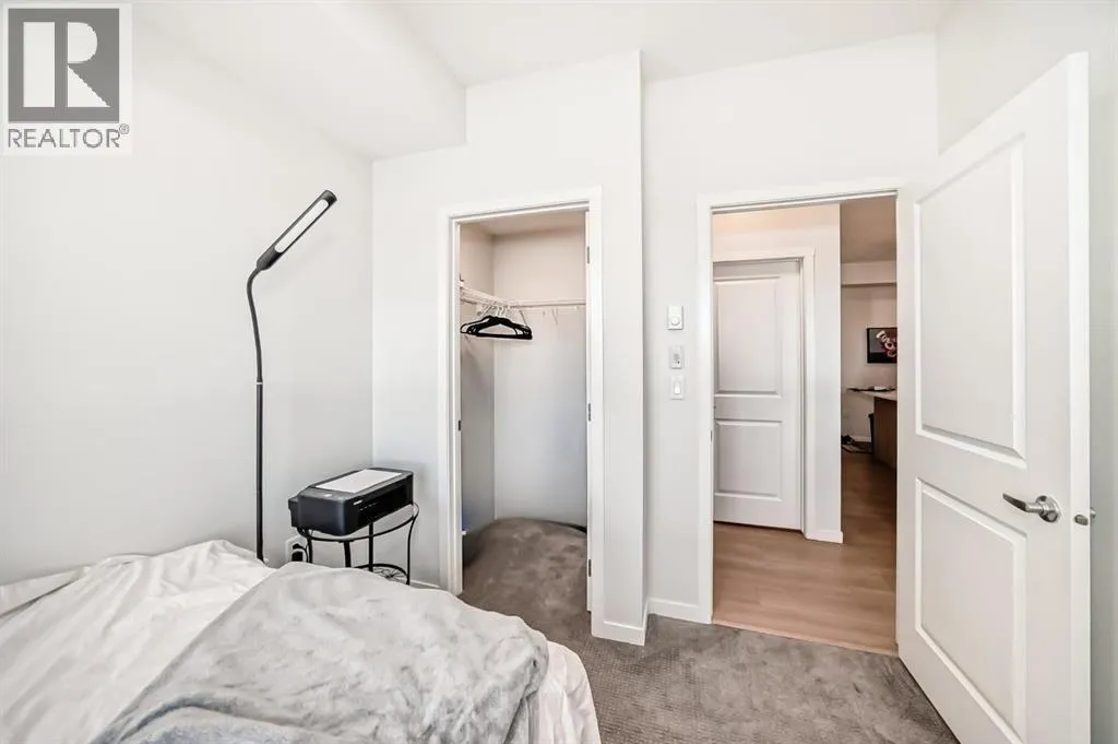 If you have been searching for a modern condo in NW Calgary that does not feel cookie-cutter, this is it. Located in Carrington, this TOP-FLOOR home gives you privacy, light, and a clean contemporary design. Built in 2022 by Cedarglen, this 860+ sqft condo was designed for real life. Not just photos. The kitchen is upgraded and finished with TWO-TONE CABINETS to the ceiling, GLASS-FRONT UPPERS, QUARTZ COUNTERS, a BUILT-IN OVEN and microwave, a cooktop with HOOD FAN and a CUSTOM BUILT-IN DINING area. It feels sleek, modern, and intentional, perfect for hosting. This 2 BED / 2 BATH layout offers separation and function. The primary bedroom has an ensuite with DOUBLE VANITY, walk-in shower and a massive WALK-IN CLOSET. The second bedroom has its own WALK-IN CLOSET too, and is adjacent to the guest bath. The huge LAUNDRY ROOM offers serious storage. You also get A/C, titled underground PARKING and a separate STORAGE LOCKER. No sweating in the summer. No scraping snow in winter. No clutter in your living space. TOP FLOOR means no one above you. More peace. More quiet. Nearby GREENWAY PARK offers playgrounds, a basketball court, a skate park, art installations, and access to the Rotary Mattamy Greenway trail system. In fact, there are about 65 acres of green space and connected pathways making it easy to stay active. The SHOPS OF CARRINGTON GREEN, with groceries, restaurants, and professional services, are literally at your doorstep. Quick routes to major roadways and future Green Line LRT expansion make commuting simple. Stop settling for average condos. This one checks all the boxes. (id:27476)