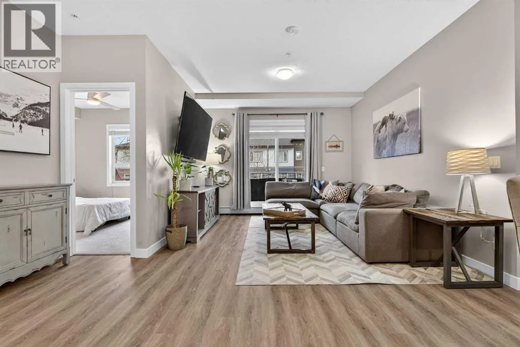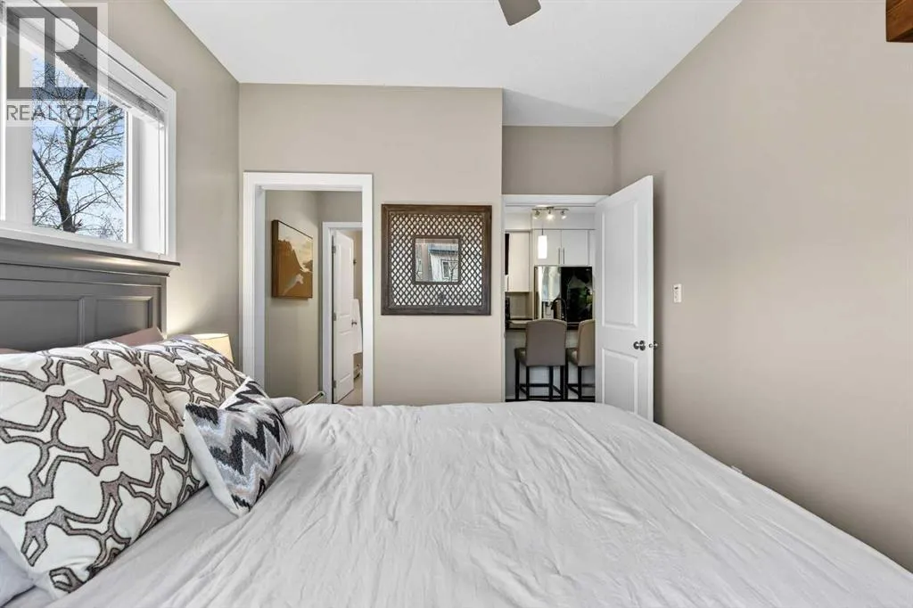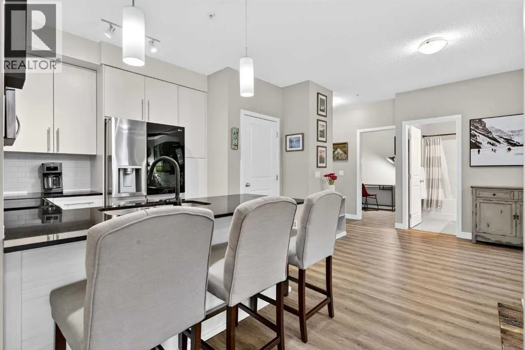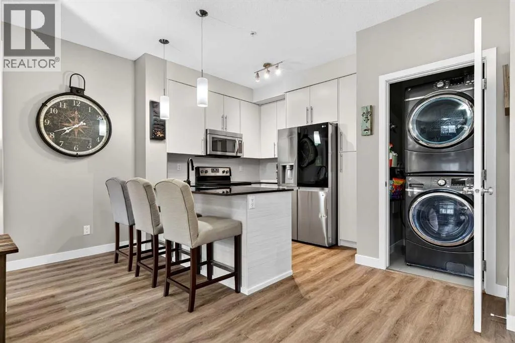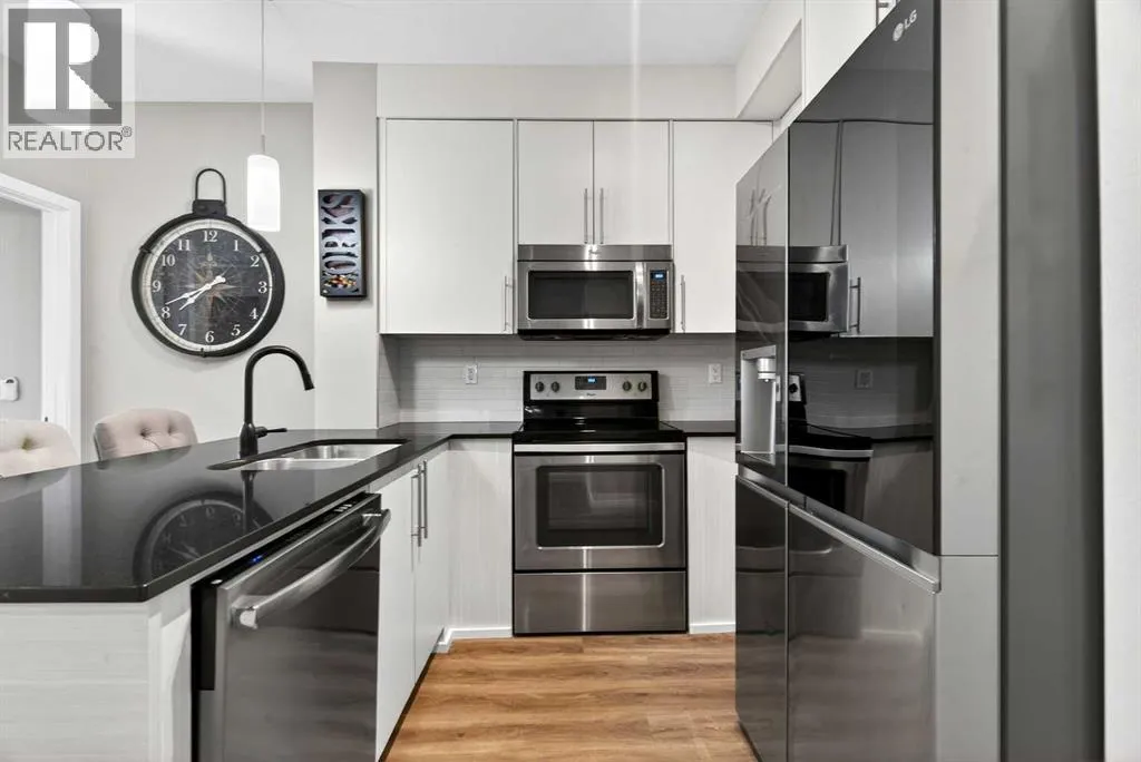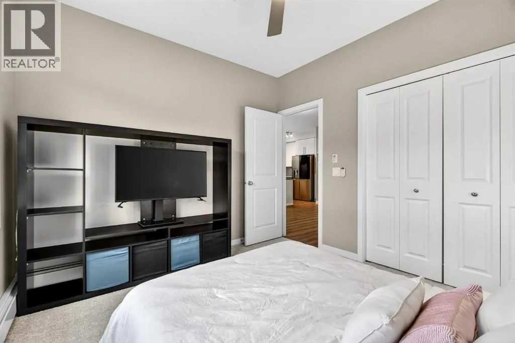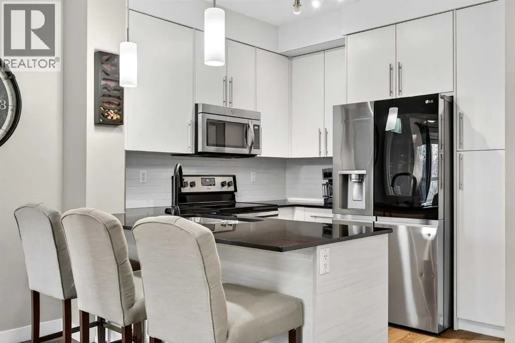 ** Be sure to watch the full cinematic home tour of this stunning home** Elevate your lifestyle in this stunning corner-unit showcase! perfectly positioned in a sought-after Southwest Calgary community. Boasting a spacious 2-bedroom, 2-bathroom PLUS DEN layout, this home is a masterclass in privacy and open-concept design.From the moment you enter, you are greeted by airy 9-foot ceilings and an abundance of natural light. The chef-inspired kitchen is the heart of the home, featuring gleaming quartz countertops, premium stainless-steel appliances, and a sleek breakfast bar that screams "entertainerâs dream." Flow effortlessly from the dedicated dining area to the living room, where sliding glass doors unveil your private east-facing balcony. Itâs the ultimate spot to sip your morning coffee while overlooking the serene courtyard.The smart split-bedroom layout ensures maximum privacy. The primary suite is a true retreat with a massive walk-through closet and a pristine 4-piece ensuite. Across the unit, the second bedroom serves as an ideal guest suite with easy access to a full bath, while the versatile den offers the perfect solution for a home office or hobby room.The Cherry on Top? This unit comes with TWO titled parking stallsâa rare find that adds incredible value! Located in a pet-friendly building with elevator access, bike storage, and a nearby dog park, you are minutes from downtown, major roads, and top-tier amenities. This is more than a condo; itâs the home youâve been waiting for. (id:27476)