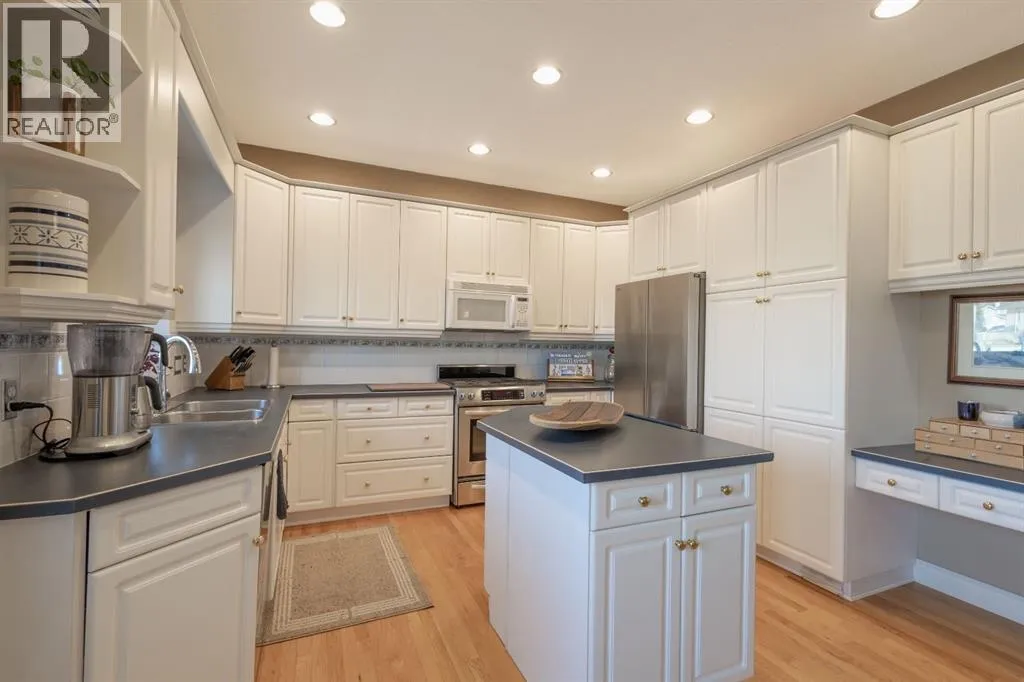 Welcome to this beautifully maintained home situated on a desirable corner lot on a quiet cul-de-sac with a fully fenced backyard, perfect for families and outdoor enjoyment. Thoughtfully updated and well cared for, this property offers triple-pane windows, a newer furnace, air conditioning, and a convenient parking pad in the back. Step inside to a bright and spacious living room featuring stunning panoramic windows that flood the space with natural light and highlight the beautiful hardwood flooring. The living room flows seamlessly into the open dining area, creating a wonderful space for entertaining and everyday meals. The kitchen is both functional and welcoming, complete with an island, stainless steel appliances, and a window above the sink overlooking the backyard. An adjacent eating nook provides direct access to a great-sized west facing deck and the yardâideal for summer barbecues and relaxing evenings outdoors. Continuing on this level the spacious primary bedroom offers a walk-in closet and a gorgeous fully renovated 4-piece ensuite featuring a stand-alone shower, soaking tub, in-floor heating and skylight for added natural light. Two additional bedrooms share a beautifully renovated 4-piece bathroom, offering comfort and style for family or guests. The fully developed basement expands your living space with a large family room with impressive oversized windows and a corner fireplace with a wooden mantle and tile surround, perfect for cozy evenings in. Three additional bedrooms share a beautiful 4-piece bathroom complete with dual vanities, a stand-alone shower, and in-floor heating. Laundry is conveniently located on this level as well. With its thoughtful layout, modern updates, and prime corner lot location, this home offers the perfect combination of comfort, space, and functionality. (id:27476)