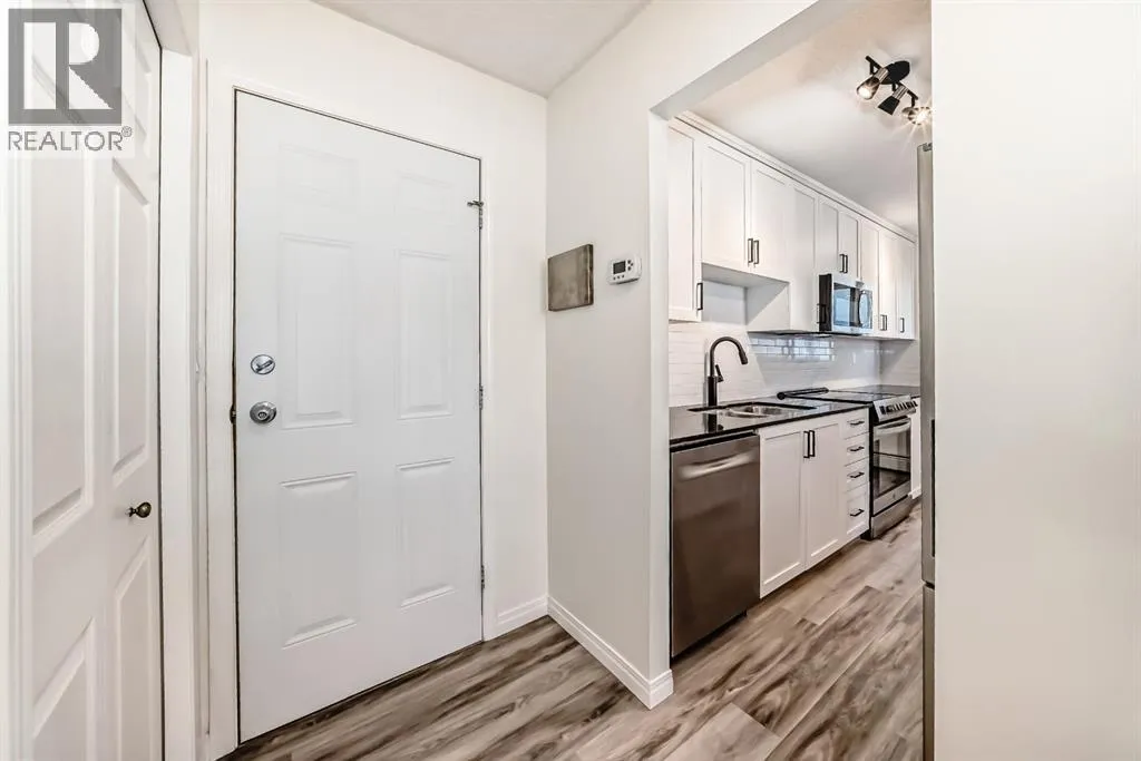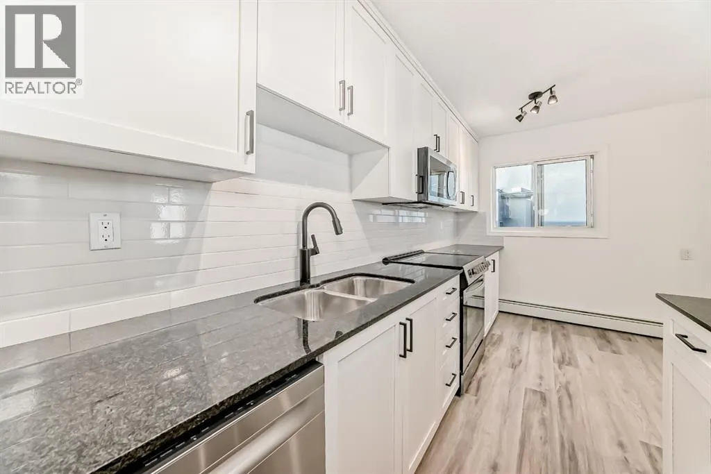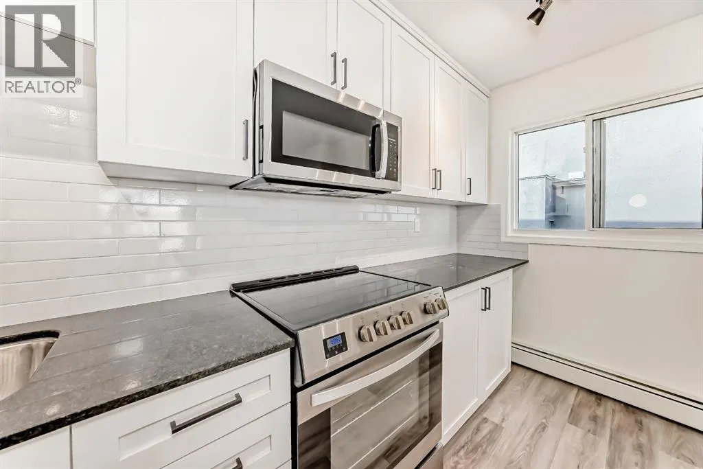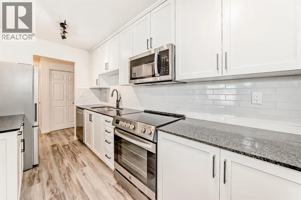 Presenting a turn-key opportunity at Larch Manor: a top-floor residence that has been updated to offer immediate comfort and sophisticated urban living. Upon entry, you are welcomed by fresh paint and brand new luxury vinyl plank flooring that flows seamlessly throughout the open concept layout. The recently renovated kitchen is both functional and refined, featuring full-height cabinetry, gleaming granite countertops, and a suite of brand new stainless-steel appliances highlighted by an induction convection stove. The adjacent living room is generously proportioned and opens onto a private patio where you can enjoy picturesque views of the Calgary Tower and downtown skyline. The home offers two spacious bedrooms, a well-appointed 4-piece bathroom, and the added convenience of a large storage room that discreetly houses a European combination washer and dryer. Beyond the interior, this home boasts one of the most desirable parking stalls in the complexâfully covered and positioned directly at the back entry for unparalleled ease of access. Situated just two blocks from the heart of 17th Avenue, Larch Manor places you moments from Calgaryâs finest boutiques, dining, and lifestyle amenities, all while maintaining an impressive walkability score and effortless connectivity to the rest of the city. Ideal for the discerning first-time buyer or anyone seeking a truly move-in ready home, this property is a rare find. Contact your favourite agent to schedule your private viewing. (id:27476)