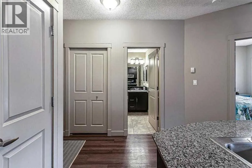 Welcome to this beautifully maintained second-floor, one-bedroom condo in the highly sought-after community of Garrison Green. Located in a quiet concrete building, this home offers excellent sound insulation and peaceful living. The unit features an open-concept layout highlighted by a modern kitchen with granite countertops, stainless steel appliances, pantry storage, laminate flooring, and impressive 9-foot ceilings. The bright and spacious bedroom overlooks the tranquil inner courtyard, while the upgraded bathroom includes a granite countertop and a full tub and shower combination. As a desirable corner unit, the home also features a generously sized private deck with bbq gas line with relaxing courtyard views, in-suite laundry, and convenient elevator access just steps from the titled underground parking stall. For added ease, the garbage and recycling room, along with the loading dock for simple move-ins and move-outs, are located just down the hall. Residents enjoy a fantastic selection of amenities designed to enhance everyday living, including a well-equipped fitness centre, an entertaining and party room, two guest suites for visiting family and friends, heated underground visitor parking, secure bike storage, a library, professional onsite management, and a beautifully landscaped central courtyard. Reasonable condo fees provide excellent value by including all utilities except internet. The surrounding neighbourhood offers picturesque tree-lined streets, parks, and green spaces and is within walking distance to Mount Royal University. Commuting is convenient with quick access to Glenmore Trail, Crowchild Trail, and Stoney Trail. Shopping, dining, and entertainment are just minutes away at Chinook Centre and Westhills Towne Centre. This exceptional condo offers the perfect balance of comfort, convenience, and vibrant community living. Pet Policy: One pet per home with a maximum weight of 50 lbs. Schedule your private viewing today! (id:27476)