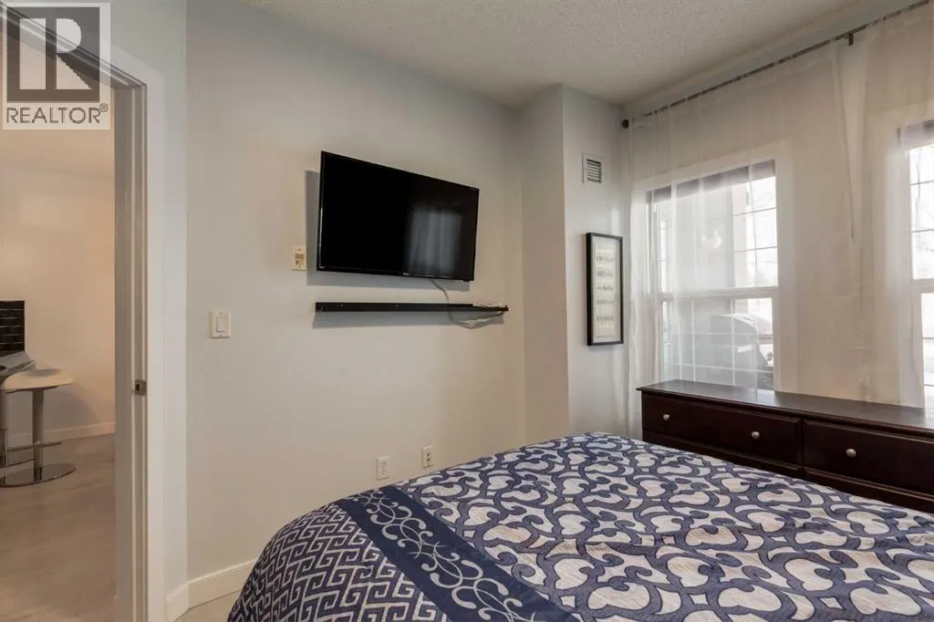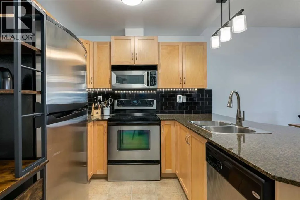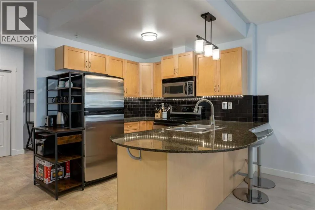 Live in the award-winning Calgary condo of the year 2025 at Gateway Southcentre. This expansive one-bedroom plus den unit offers nearly 700 square feet of functional living space that has been freshly updated with modern laminate flooring and new paint throughout. The bright, open-concept layout features a kitchen equipped with timeless maple cabinetry, stainless steel appliances, and quartz countertops with a breakfast bar.The living area extends naturally to the patio, which is perfect for summer barbecues and outdoor relaxation. Pet owners will particularly appreciate this location, as the main-floor unit provides direct access from your patio to the sidewalk, making morning walks effortless. The primary bedroom is generously scaled with a walk-in closet, complemented by a four-piece bath and a dedicated den that serves as an ideal home office.This property comes complete with in-suite laundry, titled underground parking, and an assigned storage area. The building offers efficient geothermal heating and cooling alongside premium amenities including a fitness center, guest suites, a party room, and underground visitor parking. Located within walking distance to the trendy shops and restaurants in Avenida and Southcentre Mall, this home offers easy access to major roads and urban conveniences. (id:27476)