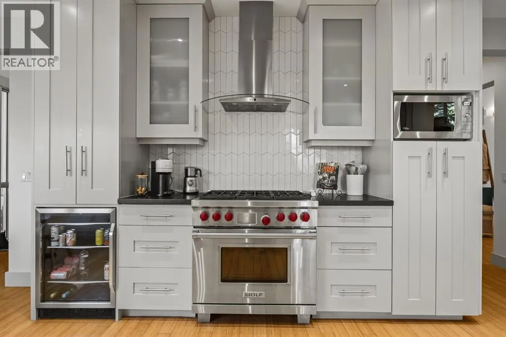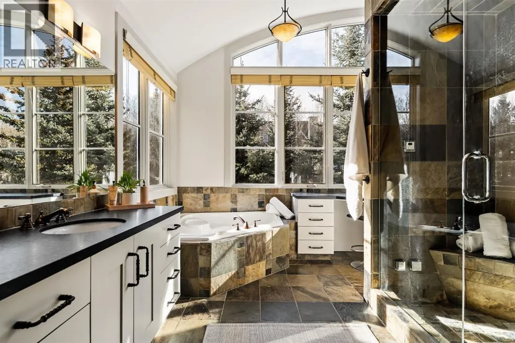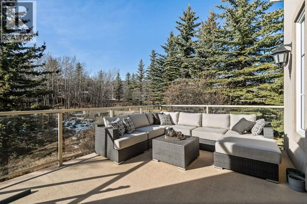 Welcome to this exceptional villa in the exclusive gated enclave of Sussex Green. This desirable end unit offers nearly 5,000 sq ft of beautifully developed living space and a rare walkout lower level, all set against a stunning ravine backdrop surrounded by mature trees, nature and winding pathways. Extensively updated, this home showcases a timeless, bright and airy design with vaulted ceilings and a one-of-a-kind layout not found elsewhere in the complex. A distinct West Coast feel is evident throughout, with expansive windows that invite the outdoors in and flood the home with natural light. The main level features hardwood flooring throughout, a spacious open-concept living and dining area anchored by a striking gas fireplace, and seamless flow into a chefâs kitchen complete with top-of-the-line appliances and a sunlit breakfast nook. An office just off the living room provides the perfect work-from-home retreat. The primary bedroom is conveniently located on the main floor, creating an ideal downsizing or executive layout. Two balconies offer multiple outdoor spaces to relax and take in the serene surroundings. Upstairs, youâll find two large bedrooms with a shared bathroom along with a versatile flex space ideal for a lounge, studio or additional workspace. The walkout lower level features polished concrete flooring, a spacious media and games room, an additional bedroom and full bathroom â perfect for guests or extended family. Completed by a double attached garage and ideally located close to schools, shopping and amenities, this is a rare opportunity to own in one of the areaâs most coveted gated communities. (id:27476)