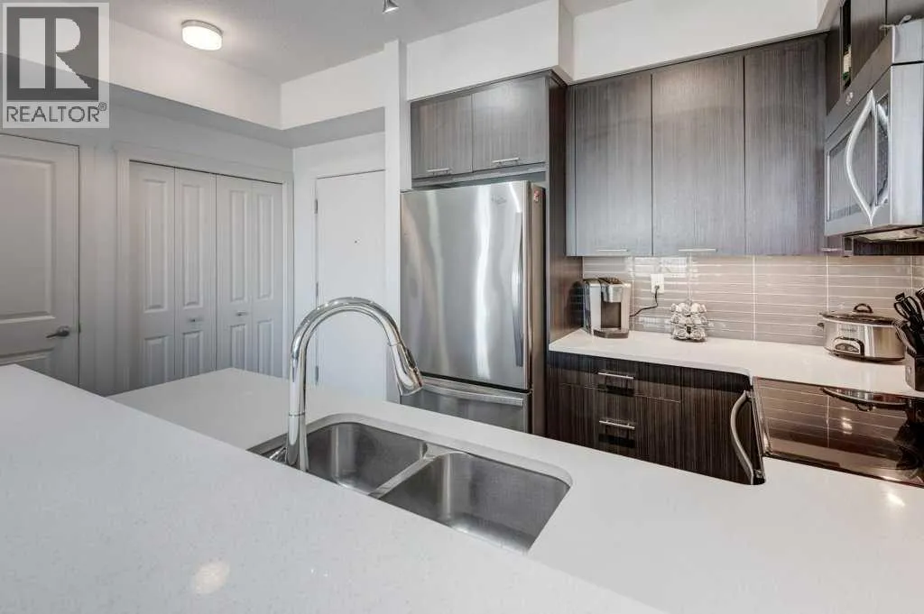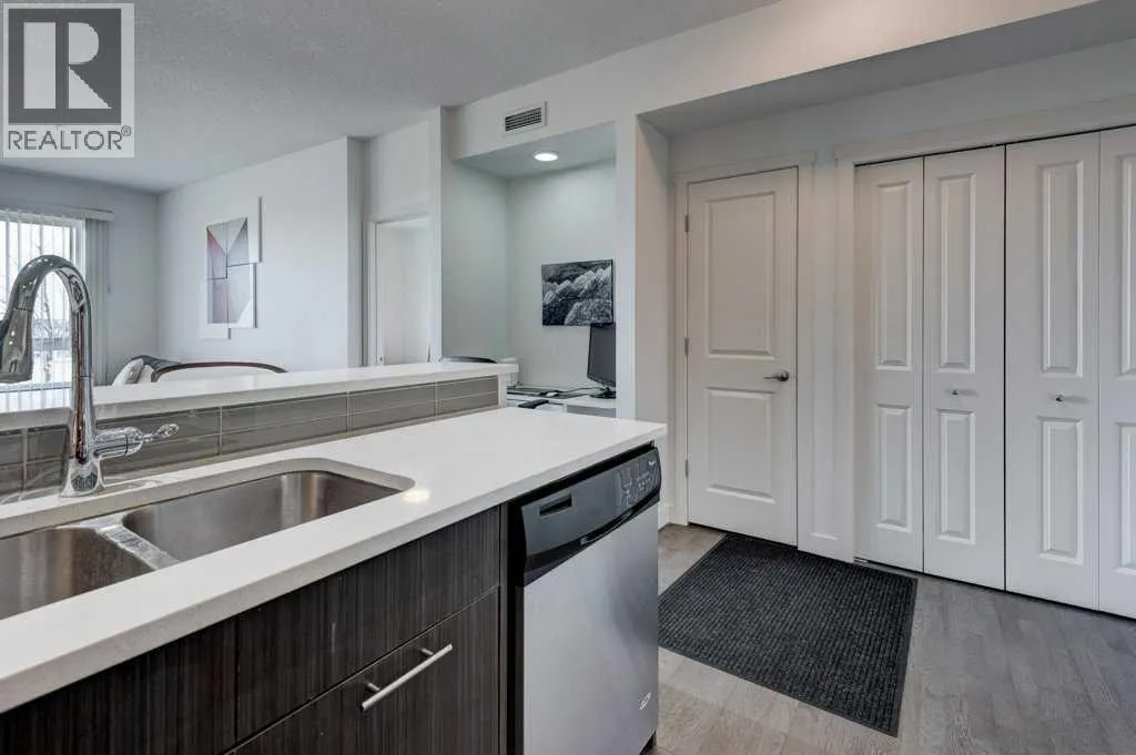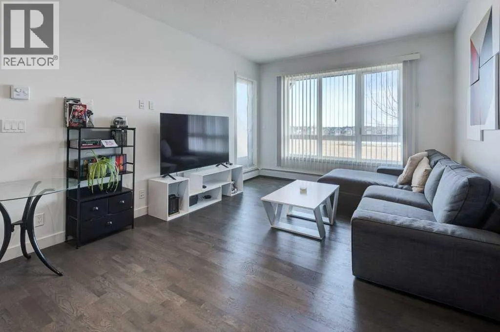 Welcome to this beautifully maintained, original-owner 2-bedroom, 2-bathroom main floor condo in the heart of Silverado! Perfectly positioned and backing onto a serene greenspace, this home offers the ideal blend of privacy, comfort, and convenience in one of Calgaryâs most family-friendly communities.Step inside to discover 9-foot ceilings and oversized windows that fill the space with natural light. Engineered hardwood flooring runs throughout, complemented by elegant quartz countertops and stainless steel appliances in the modern kitchenâperfect for everyday living and entertaining alike.The spacious primary bedroom easily accommodates a king-size bed and features a walkthrough closet leading to a private 3-piece ensuite. The generously sized second bedroom includes a large walk-in closet, making it ideal for guests, family, or a home office. A well-appointed 4-piece main bathroom provides added comfort and functionality for residents and visitors. A convenient stackable laundry closet and a workstation nook completes the thoughtful interior layout.Step outside to your private patio backing directly onto greenspaceâan inviting outdoor retreat for morning coffee or evening relaxation.Additional highlights include an assigned storage locker located directly in front of your titled parking stall, which is equipped with an electric car charger. Enjoy easy access to major roadways and nearby amenities, along with close proximity to schools, playgrounds, scenic pathways, and beautiful green spaces.Move-in ready, clean and meticulously cared for, this exceptional condo truly embraces Silveradoâs welcoming, family-oriented lifestyle. This is one you wonât want to miss! (id:27476)