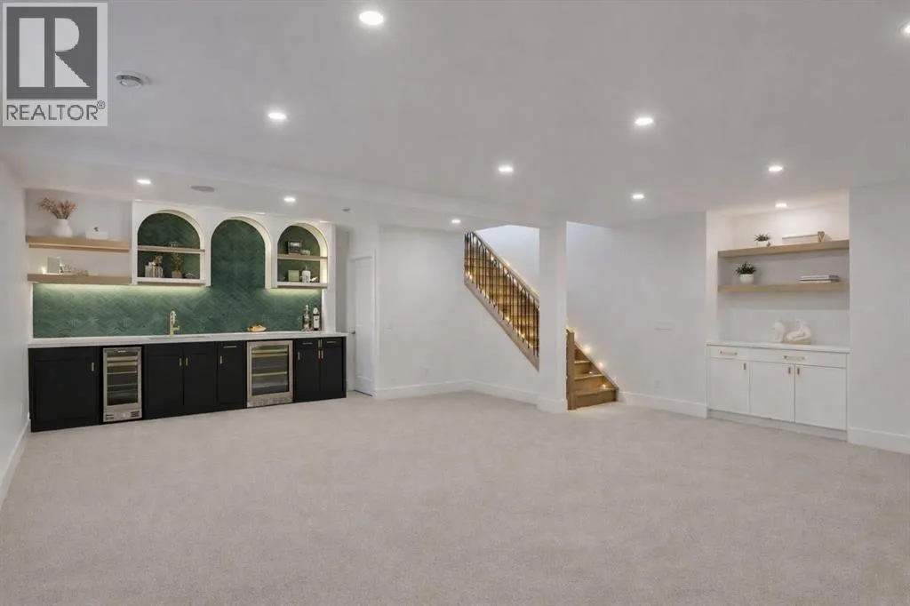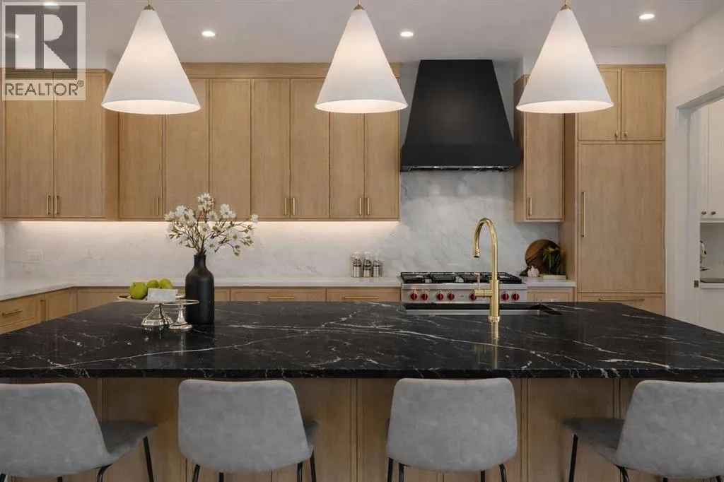 Welcome to the highly sought-after community of Banff Trail, where inner-city convenience meets modern luxury living. This brand-new residence showcases exceptional craftsmanship, thoughtful design, and elevated finishes just minutes from downtown Calgary, the University of Calgary, Foothills Hospital, LRT access, parks, and local amenities.Designed for both elegance and functionality, this home offers 5 bedrooms + 5 bathrooms and a spacious open-concept layout ideal for everyday living and entertaining. Engineered oak hardwood flooring spans all three levels, complemented by a sunny south-facing backyard that fills the home with natural light and sought after TRIPLE Garage.Upon entry, a bright front office with glass-paneled doors provides the perfect work-from-home space. The main floor unfolds into the heart of the home â a chef-inspired kitchen featuring custom cabinetry, dual paneled fridge/freezer units, a premium gas range, paneled dishwasher, a large waterfall island, and a fully outfitted custom walk-through butlers pantry. The adjoining living room invites gatherings around the striking gas fireplace while oversized windows overlook the landscaped yard and oversized deckUpstairs, the HUGE luxurious primary retreat impresses with vaulted ceilings bright sunny south exposure. The spa-like ensuite boasts a freestanding soaker tub, steam shower, dual vanities with extended counter space, and heated tile floors. Two additional spacious bedrooms each feature tray ceilings, walk-in closets and private ensuites. A well-designed laundry room with hanging racks and ample storage completes the upper level.The fully developed lower level is built for lifestyle flexibility, offering a large recreation room, games area, storage, and a wet bar with beverage/wine chillers â perfect for entertaining. Two additional bedrooms (or gym/office options) and a full custom bathroom provide excellent accommodation for guests or growing families. Outside, enjoy a sunny s outh-facing backyard and a rare TRIPLE detached garage, offering abundant space for vehicles, storage, and hobbies.An exceptional opportunity to own a beautifully crafted home in one of NW Calgaryâs most desirable inner-city neighborhoods â Book your private showing today! (id:27476)