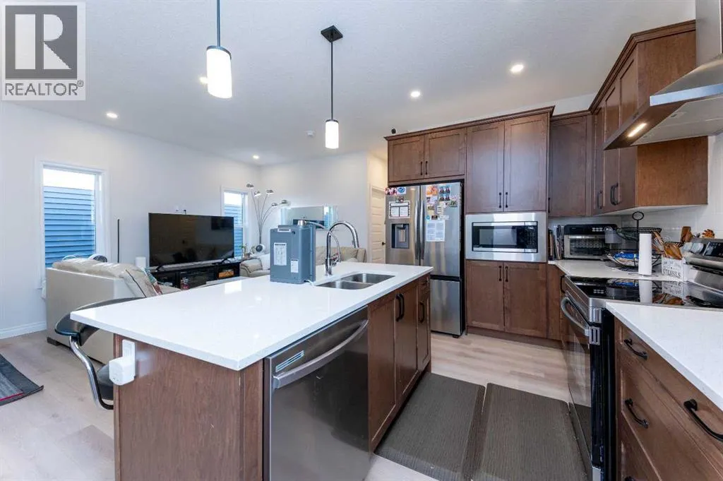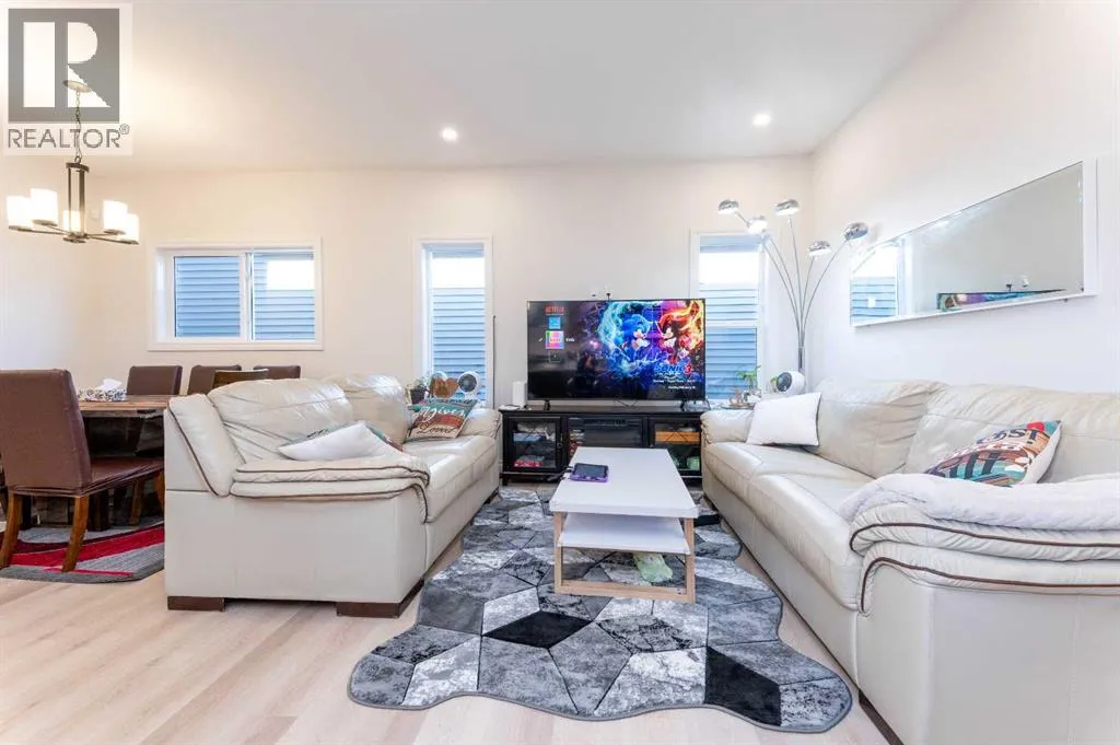 Welcome to this impressive newly built detached home offering exceptional space, functionality, and investment potential in the thriving community of Homestead. Featuring a double front-attached garage and a thoughtfully planned layout, this residence delivers five bedrooms and three full bathrooms across three fully developed levels. The main floor is designed to impress with its bright, open-concept configuration and seamless flow. The contemporary kitchen serves as the heart of the home, showcasing a large center island, modern cabinetry, ample counter space, and a spacious walk-in pantry. The adjoining dining and living areas provide a comfortable yet elegant setting for both entertaining and everyday family life. Two generously sized bedrooms and a full four-piece bathroom on this level offer rare main-floor flexibilityâideal for guests, aging parents, or a dedicated home office. Upstairs, the primary suite provides a private and relaxing retreat, complete with a walk-in closet and a well-appointed four-piece ensuite. A conveniently located upper-level laundry room enhances practicality and day-to-day convenience. The fully developed basement with a separate side entrance significantly expands the homeâs possibilities. It features two additional bedrooms, a four-piece bathroom, and a large recreation/family room. An outstanding opportunity for homeowners and investors alike in one of Calgaryâs fastest-growing and most promising communities. (id:27476)
