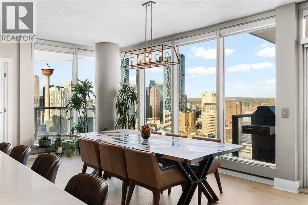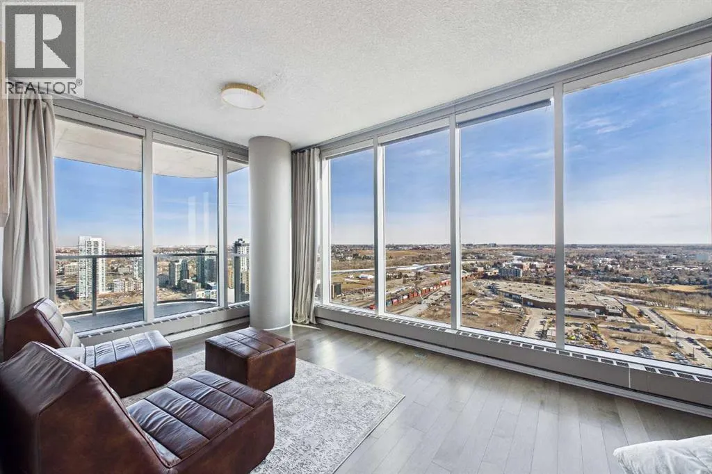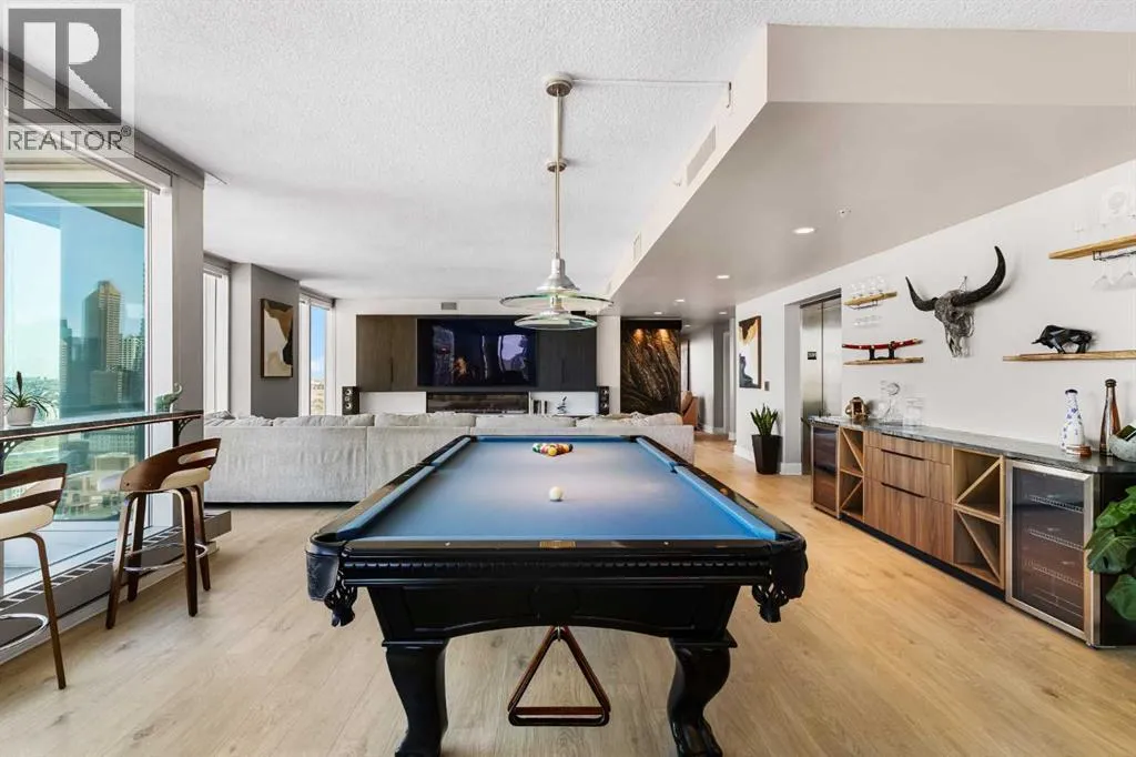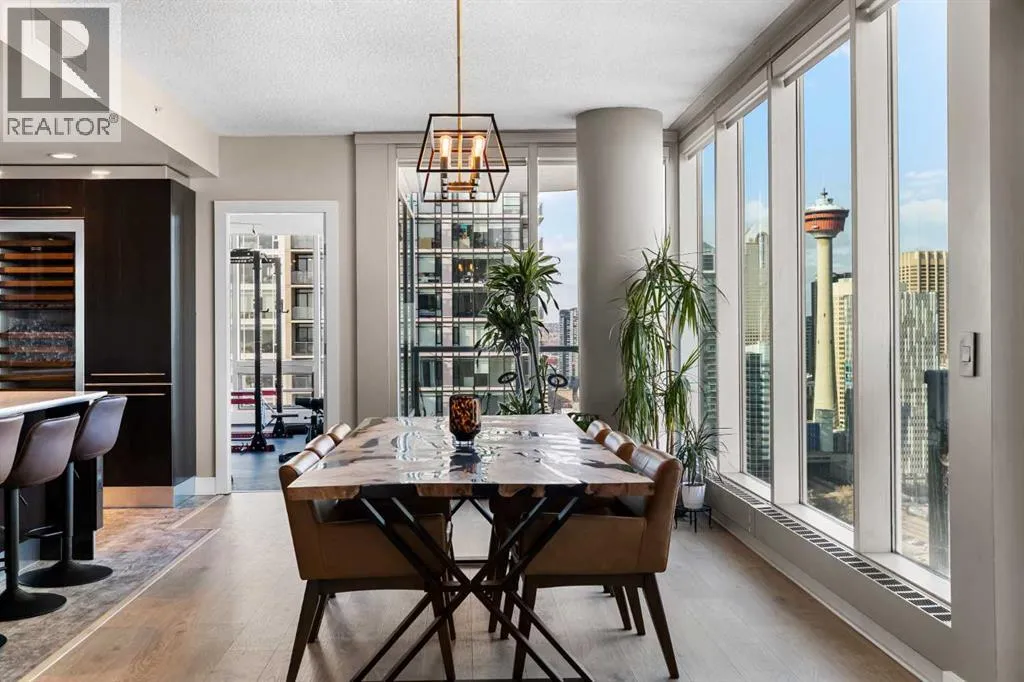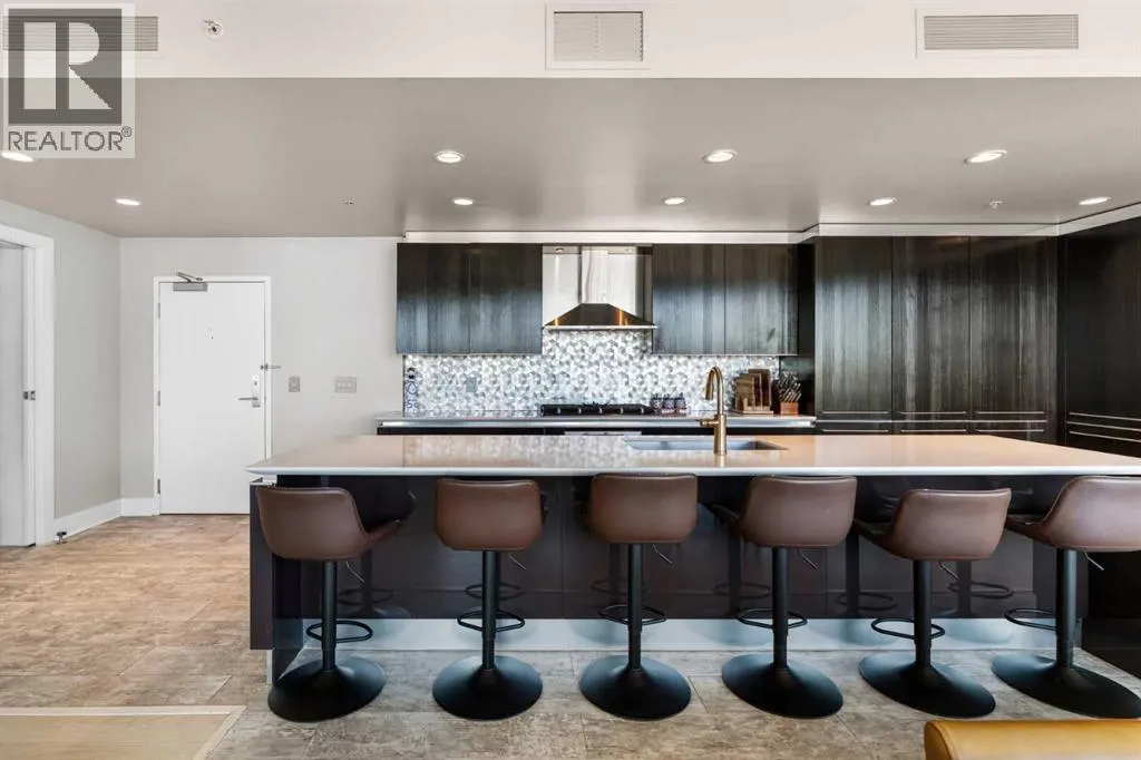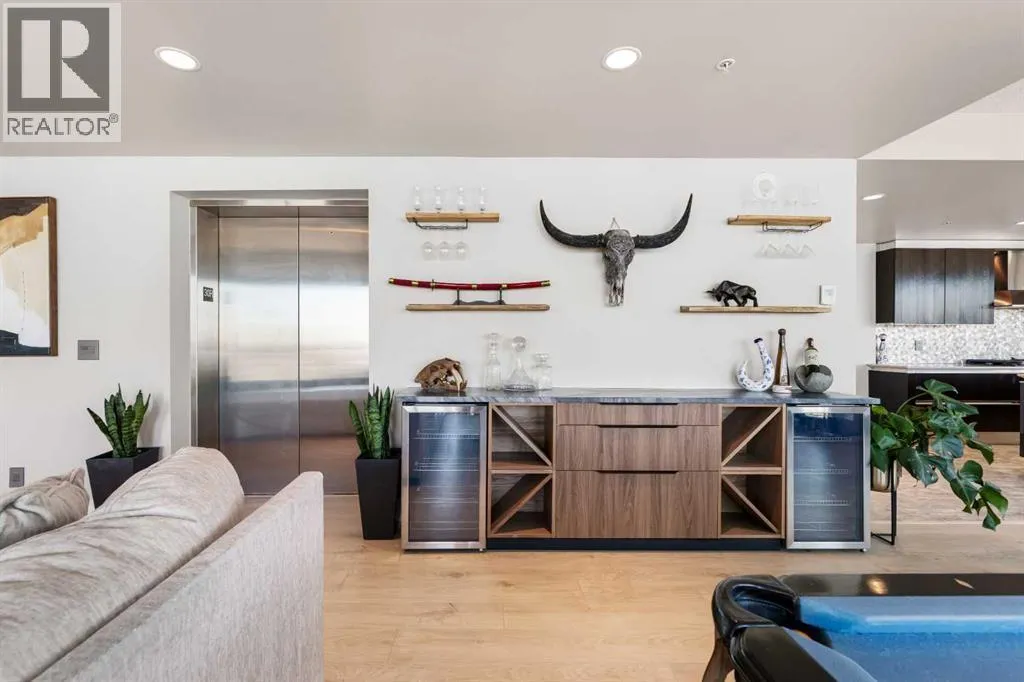 Your day begins with the soft glow of the morning sun spilling through floor-to-ceiling windows, offering panoramic views of downtown Calgary from every room. After a workout in your private home gym, you enjoy breakfast at the leathered granite counter perfectly positioned by the window to take in the city skyline. This 2,600+ sq ft sanctuary is a masterclass in executive hosting; as evening nears, the gentle trickle of the custom stone waterfall sets the mood while you select a vintage from your full-size, dual-zone wine fridge. Whether you are preparing drinks at the sophisticated leathered granite dry bar or a gourmet meal using the suite's high-end appliances, the space flows effortlessly for any occasion. The layout offers unmatched privacy with two spacious primary bedrooms, each featuring its own ensuiteâincluding a lavish 5-piece spa retreat in the main suite. When youâre ready to head out, your private elevator opens directly into your suite, whisking you down to the vibrant pulse of the Beltline. You are perfectly positioned in the new Entertainment District, just steps from the new Calgary Flames arena, Stampede grounds, and river pathways. Living at the Arriva means effortless luxury, supported by 24-hour security and concierge services, a rooftop garden, ownerâs lounge, guest suites, and central A/Câall complemented by modern updates including a new washer and ventless dryer. (id:27476)