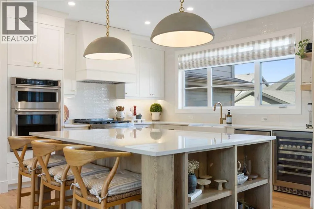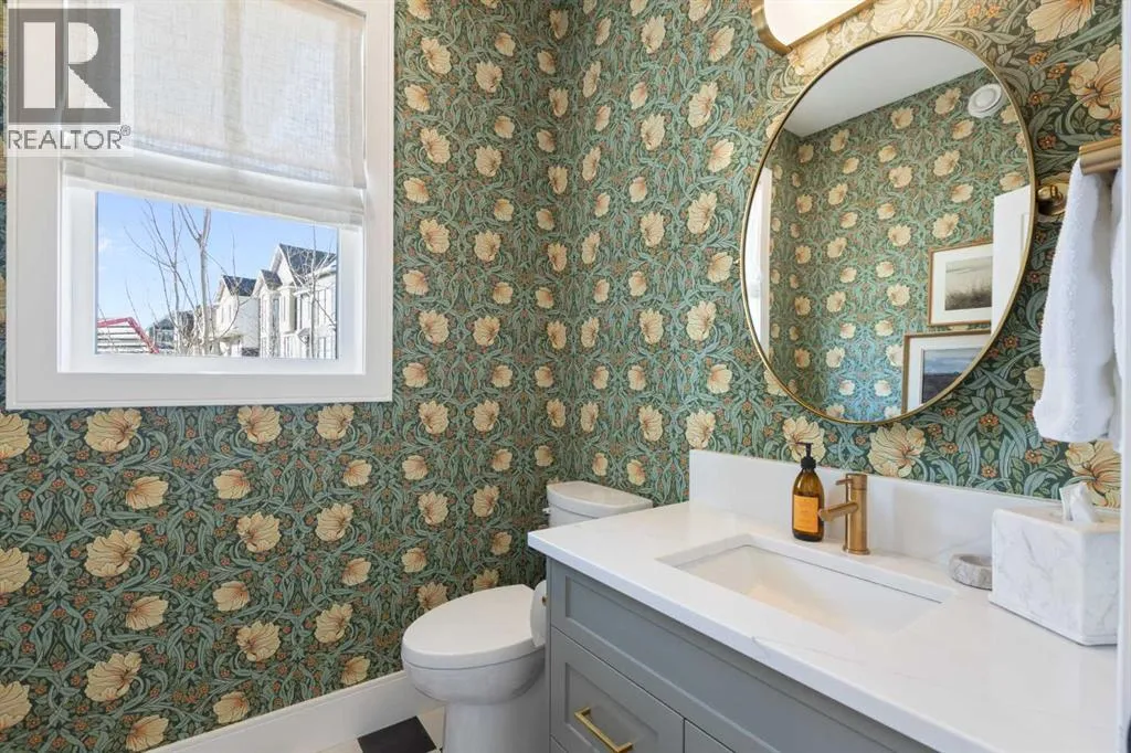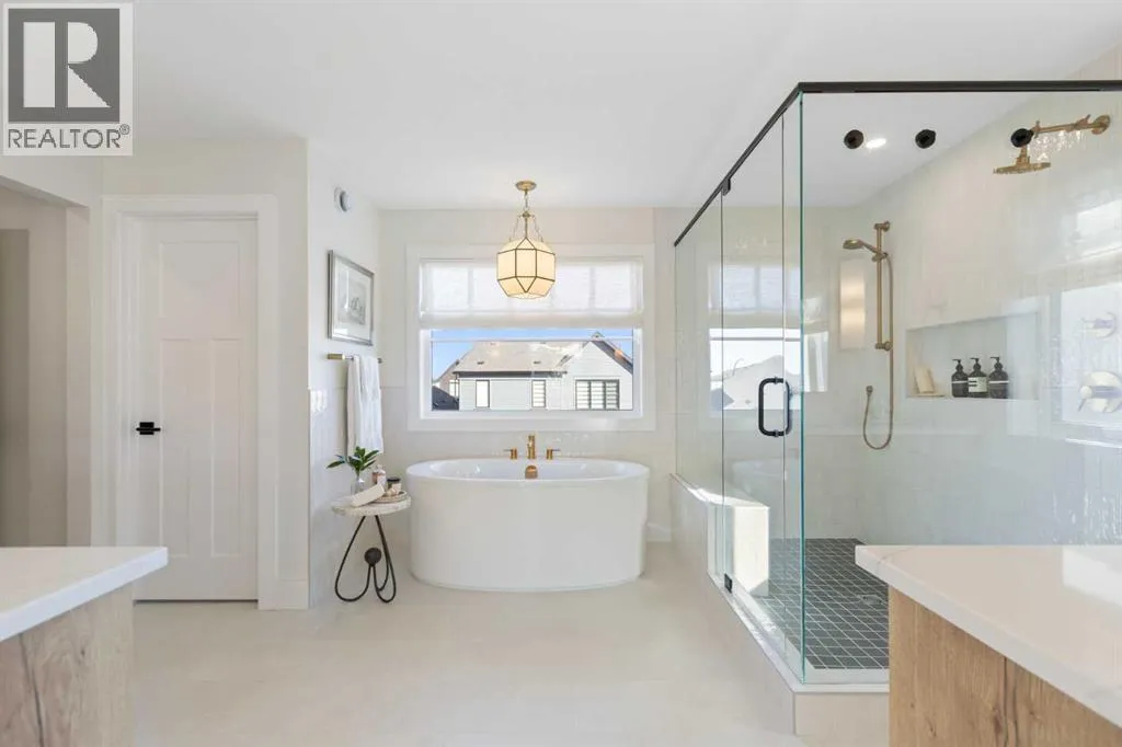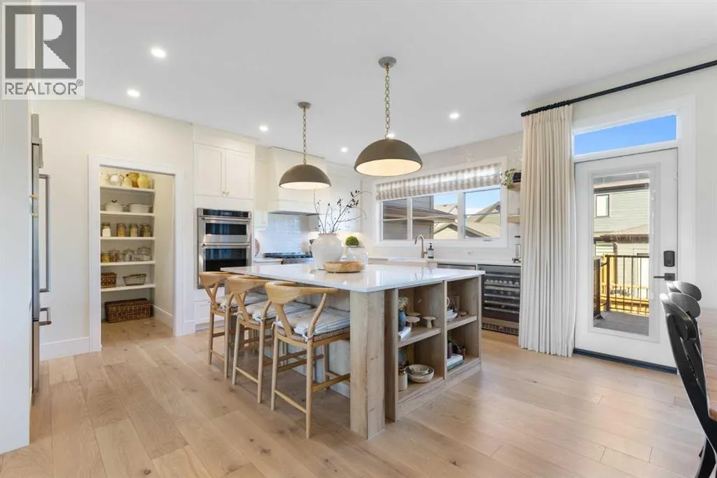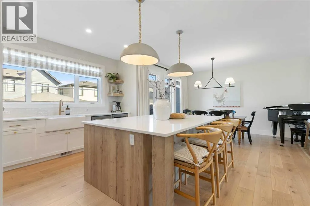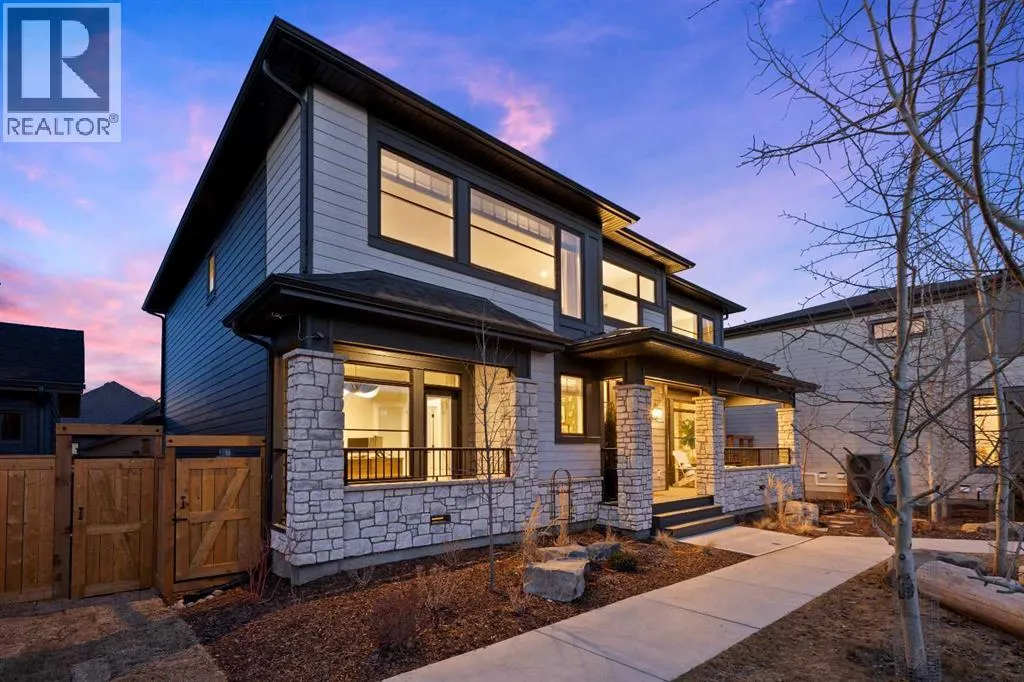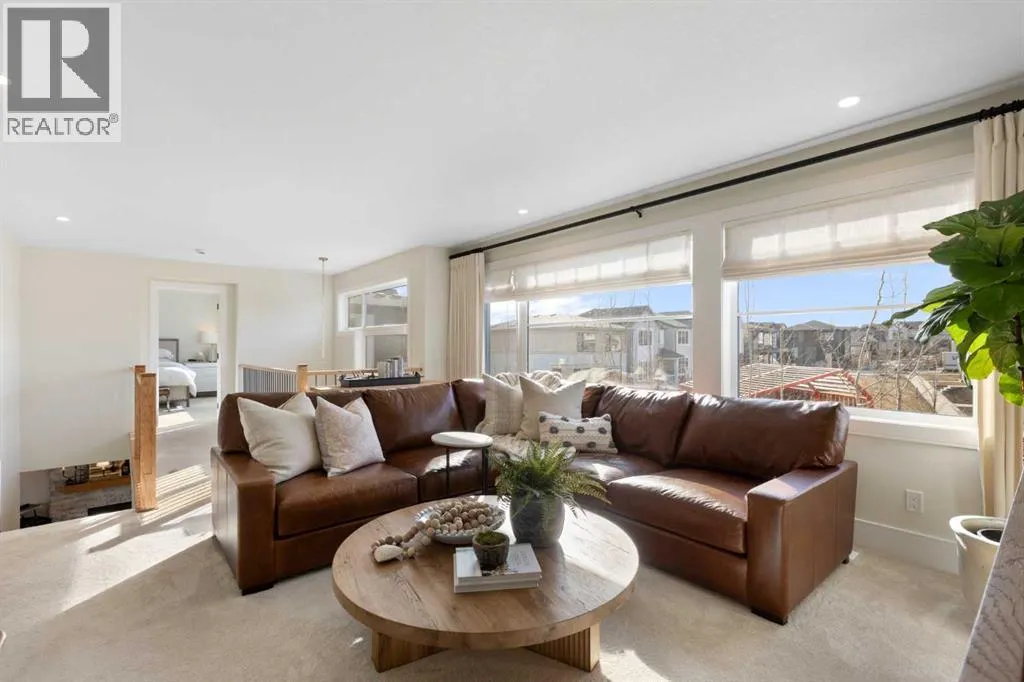 Welcome to this exceptional executive family home, perfectly positioned on one of the premier wide lots in the vibrant and thoughtfully designed community of Alpine Park, facing directly onto Orchard Green, a beautiful park featuring fruit trees, open play spaces, a community garden, and a Harvest Table for gatherings and picnics, offering a rare combination of privacy, scenery, and lifestyle. Set on an impressive 60 ft wide lot, the property enjoys peaceful park views from the front deck, living room, family room, and primary bedroom, with mature trees providing natural privacy, and offers over 3,600 sq ft of developed living space across three levels, showcasing outstanding craftsmanship and upgrades throughout while presenting like a builderâs showhome with the warmth and functionality of a true family home. Upon entry, you are immediately struck by the attention to detail and thoughtful design, with a bright main floor living room featuring large south-facing windows and a stunning floor-to-ceiling stone gas fireplace, flowing seamlessly into the heart of the home, a beautifully appointed kitchen with crisp white cabinetry, large island, stainless steel appliances, built-in oven, expansive north-facing window, and walk-in pantry. The spacious dining area is ideal for hosting large gatherings and features sliding patio doors leading to the upper deck and landscaped, fenced yard, along with a shaded lower patio perfect for summer relaxation. A stylish two-piece powder room and generous home office with park views and private deck access provide both convenience and versatility, while a custom-designed mudroom with closet and bench with lift-up storage completes the main level. The second level is a private retreat featuring a spacious family room with large park-facing windows, a unique bridge leading to the primary suite with expansive south-facing windows and a sliding barn door into the luxurious ensuite with dual vanities, large walk-in shower with dual shower heads, and elegant soaker tub. The custom walk-in closet connects to a well-appointed laundry room with folding counter and built-in sink, while two additional generously sized bedrooms and a five-piece main bathroom complete this level. The fully developed basement offers excellent additional living space with a large rec room ideal for teens, guests, or movie nights, a fourth bedroom, and a four-piece bathroom, plus rough-in plumbing for a future wet bar and an oversized utility and storage area for exceptional organization. The double attached garage is oversized in height, allowing for the potential addition of a vehicle lift or extra storage. Facing directly onto parkland, this home offers a quiet, traffic-free setting where you can relax on the front deck, enjoy your favorite beverage, and watch children play, delivering the perfect balance of luxury, comfort, and community-focused living in one of Calgaryâs most exciting new neighbourhoods. (id:27476)