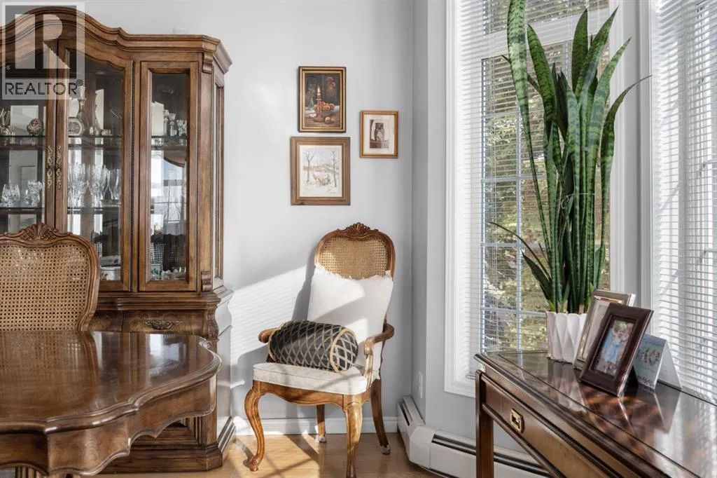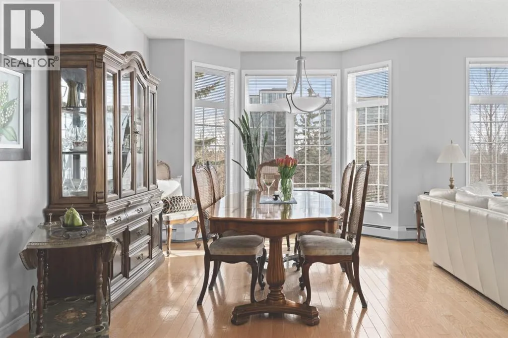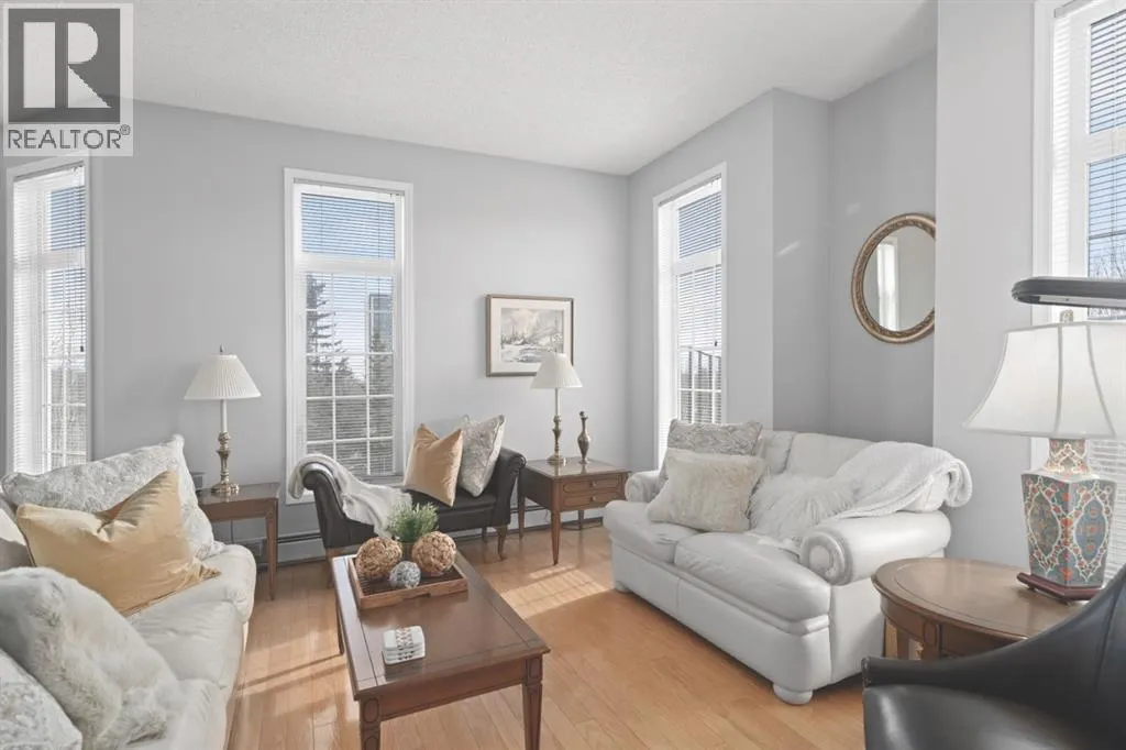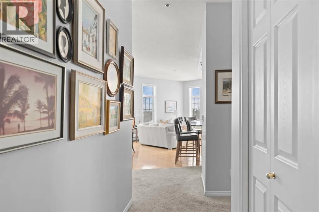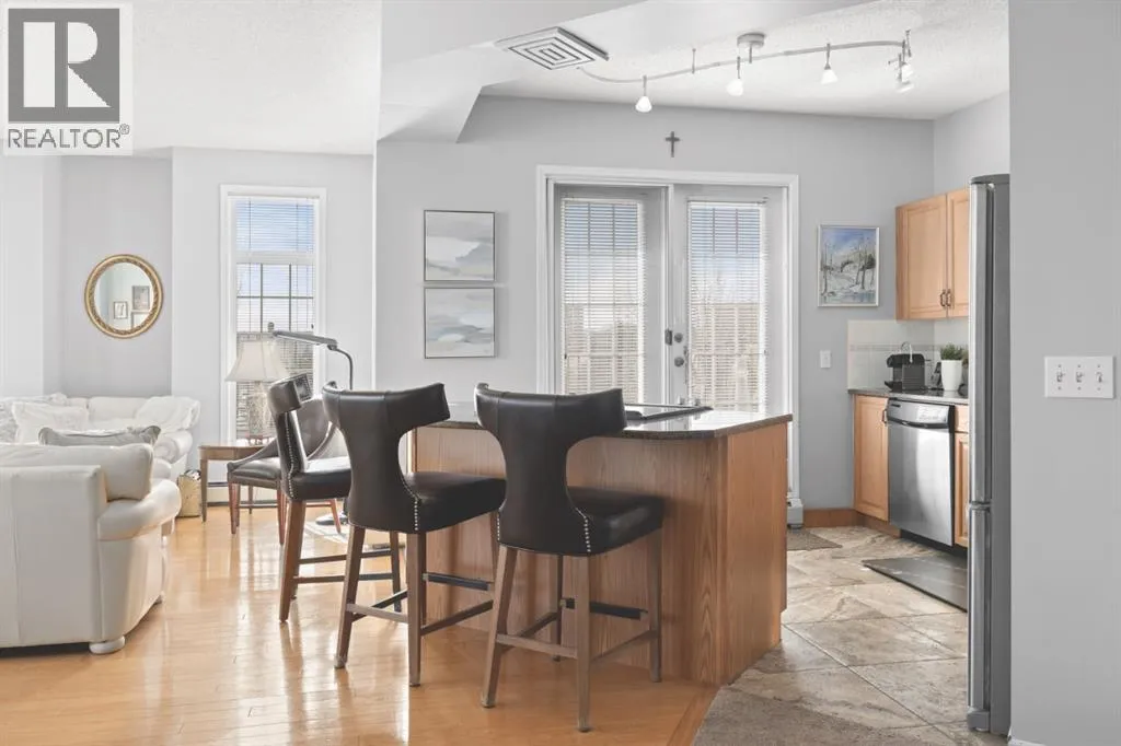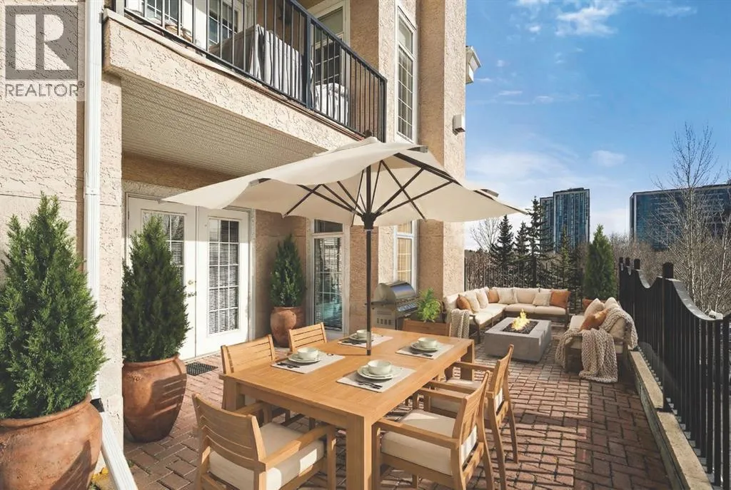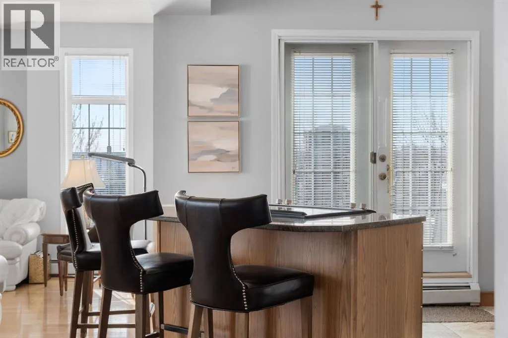 Welcome to this rare offering in the highly sought-after Gallery building in desirable Dalhousie. Conveniently located on the main floor but with a beautiful patio that sits well above ground level, this exceptional end unit combines privacy, elegance and everyday comfort in an exclusive 18+ building with only 16 residences. From the moment you step inside, the building sets the tone with its luxurious feel, sweeping curved staircase and tasteful decor. The unit itself has a private foyer and opens to a bright and airy 1,216 sq. ft. layout enhanced by large windows, tall ceilings and an abundance of natural light. The kitchen is designed for both function and connection, featuring a generous island with seating, granite countertops, stainless steel appliances and ample counter space. The kitchen flows flows beautifully into the spacious dining area, which can easily accommodate sizeable gatherings. The living room invites relaxed, elegant comfort and frames the stunning outdoor views. The true showstopper is the massive patio, large enough for two distinct seating areas. Take in views of the mountains while enjoying your morning coffee, summer al fresco dining or a peaceful evening unwind. It is a rare outdoor space that genuinely extends your living area. The condo offers two spacious bedrooms, including a large primary retreat complete with a walk-in closet, additional linen storage and ensuite featuring a soaking tub and separate shower. The second bedroom is perfectly suited as a guest room or home office and is conveniently located near the additional two-piece bathroom, where you will also find in-suite laundry and another linen closet. Storage is exceptional throughout - there is a dedicated storage room at the front of the unit ideal for a freezer or pantry overflow, plus an impressive 6â x 12â (approx) storage room in the underground parkade located directly in front of your oversized titled parking stall. The building welcomes your pets (a small dog or cat ) and is situated just steps from Dalhousie Station, with convenient access to shopping, restaurants and a Safeway grocery store. The Dalhousie LRT Station and central bus hub are a short walk away, with an additional bus stop located right outside the building. For those who enjoy walking or biking, numerous nearby pathways make it easy to stay active and connected to nature. Well managed with a highly attentive board, this low-density building offers a quiet, refined and friendly lifestyle, in an unbeatable location. Units here rarely come to market so don't miss the opportunity to call this exceptional condo home! (Please click on the link for the 3D Tour.) (id:27476)
