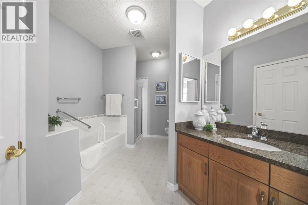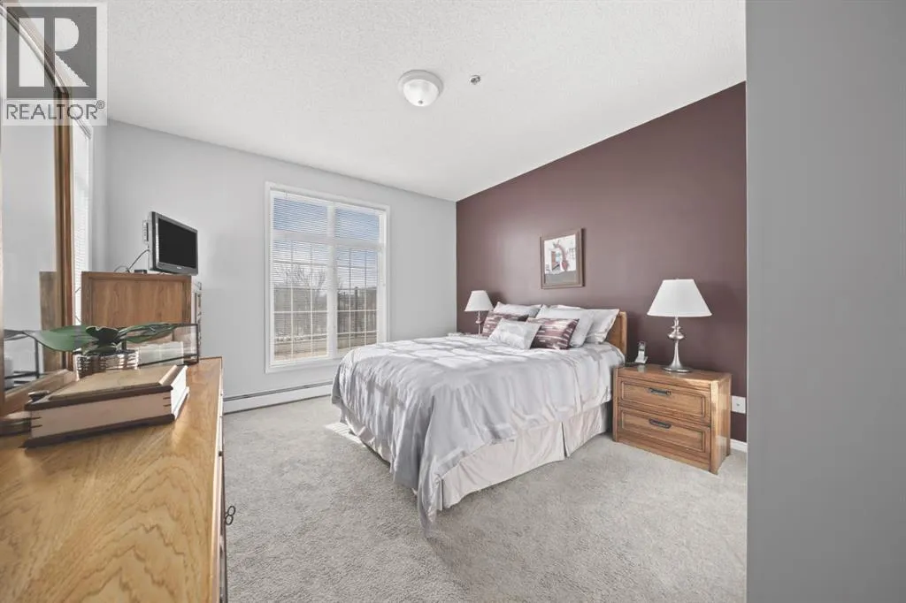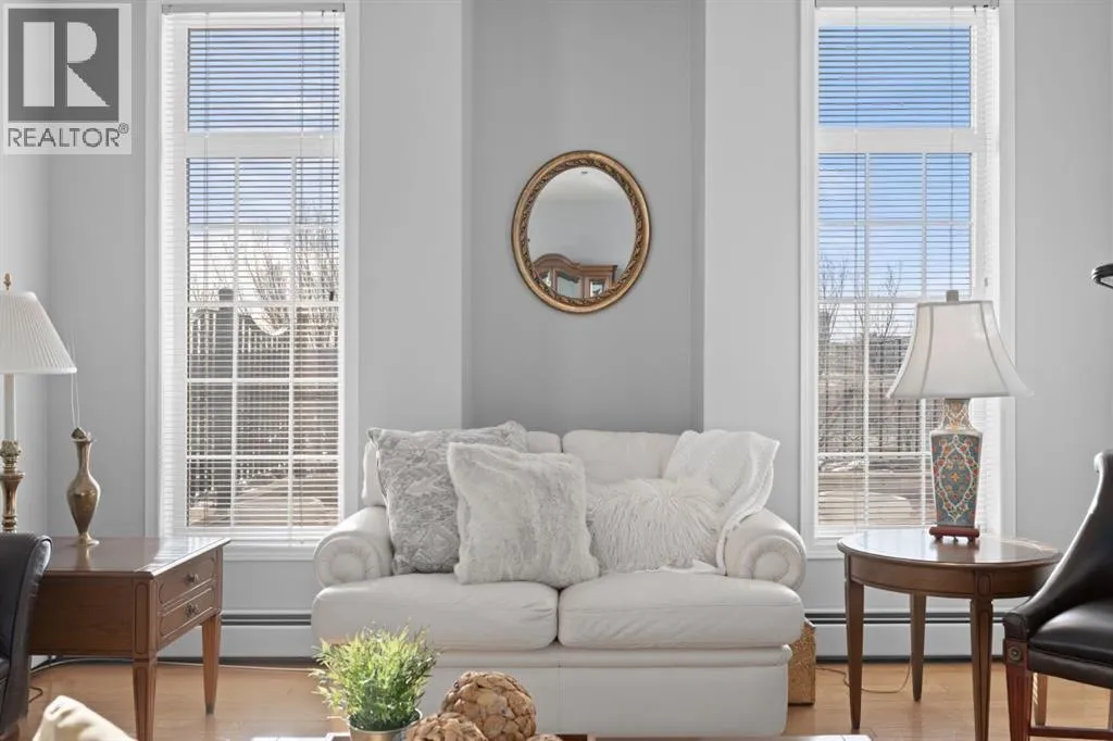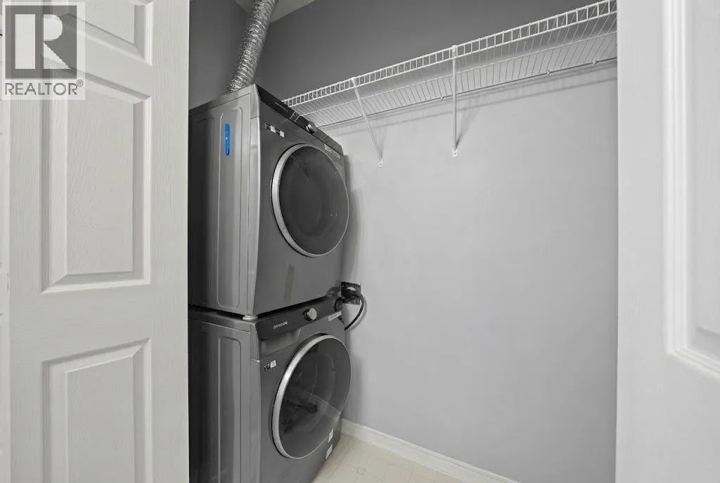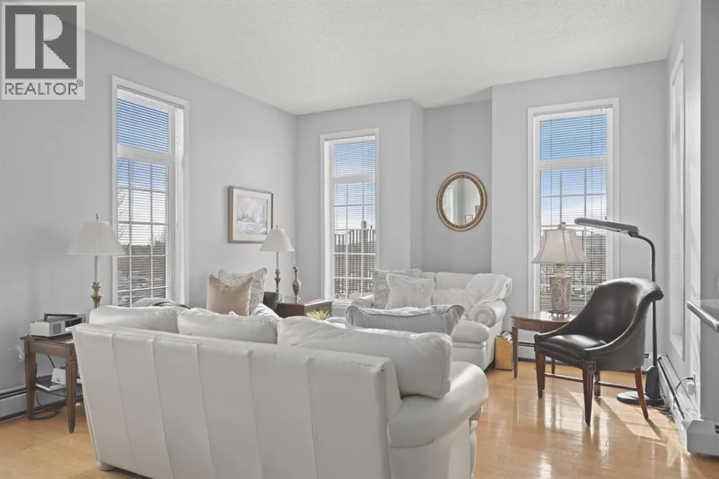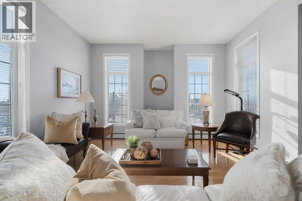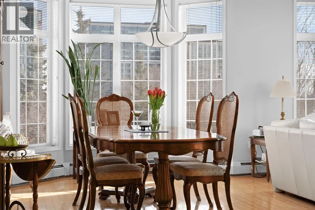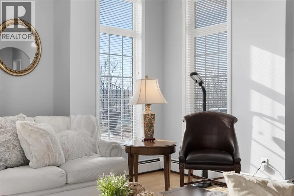 Welcome to this rare offering in the highly sought-after Gallery building in desirable Dalhousie. Conveniently located on the main floor but with a beautiful patio that sits well above ground level, this exceptional end unit combines privacy, elegance and everyday comfort in an exclusive 18+ building with only 16 residences. From the moment you step inside, the building sets the tone with its luxurious feel, sweeping curved staircase and tasteful decor. The unit itself has a private foyer and opens to a bright and airy 1,216 sq. ft. layout enhanced by large windows, tall ceilings and an abundance of natural light. The kitchen is designed for both function and connection, featuring a generous island with seating, granite countertops, stainless steel appliances and ample counter space. The kitchen flows flows beautifully into the spacious dining area, which can easily accommodate sizeable gatherings. The living room invites relaxed, elegant comfort and frames the stunning outdoor views. The true showstopper is the massive patio, large enough for two distinct seating areas. Take in views of the mountains while enjoying your morning coffee, summer al fresco dining or a peaceful evening unwind. It is a rare outdoor space that genuinely extends your living area. The condo offers two spacious bedrooms, including a large primary retreat complete with a walk-in closet, additional linen storage and ensuite featuring a soaking tub and separate shower. The second bedroom is perfectly suited as a guest room or home office and is conveniently located near the additional two-piece bathroom, where you will also find in-suite laundry and another linen closet. Storage is exceptional throughout - there is a dedicated storage room at the front of the unit ideal for a freezer or pantry overflow, plus an impressive 6â x 12â (approx) storage room in the underground parkade located directly in front of your oversized titled parking stall. The building welcomes your pets (a small dog or cat ) and is situated just steps from Dalhousie Station, with convenient access to shopping, restaurants and a Safeway grocery store. The Dalhousie LRT Station and central bus hub are a short walk away, with an additional bus stop located right outside the building. For those who enjoy walking or biking, numerous nearby pathways make it easy to stay active and connected to nature. Well managed with a highly attentive board, this low-density building offers a quiet, refined and friendly lifestyle, in an unbeatable location. Units here rarely come to market so don't miss the opportunity to call this exceptional condo home! (Please click on the link for the 3D Tour.) (id:27476)