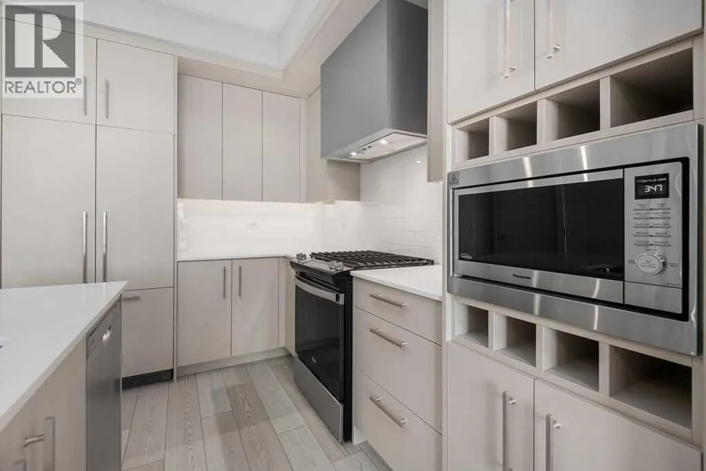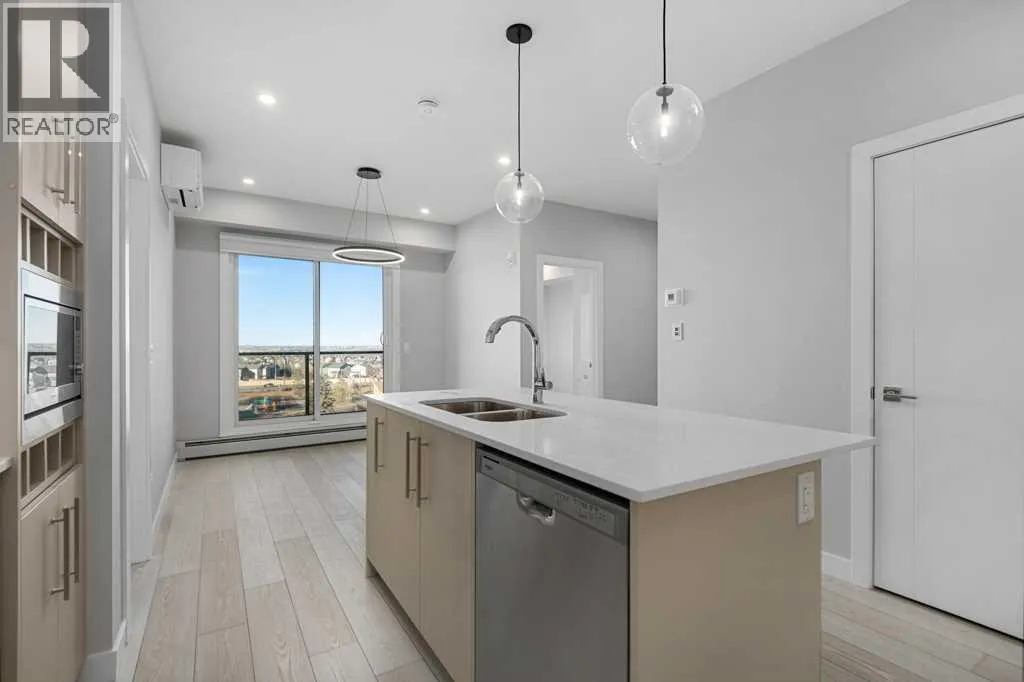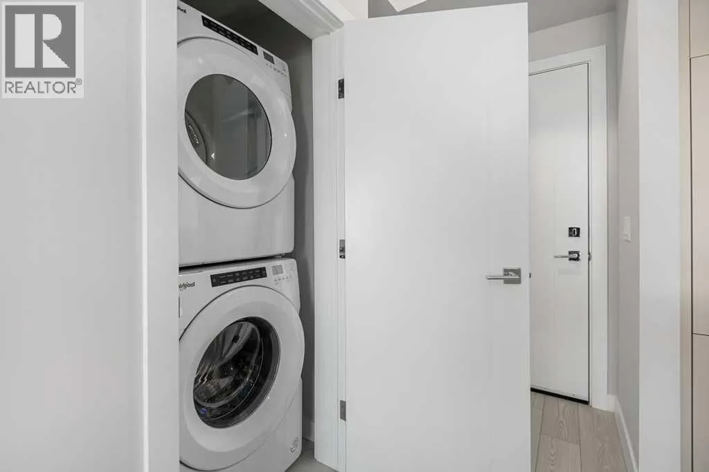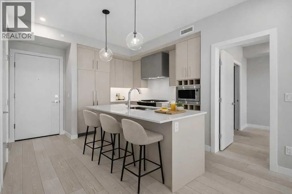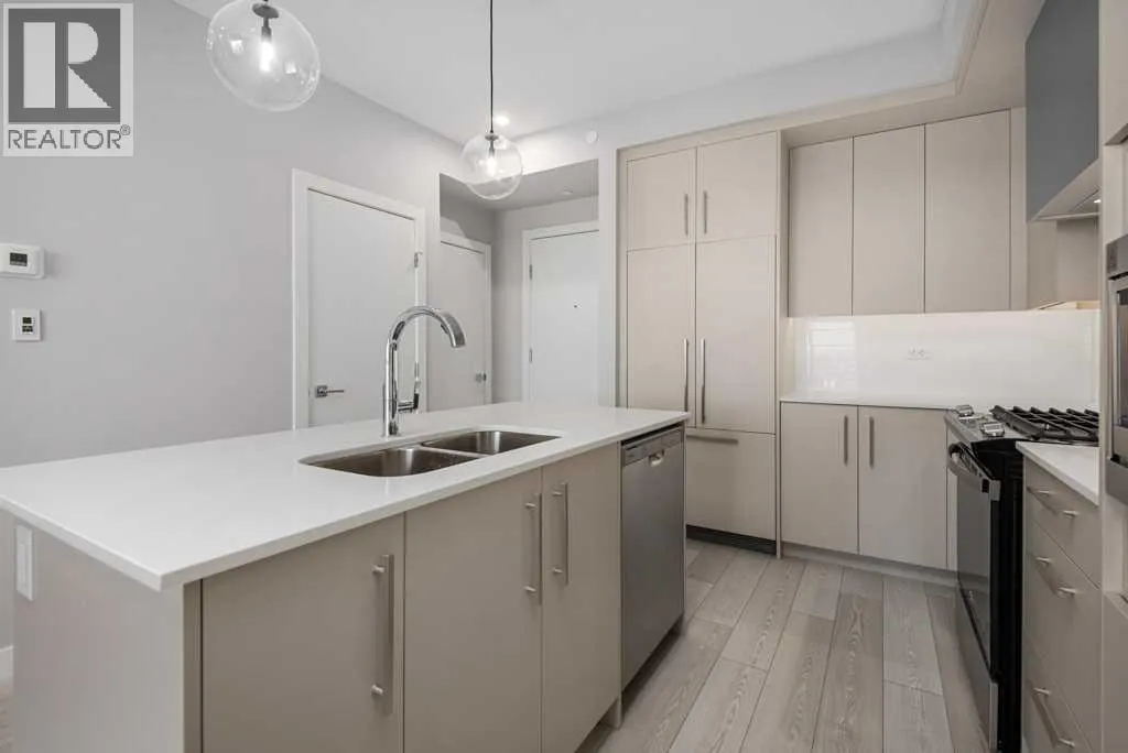 Contemporary living awaits at The Mondrian. This stylish 2 bedroom, 2 bathroom residence is beautifully curated by Trumanâs award-winning design team and delivers a true âwowâ factor with 9-foot ceilings, air conditioning, roller-shade window coverings, premium LVP flooring with acoustic underlay, and custom energy-efficient LED lighting throughout.The contemporary kitchen impresses with high-end, energy-saving stainless steel appliances, floor-to-ceiling ergonomic cabinetry, polished quartz countertops, and deep drawers designed for everyday function and clean modern style.Retreat to the expansive primary suite featuring a spacious walk-through closet leading to a luxe spa-inspired ensuite with a modern square-edge countertop, designer vanity, and environmentally conscious fixtures.The open-concept living area flows seamlessly to your private balcony, perfect for morning coffee or evening downtime. Enjoy the convenience of in-suite laundry, plus titled underground parking and a secure storage locker.Top it off with access to the breathtaking rooftop lounge with incredible views, all set in a vibrant community surrounded by cafés, restaurants, and boutique shopsâand just a short drive to downtown or the mountains. **Some images have been virtually/digitally staged to illustrate possible furnishings and layout. (id:27476)