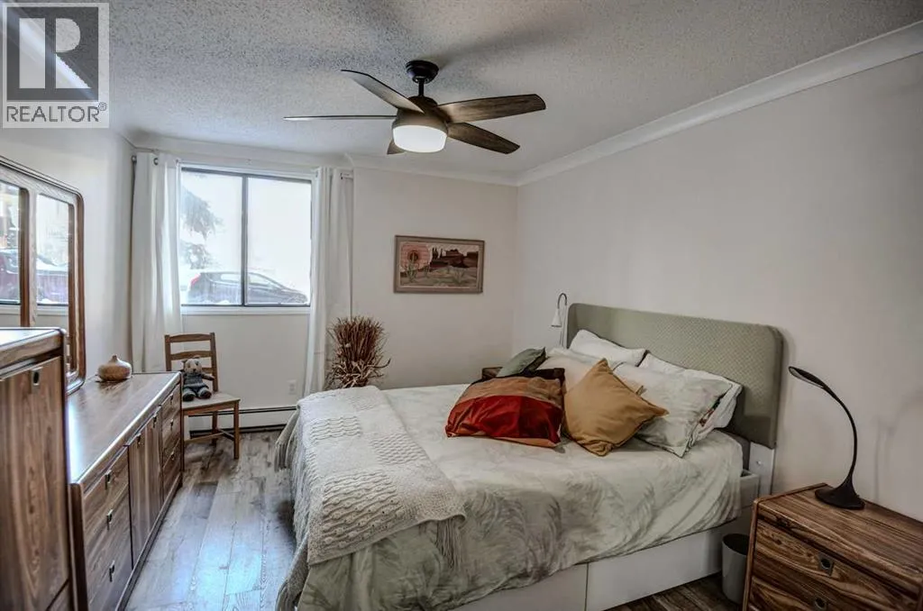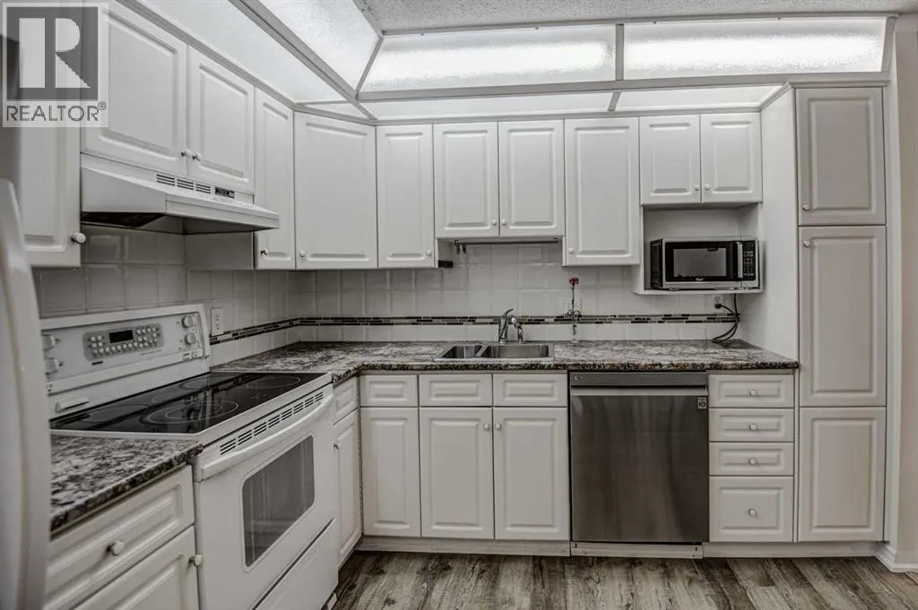 March 29 Open house cancelled. Quiet, 40+ age restricted living can be yours in Chinook Manor, a well-managed and maintained five storey concrete building, with elevator, that is only a couple of blocks from Chinook Center. The spacious two-bedroom unit offers 993 square feet of living space and literally needs no work. Just move in and enjoy. This home is freshly painted throughout. along with all brand-new vinyl plank flooring . Large open living room dining room combination with crown moulding overlooking your exclusive use patio. Second bedroom can be used as an office. The Murphy bed is included.The full bath has a newer vanity. In-unit laundry and storage room.There is also a separate assigned storage room locker . Amenities Include a social room, billiard room, fitness room, laundry room and hobby workshop room. The available underground parking is an option, subject to availability, over and above the buildingâs included surface parking and abundant on-street parking. There is a strict no-pet policy here and respectable condo fees of $604 per month. Enjoy the quiet lifestyle.Close to transportation and all types of shopping and restaurants. (id:27476)