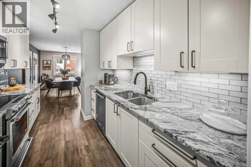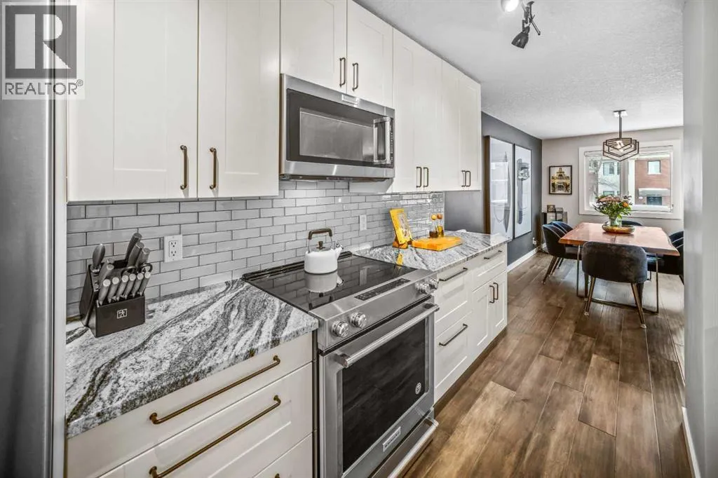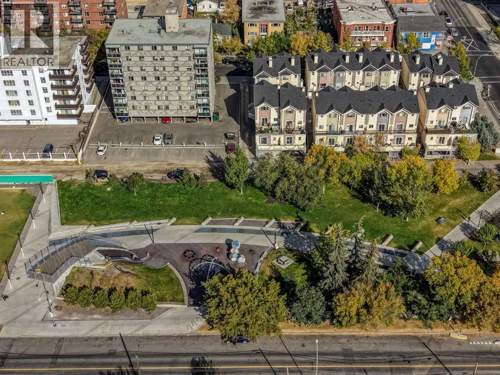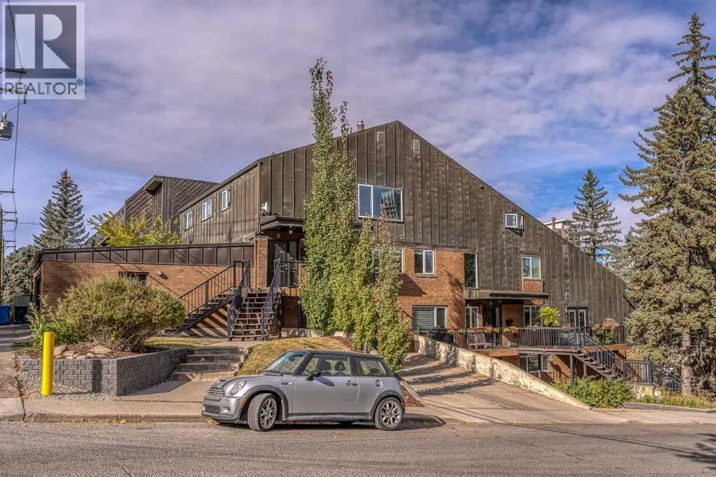 Welcome to Copper Castle â a bold, unique, and one-of a-kind complex in Calgaryâs inner-city. Defined by its copper and brick exterior. This distinctive industrial-modern design is far from your typical townhouse. Quietly tucked between the vibrant 17th Avenue and the prestigious community of Upper Mount Royal this location is truly unmatched. Offering over 1,300 sqft of bungalow-style living, this unit delivers all the modern upgrades in the comfort of single-level living.Inside, an spacious open floor plan. Large triple-pane windows face the front of the unit. The living room is anchored by a modern two-sided gas fireplace, creating warmth and comfort. The generous size dining room flows seamlessly into the contemporary galley kitchen - featuring white shaker cabinetry, stainless steel KitchenAid appliances, subway tile backsplash, and marble-granite countertops. Through the kitchen is your walk-in pantry and your main-floor laundry room.Both bedrooms are generously sized. The primary features a walk-in closet and a fully tiled 4-piece ensuite, complete with a shower and freestanding soaker tub.A separate stairwell leads directly to your oversized garage (with driveway), providing exceptional storage and parking flexibility. At the rear of the garage â a recently updated flex space that creates the perfect setup for a home office, gym, or creative studio. Additional storage space is found in the utility room. This home is also equipped with central AC and a newer hot water tank (2021). Whether you're looking to downsize or if you are buying your first home, this home is one you wonât want to miss. Book your showing today! (id:27476)