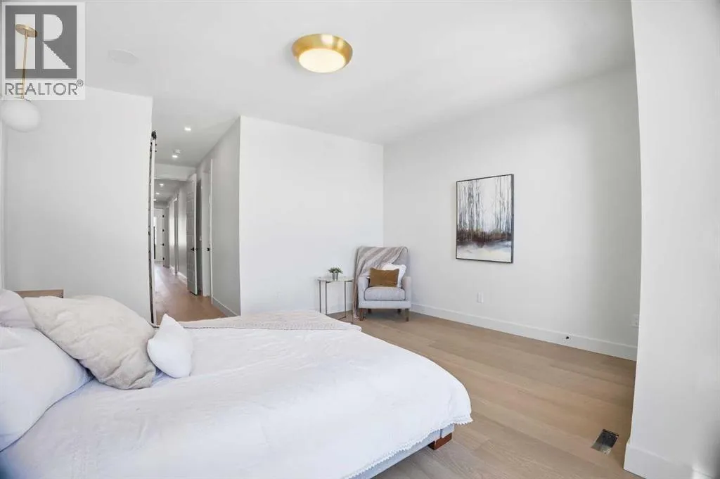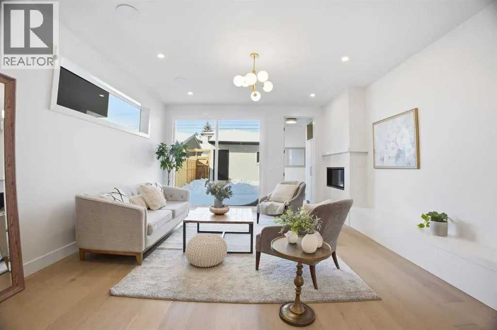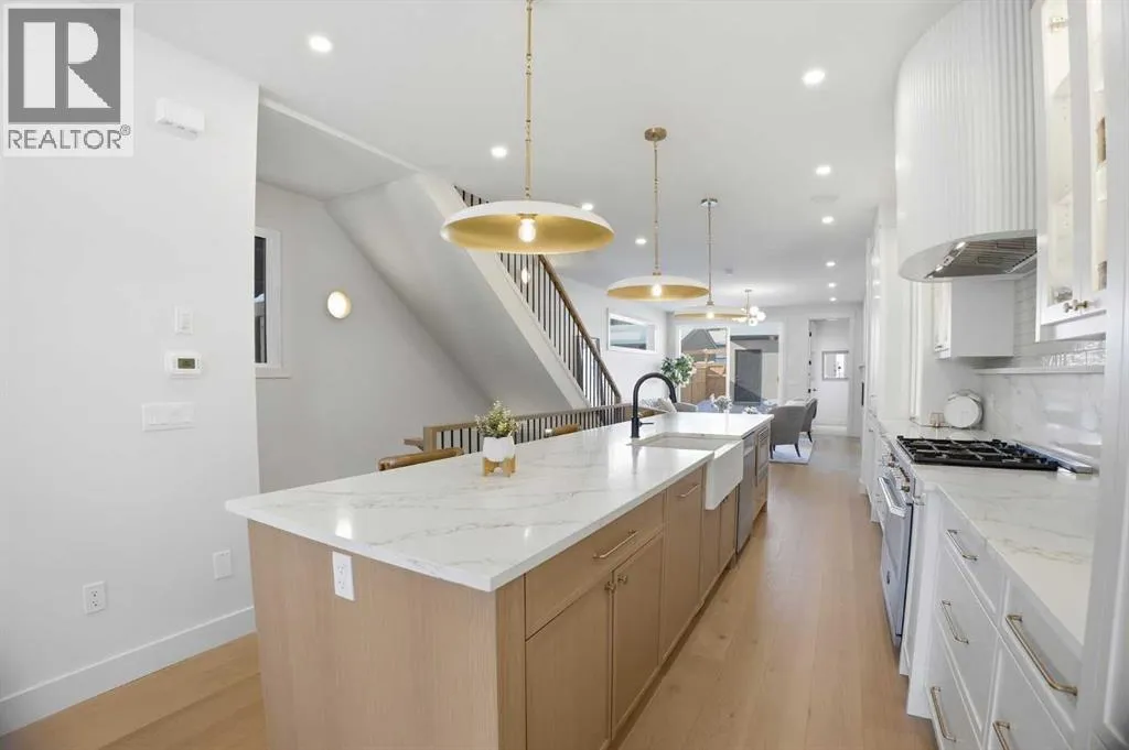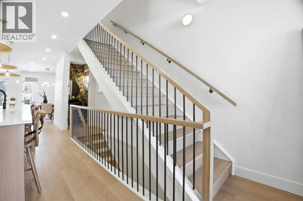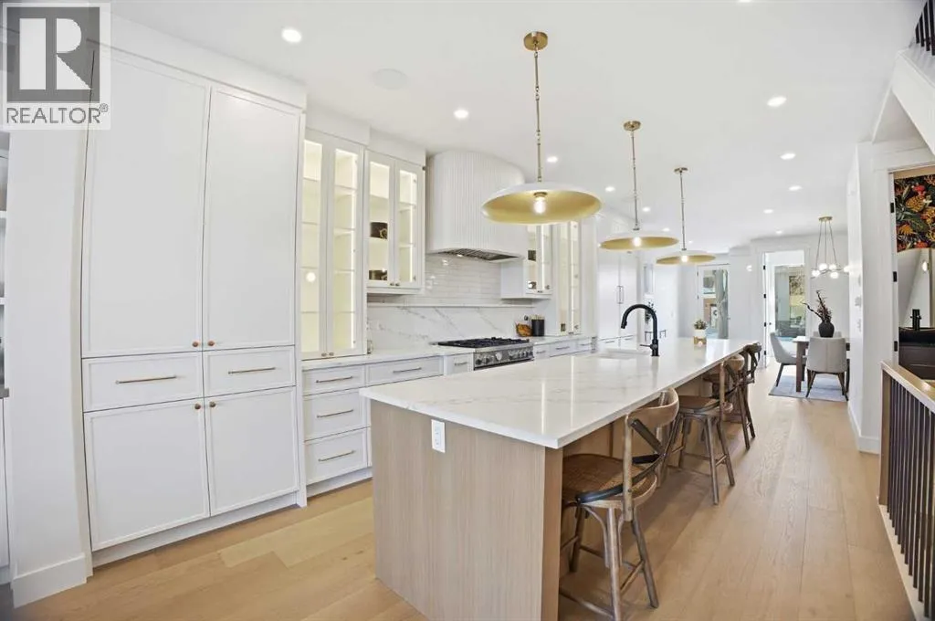 Located on a quiet street in sought after Richmond and situated on an extra deep 135â lot allowing extra back yard space, this newly built and beautifully curated 4+1 bedroom residence offers panoramic views and over 4,200 sq ft of exceptional living space. The open, airy main level features hardwood floors, soaring ceilings, and an abundance of natural light. A stylish dining area with a designer fixture provides generous space for hosting, while the tastefully finished kitchen impresses with quartz countertops, a large island/eating bar, extensive storage, and high end appliances. The living room is anchored by a striking feature fireplace and custom built ins. A dedicated den/office is tucked just off the foyerâideal for working from home. Completing the main level are a 2 piece powder room and a well appointed mudroom with built in bench and storage. The second level hosts three spacious bedrooms, a 5 piece Jack & Jill bath, and a laundry room with sink and ample cabinetry. The expansive primary retreat captures gorgeous views and includes a private balcony, dual walk in closets, and a luxurious 5 piece ensuite with dual sinks, a freestanding soaker tub, and a glass enclosed shower. The third level offers a versatile loft with access to a large west facing deck and a convenient wet barâperfect for a media room, studio, or additional office space. A generous bedroom with its own 4 piece ensuite is ideal for guests. The fully developed basement is designed for entertaining, featuring a spacious family/media room with wet bar and wine storage. A fifth bedroom, 4 piece bath, and dedicated storage room complete the lower level. Additional highlights include rough in for air conditioning and built in speakers. Outside, enjoy the sunny west facing backyard with a patio and access to the double detached garage. This prime location offers close proximity to schools, shopping, vibrant Marda Loop, public transit, and effortless access to Crowchild Trail. (id:27476)
