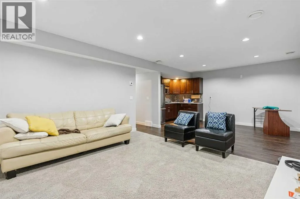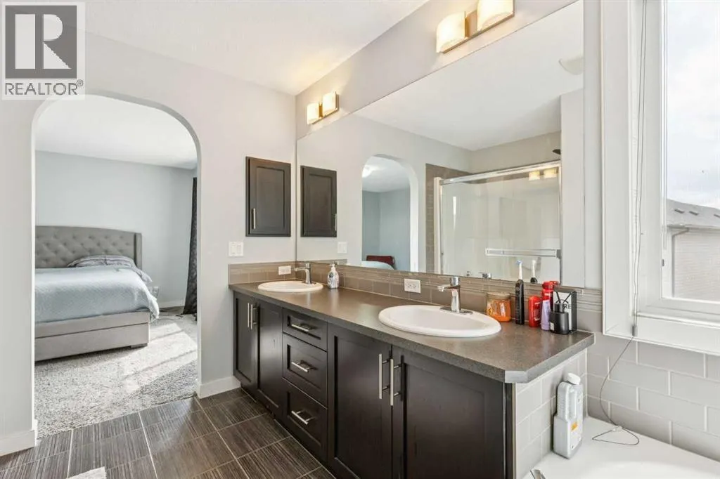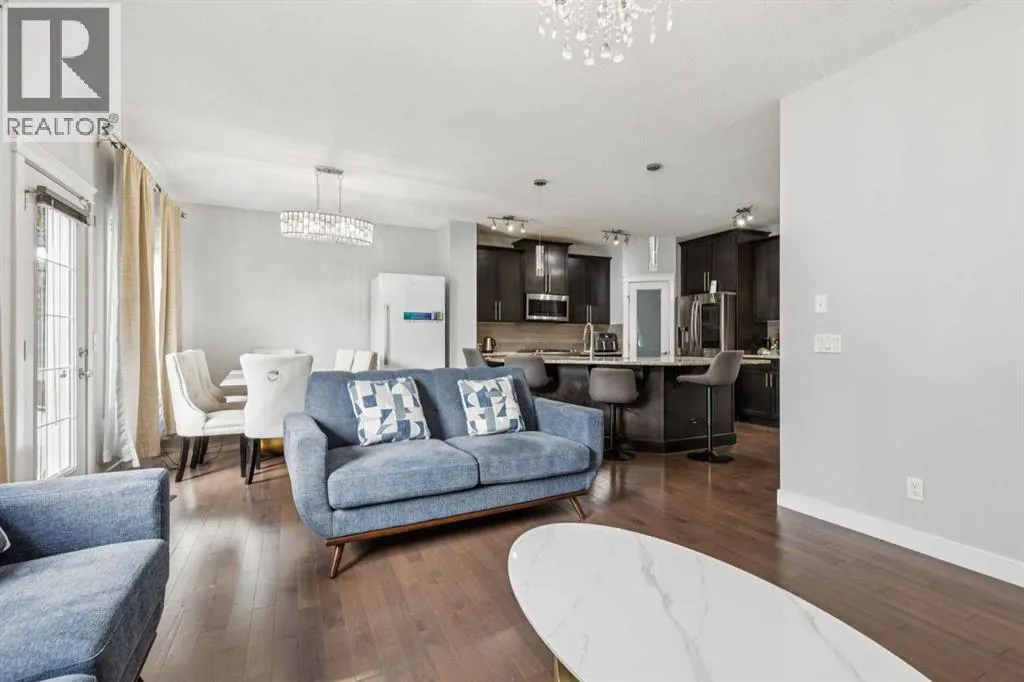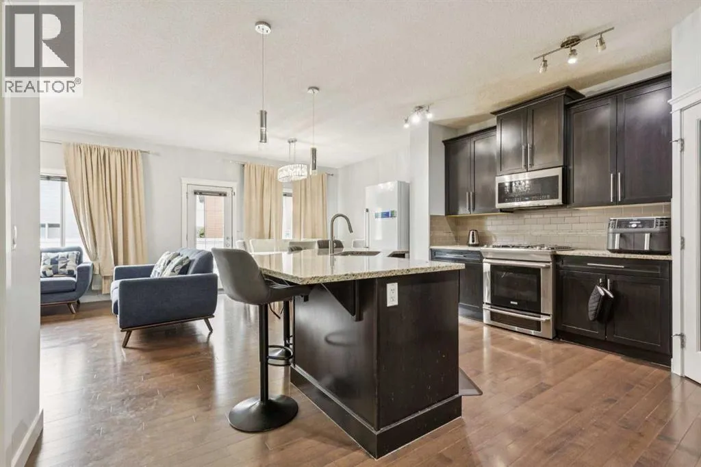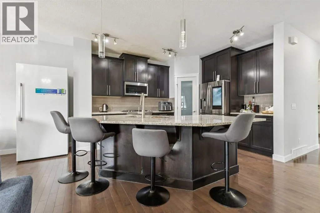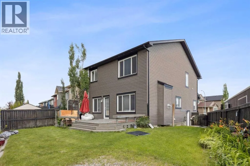 This exquisite executive home is located on a pie-shaped corner lot in the vibrant community of Evanston. This home has been freshly painted and the roof and garage door have just been replaced. You are greeted by a spacious foyer and gleaming hardwood floors that continue throughout the main floor. The open floor plan and wall of windows overlooking the backyard allow for an abundance of natural light to fill the great room. The kitchen elegantly showcases ample rich cabinetry with granite counters and a large island. It features a gas range and a walk through pantry for extra storage. The great room is centered by a gas fireplace that will add ambience to your entertaining. A den and 2 piece bathroom complete the main floor. Upstairs there is a spacious bonus room with soaring vaulted ceilings that your family will love. The primary retreat is perfect for a king size bed and has a large walk-in closet and sumptuous ensuite bath with a deep soaker tub. There are two more good sized bedrooms plus a full bath and laundry room to complete the upper floor. The walk-up basement is fully developed into a one bedroom plus den legal suite with its own private entrance. It has its own kitchen, bath, living room and laundry. The suite could easily be used as an entertainment area with a wet bar as well. The large backyard will be your private oasis complete with a huge two-tier deck that was made for entertaining. Parking is a breeze with the double attached garage and concrete driveway. Call today! (id:27476)