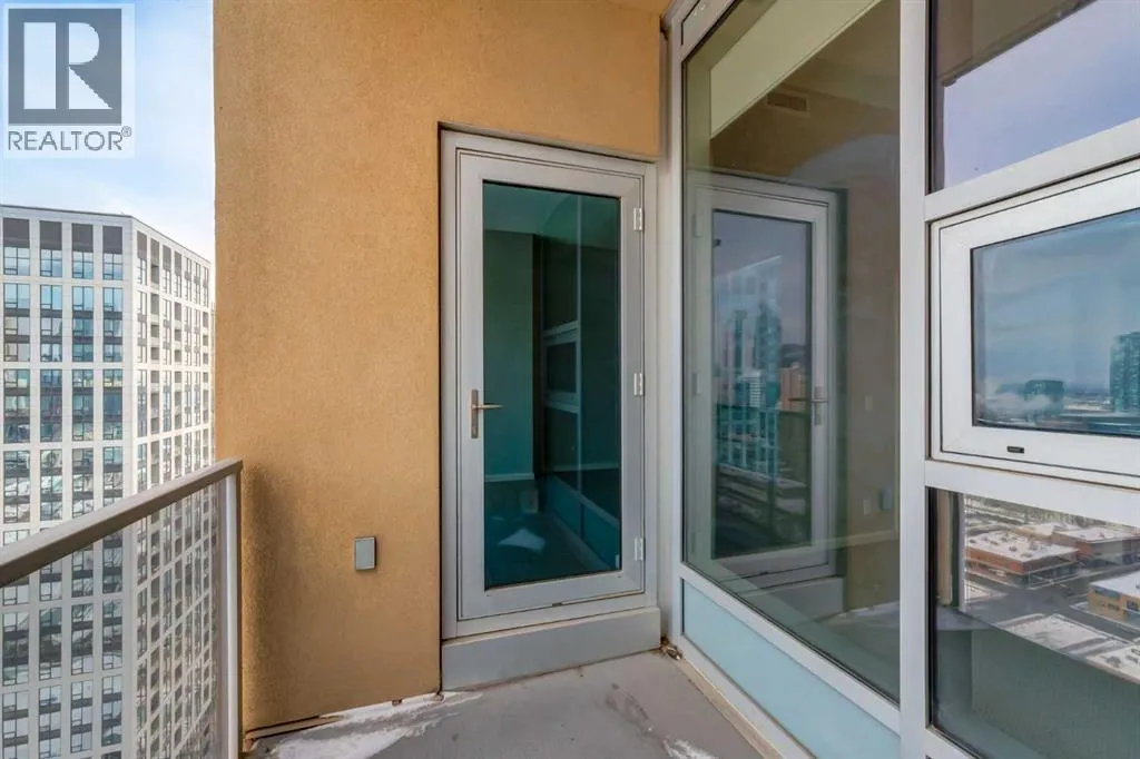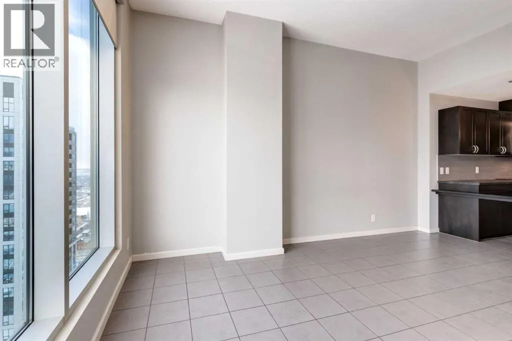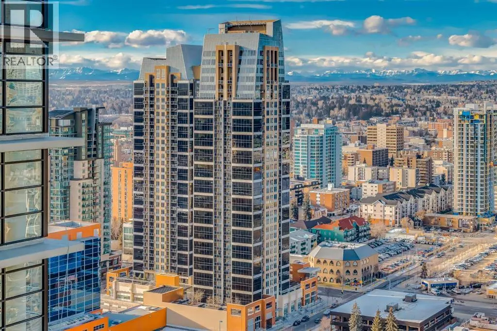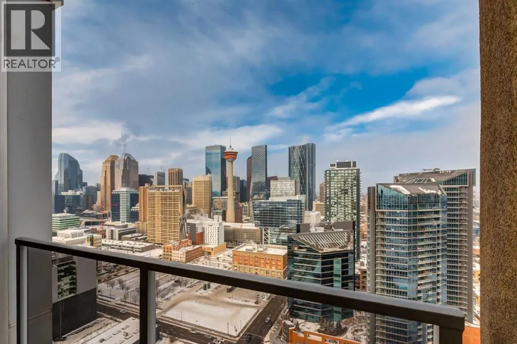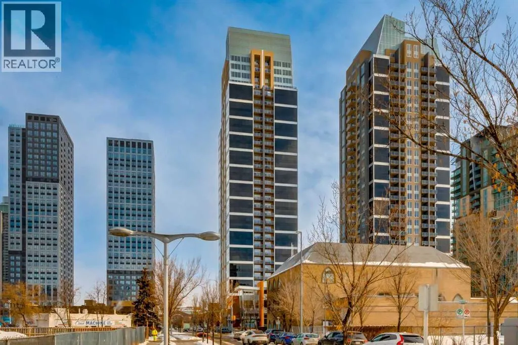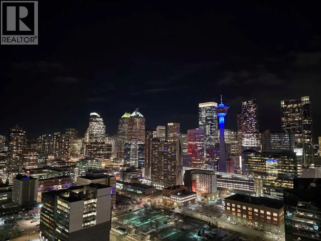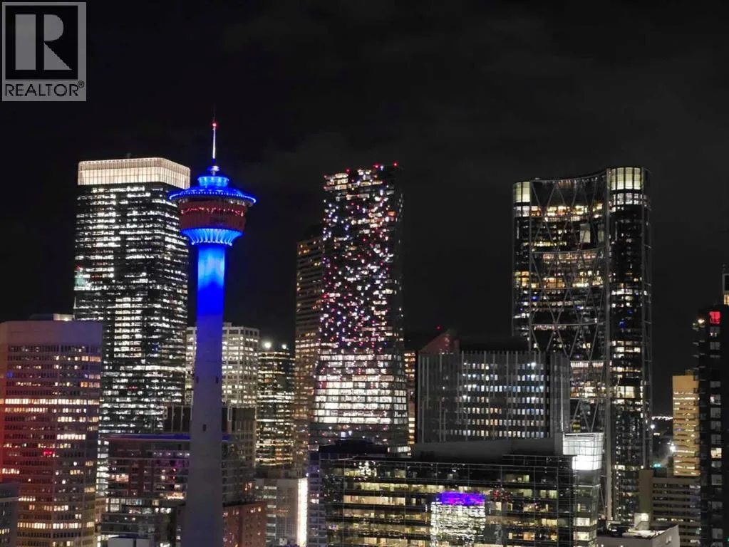 Spectacular Downtown Skyline Views from the 27th Floor! Welcome to this stylish 1-bedroom, 1-bathroom condo offering 589 sq. ft. of modern living space in the desirable Nuera building. Perched on the 27th floor, this home showcases breathtaking 180-degree downtown skyline views, including the Calgary Tower, through stunning floor-to-ceiling windows. The open-concept layout is bright and functional, seamlessly connecting the living and dining areas. The contemporary kitchen features mocha-stained maple cabinetry, mosaic tile backsplash, under-cabinet lighting, and built-in dining table that doubles as a workspace. Step onto your private balcony to enjoy the vibrant city views, or wake up to the skyline from the spacious primary bedroom. Additional highlights include in-suite laundry, a storage locker, and a titled heated underground parking stall. Nuera offers a fully equipped fitness centre and smart HVAC air circulation technology. Ideally located steps from downtown, the BMO Centre, LRT, and the shops and restaurants of 17th Avenue, this home delivers the ultimate inner-city lifestyle. (id:27476)