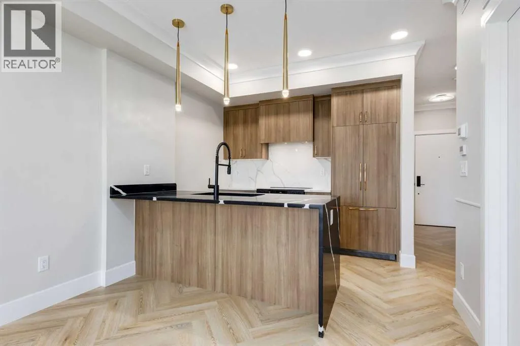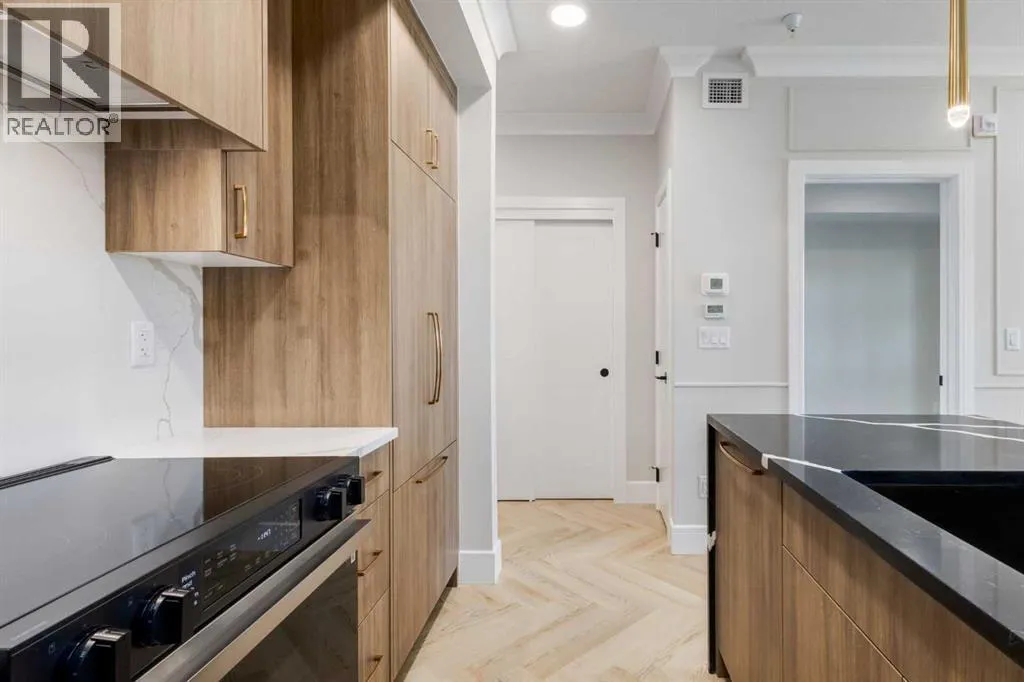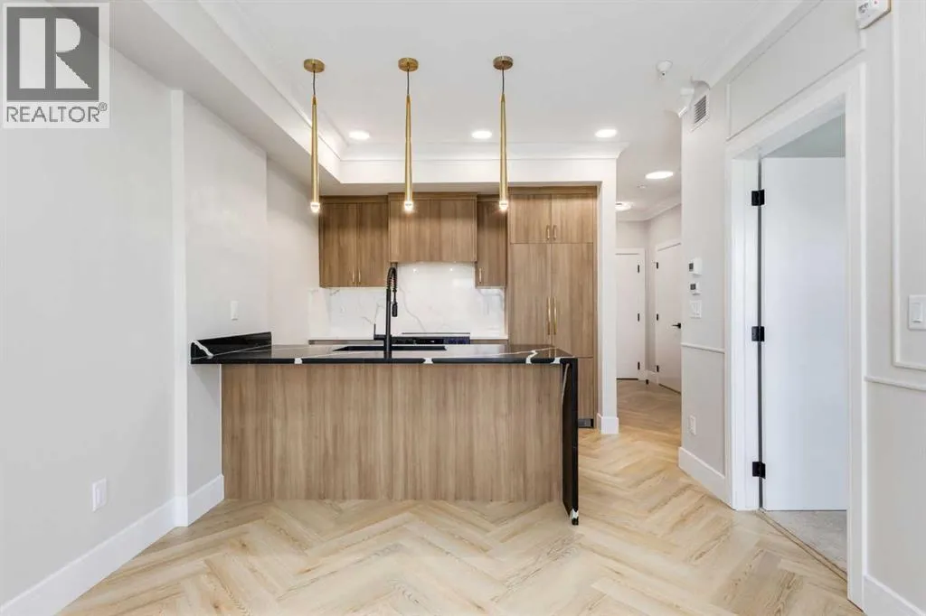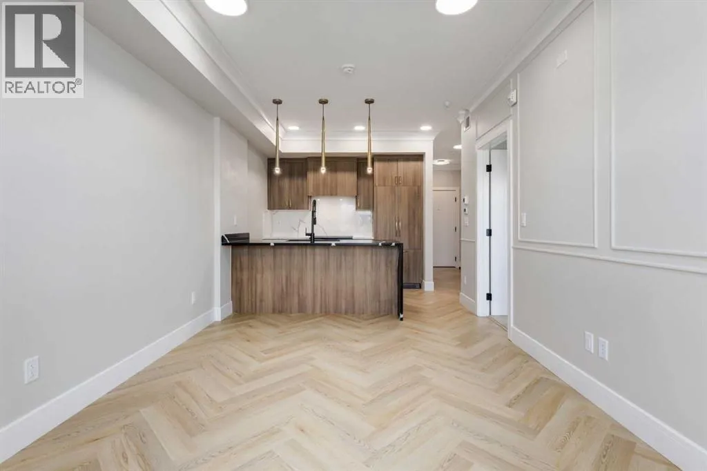 Welcome to the “Verde” floorplan by Rohit Homes—a thoughtfully designed 1-bedroom + den, 1-bathroom residence that perfectly balances comfort and style. Ideally situated on the 5th floor of Quesnay at Currie Barracks, this elevated home offers enhanced privacy along with beautiful natural light and west-facing views.Finished in the timeless Neoclassical Revival color palette, the interior showcases warm, refined tones and elegant detailing that create a sophisticated yet inviting atmosphere. The Verde floorplan is designed with both aesthetics and practicality in mind, featuring 9’ ceilings, quartz countertops with a waterfall edge, a coordinating quartz backsplash, full-height cabinetry, stainless steel appliances, designer light fixtures, and window coverings.The open-concept layout seamlessly connects the kitchen, dining, and living areas, making the space feel bright and expansive—perfect for entertaining or quiet evenings at home. The primary bedroom serves as a relaxing retreat, while the versatile den provides flexibility for a home office, study space, or additional storage. The bathroom offers a spa-inspired feel with fully tiled walls, polished finishes, and a tub/shower combination.Step outside onto your private west-facing balcony to enjoy sunset views and fresh air from your 5th-floor vantage point.This pet-friendly and AIRBNB-friendly building includes titled heated underground parking and ample visitor parking. Located just minutes from downtown, Mount Royal University, and the vibrant amenities of 17th Ave and Marda Loop, the Verde floorplan offers exceptional urban convenience paired with refined design.Don’t miss your opportunity to own this beautifully finished 5th-floor home.**Photos are taken from existing buildings of the same models and are not of the exact unit.** (id:27476)